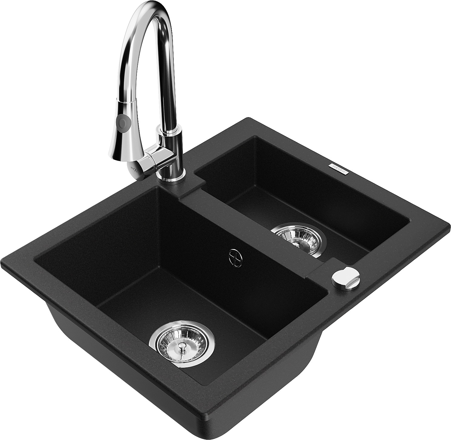 Mexen Carlos granitinė pristatoma kriauklė su 1,5 skyriumi ir Elia virtuviniu maišytuvu, juoda - 6518-77-670101-00