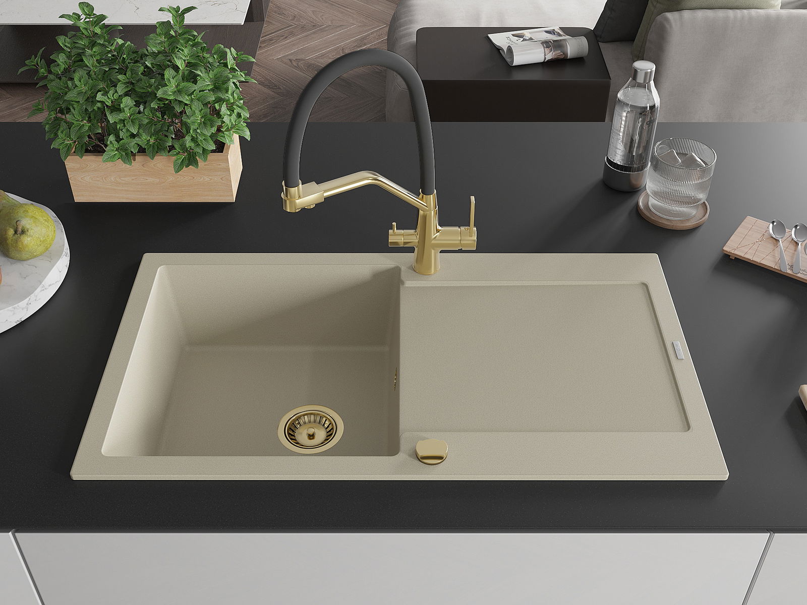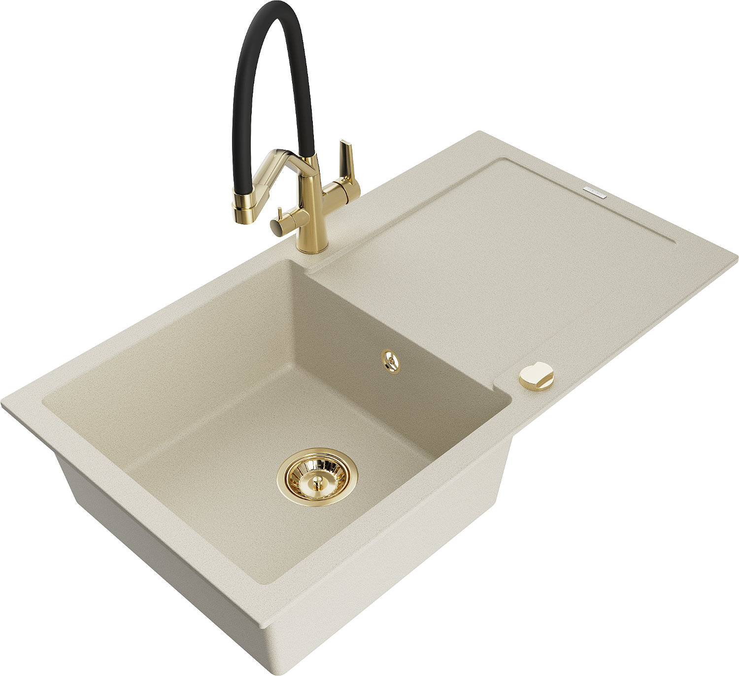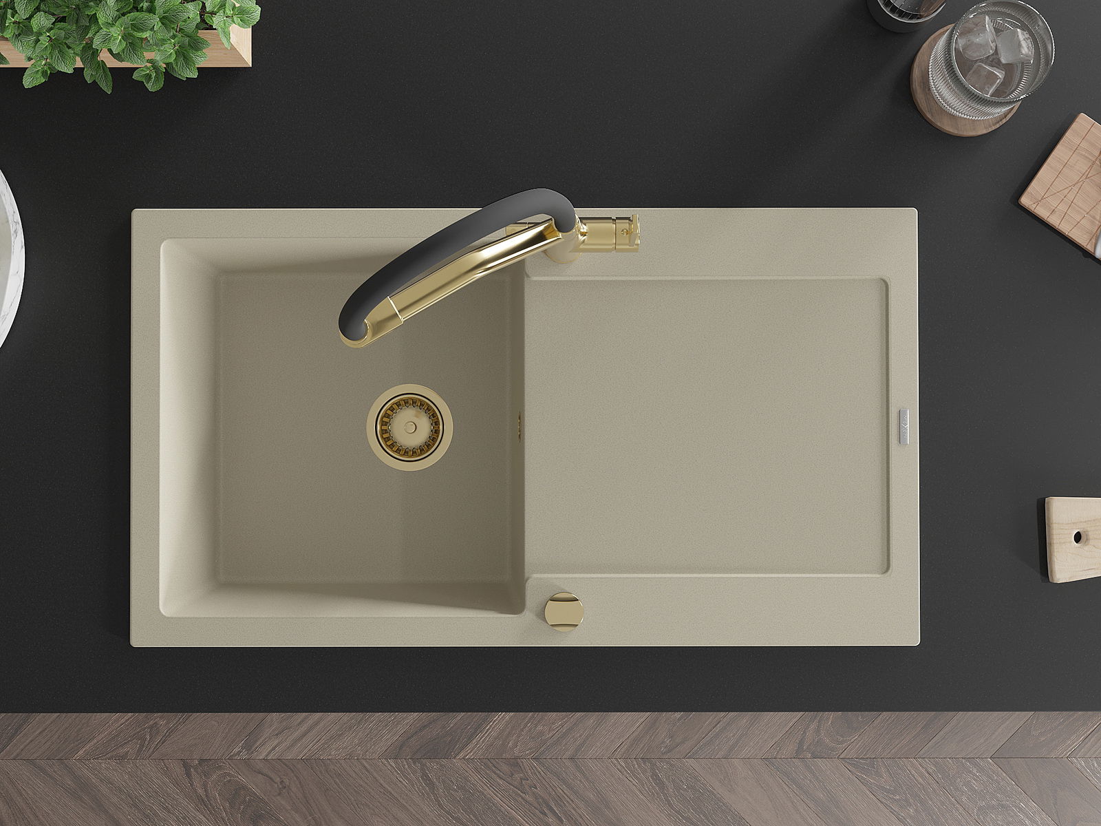 Mexen Leo granitinis vienos dubenės kriauklė su nuotaku ir virtuviniu maišytuvu Duo, smėlinis - 6501-69-671701-57-G
