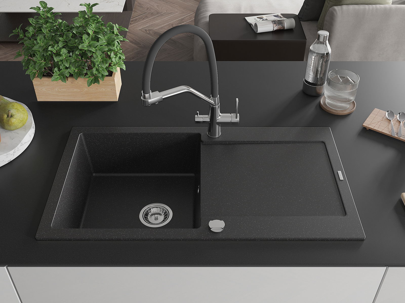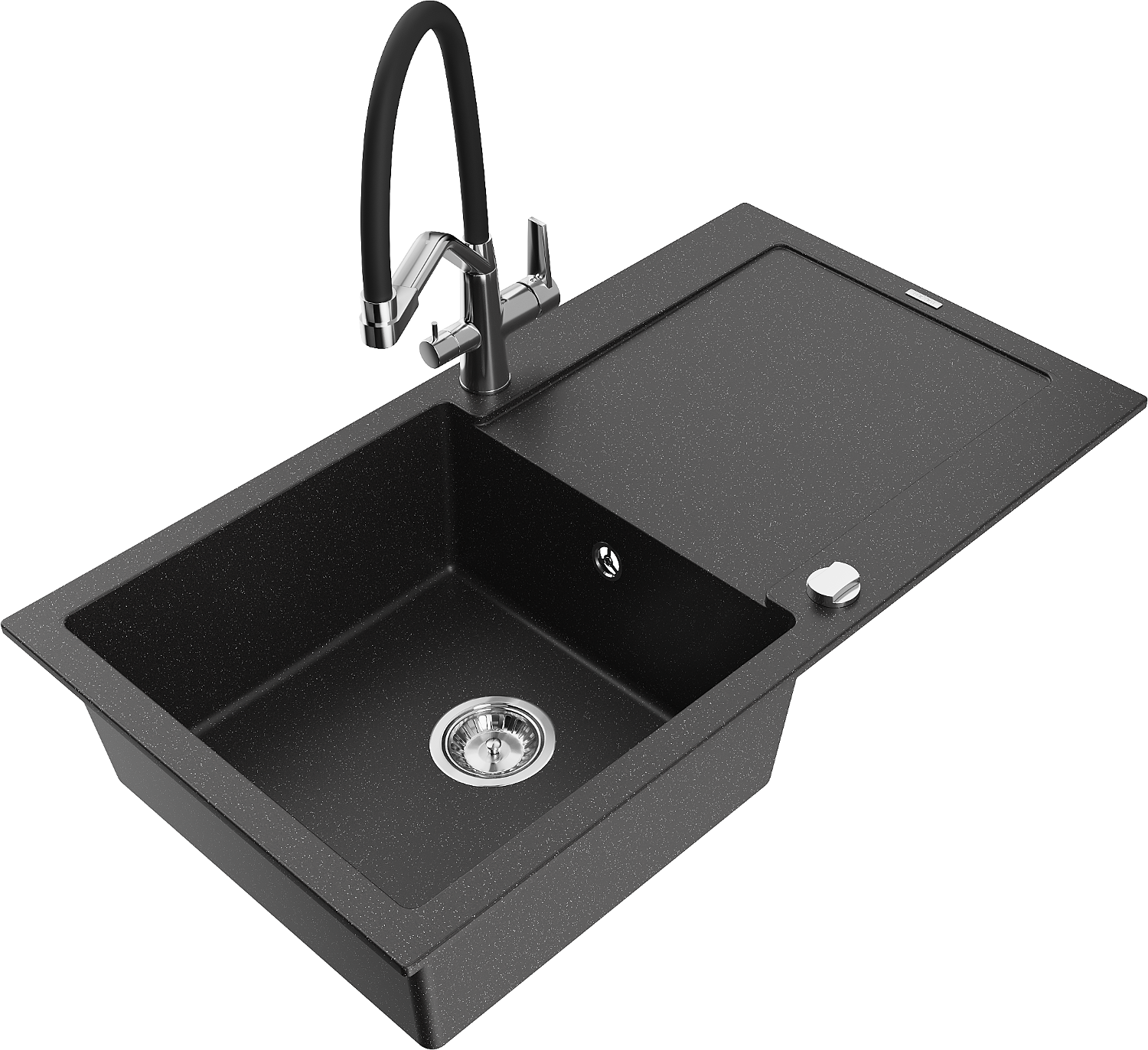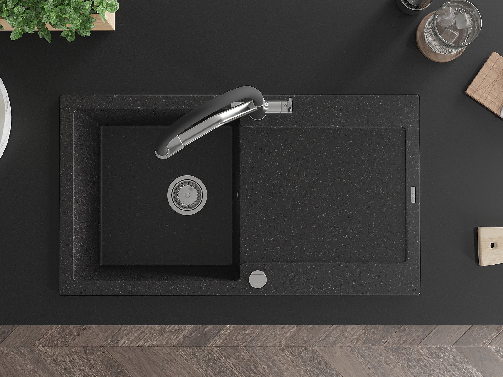 Mexen Leo vienos kamerų granitinė kriauklė su nusausinimo zona ir Duo virtuviniu maišytuvu, juoda/sidabrinis metalikas