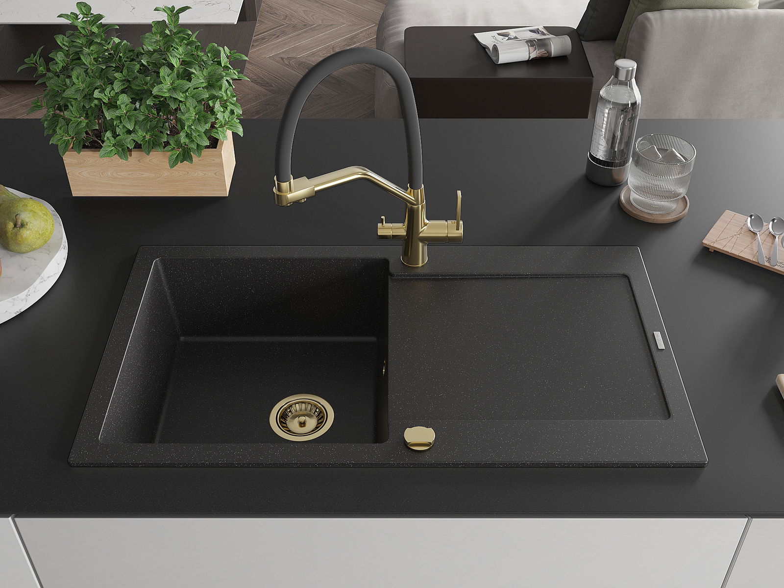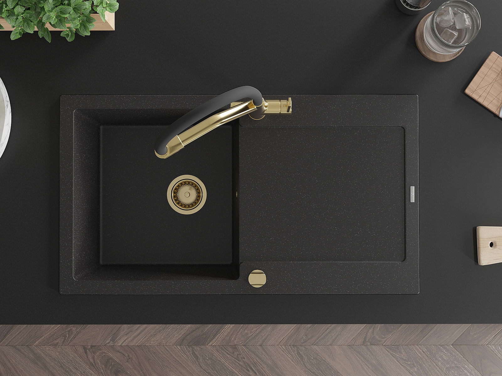 Mexen Leo granito plautuvė su 1 kamera, lašėjimu ir Duo virtuviniu maišytuvu, juoda/sidabrinė metaliko spalva