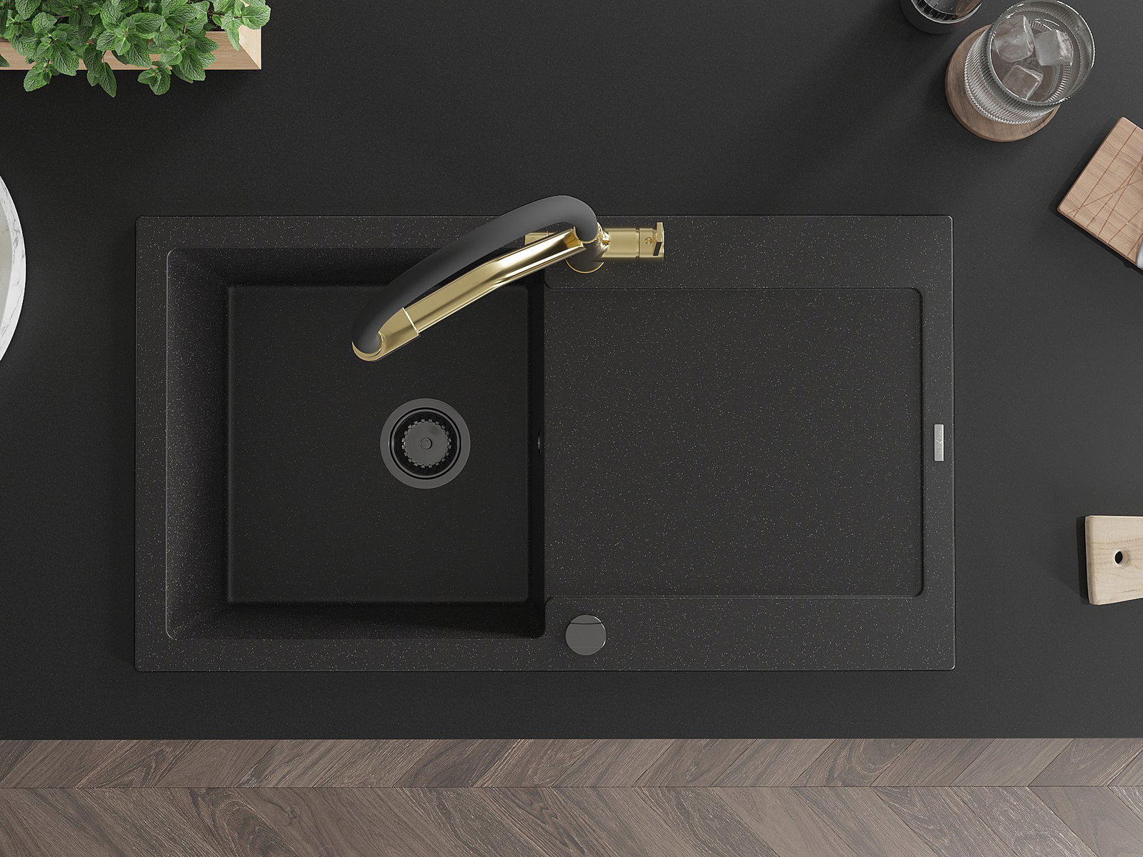 Mexen Leo granitinė vienos dalies kriauklė su nutekamąja dalimi ir virtuviniu maišytuvu Duo, juoda/sidabrinė metalikas