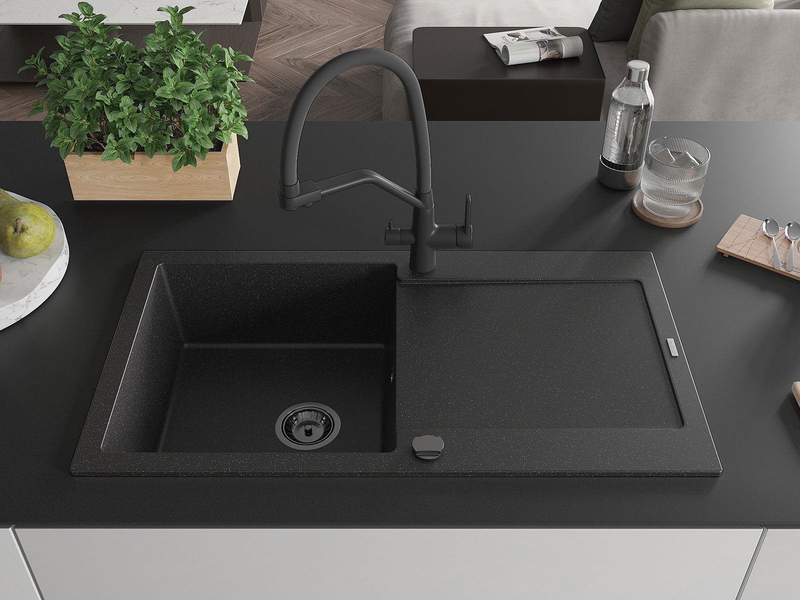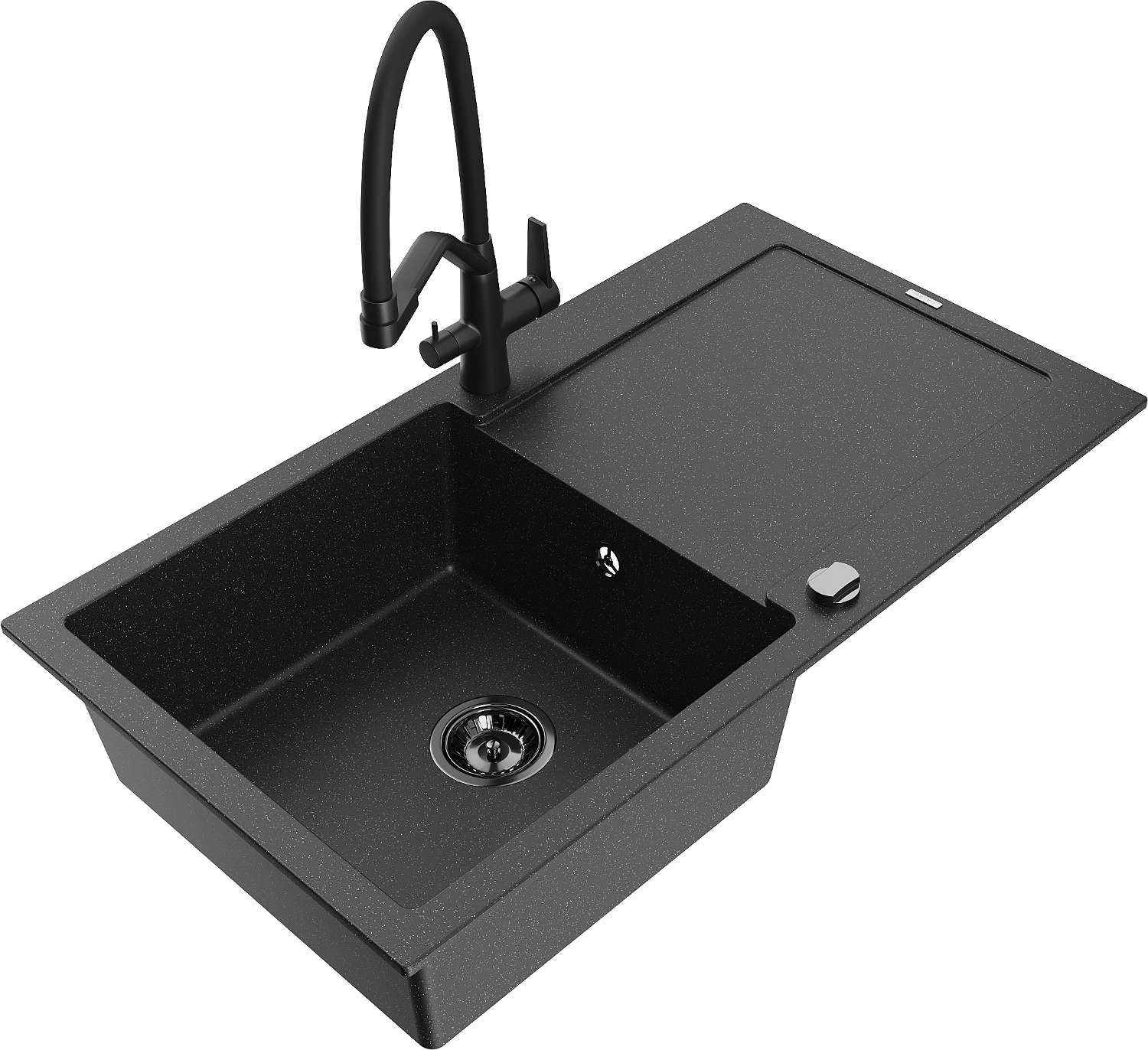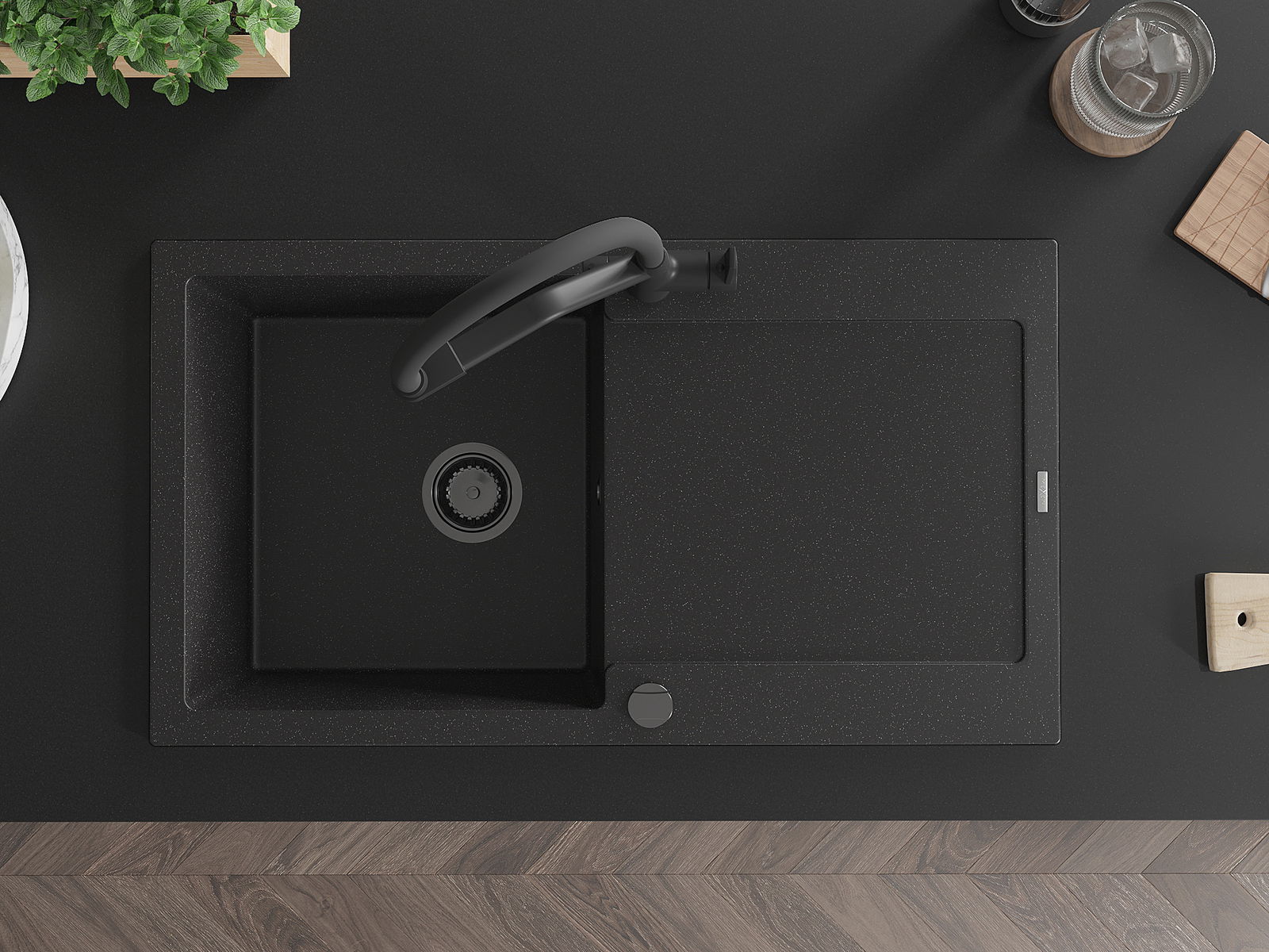 Mexen Leo granitinė vienos kameros plautuvė su nuvarvėtuvu ir virtuviniu maišytuvu Duo, juoda/sidabrinis metalikas