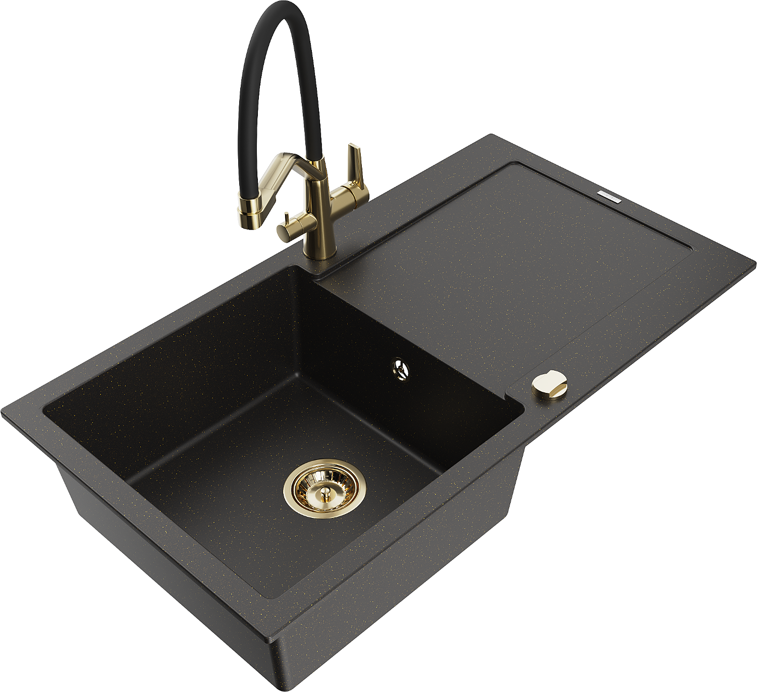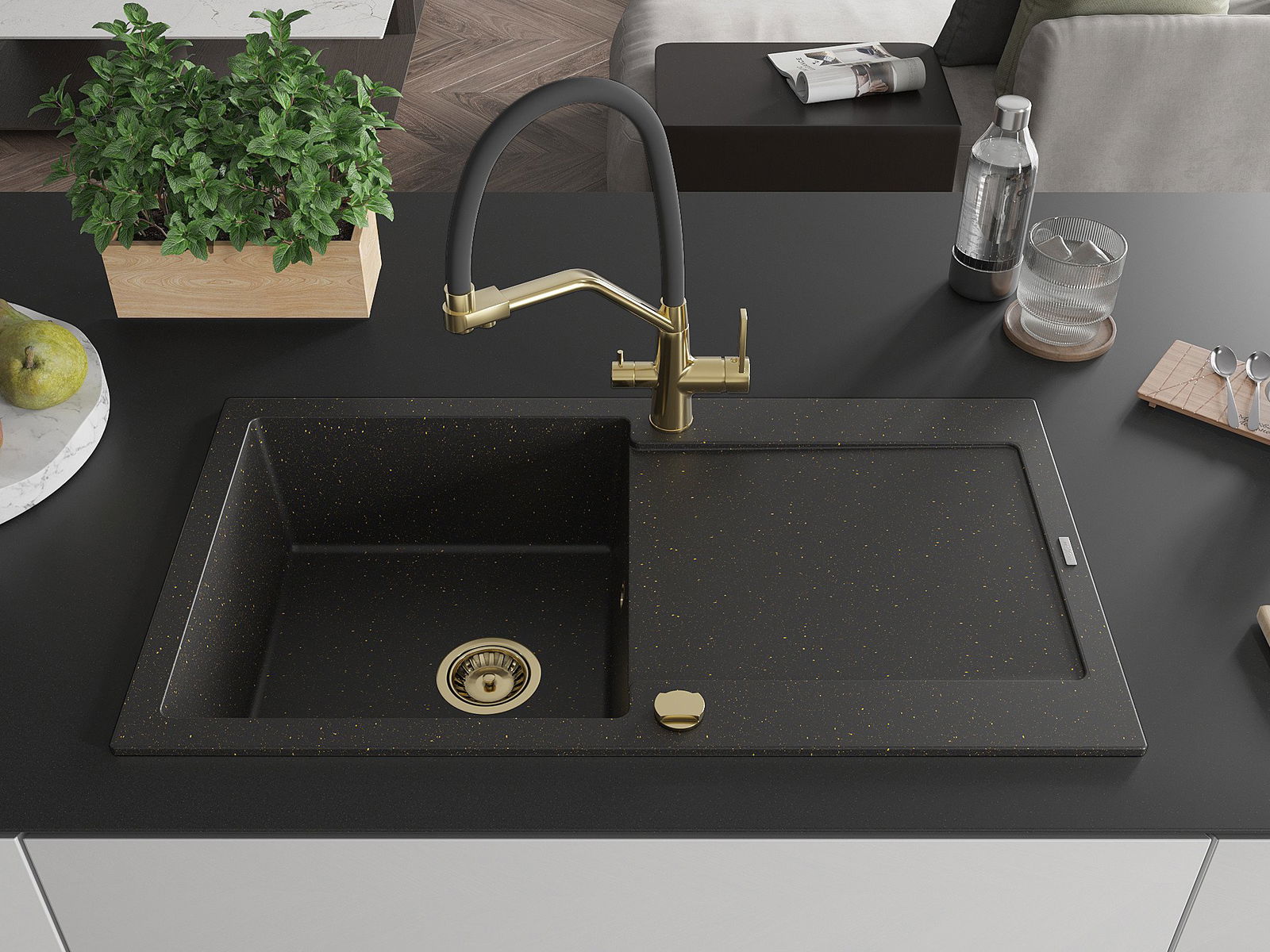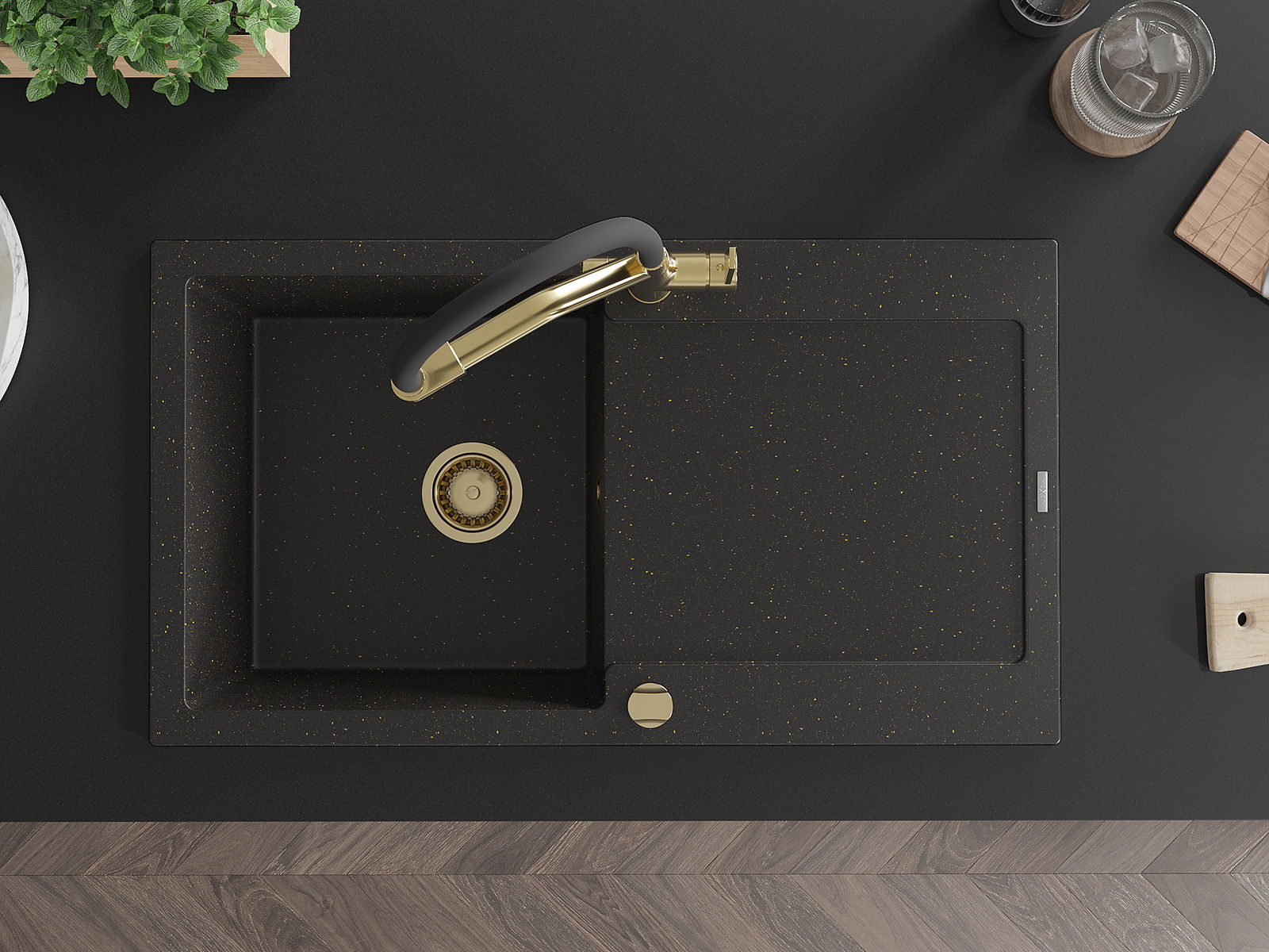 Mexen Leo granitinė vienos kameros kriauklė su vandens nuvedimo įrenginiu ir virtuvės maišytuvu Duo, juoda/auksinis