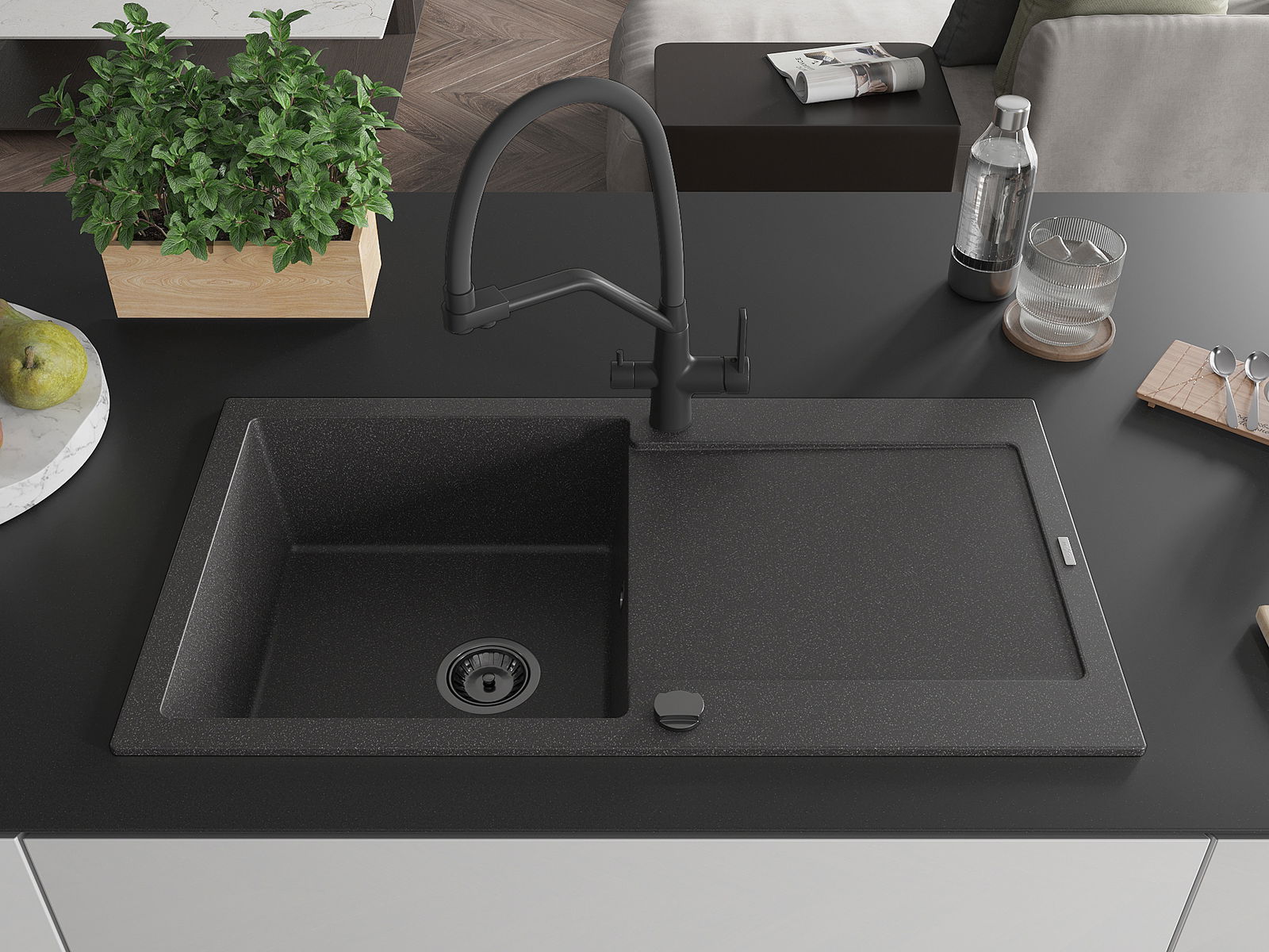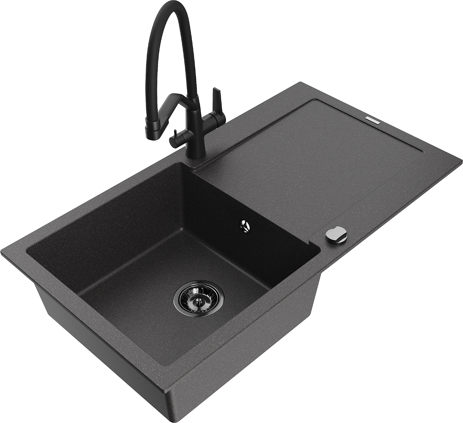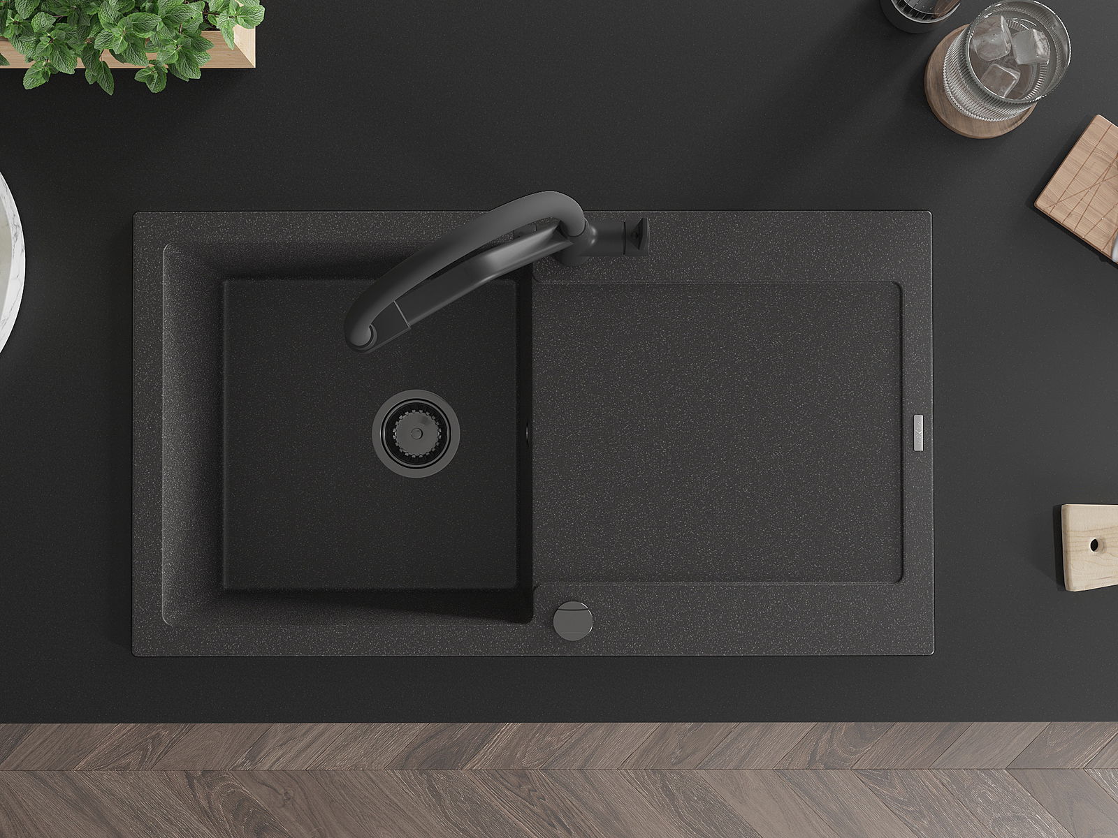 Mexen Leo granitinė vienos kameros kriauklė su nusausinimo lentele ir Duo virtuvės maišytuvu, juodas dėmėtas