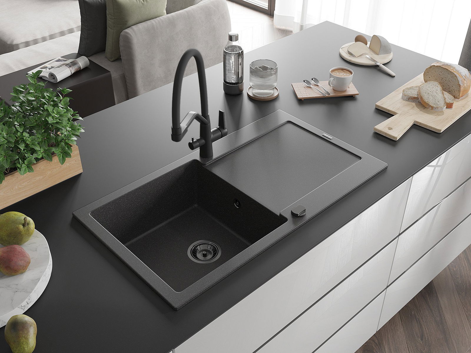 Mexen Leo granitinis virtuvinis plautuvas 1-dubenimis su nusausintuvu ir virtuvės maišytuvu Duo, juodas taškuotas - 6501-76-671?