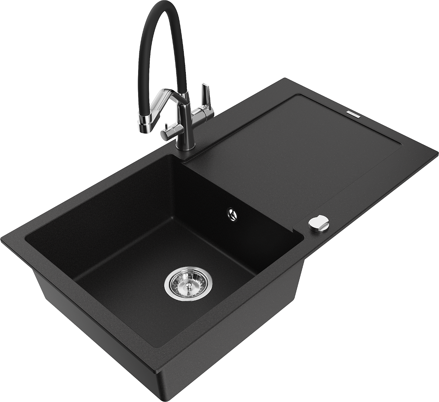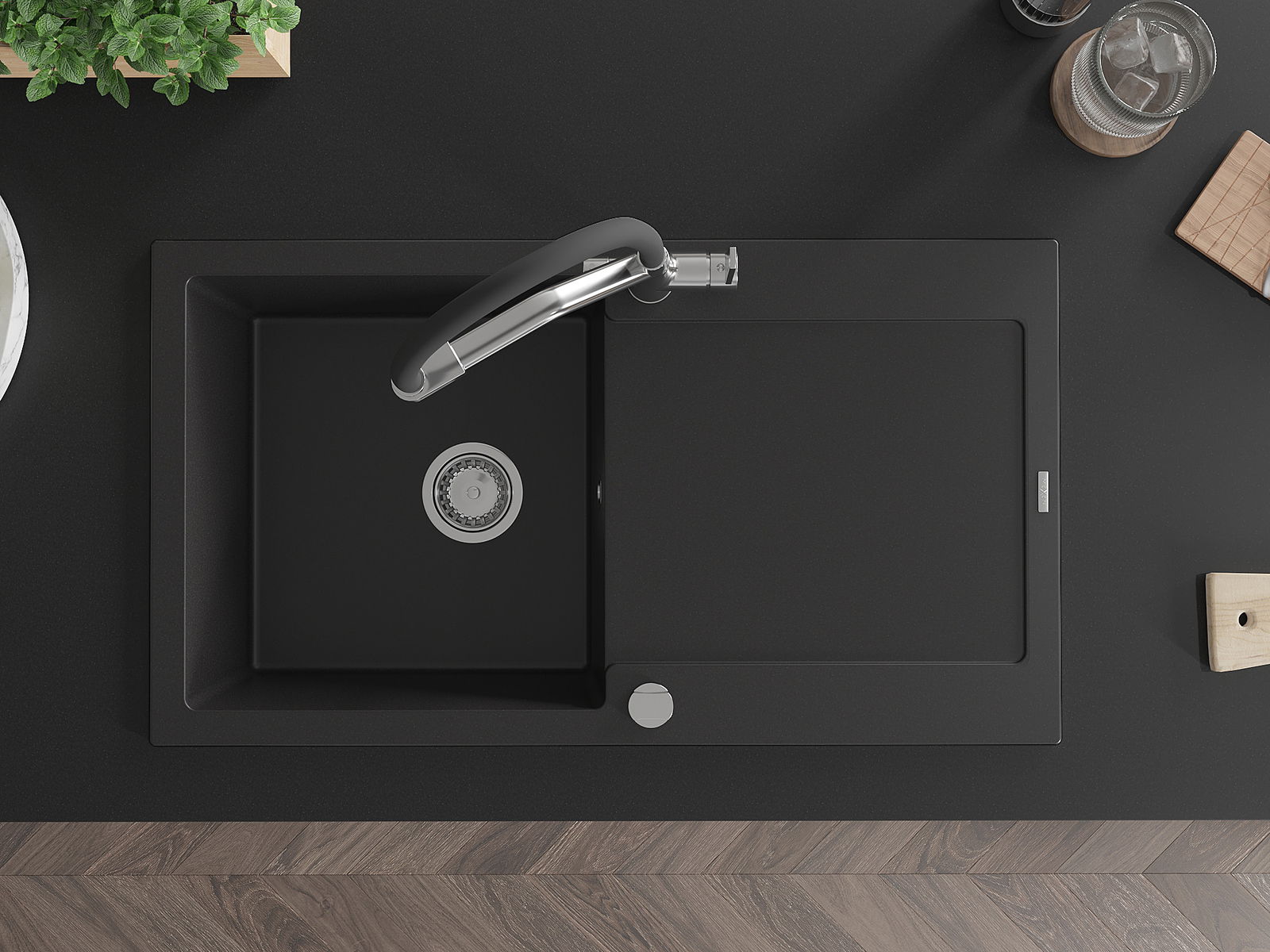 Mexen Leo granito plautuvė vienos kameros su nusausintuvu ir virtuviniu maišytuvu Duo, juoda - 6501-77-671701-07
