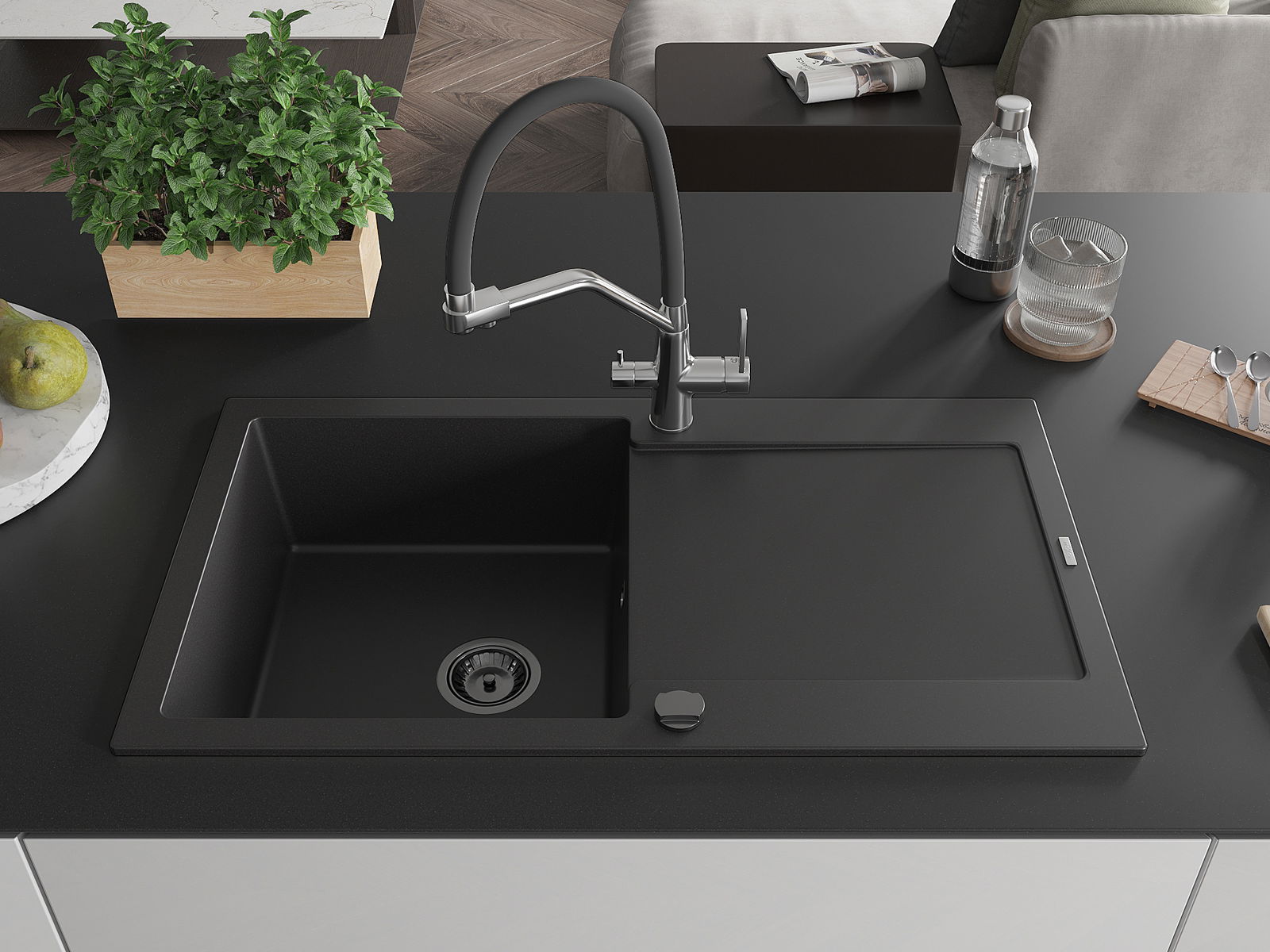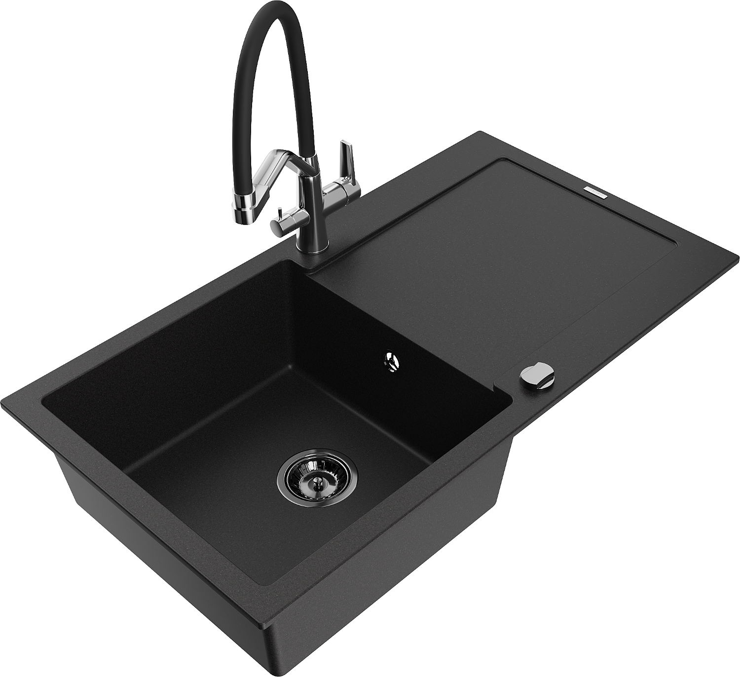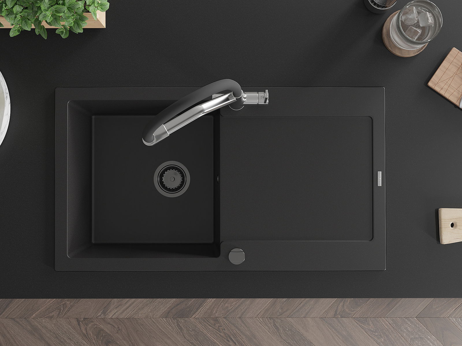 Mexen Leo granitinė 1 skyrelio plautuvė su nusausintuvu ir Duo virtuviniu maišytuvu, juoda - 6501-77-671701-07-B