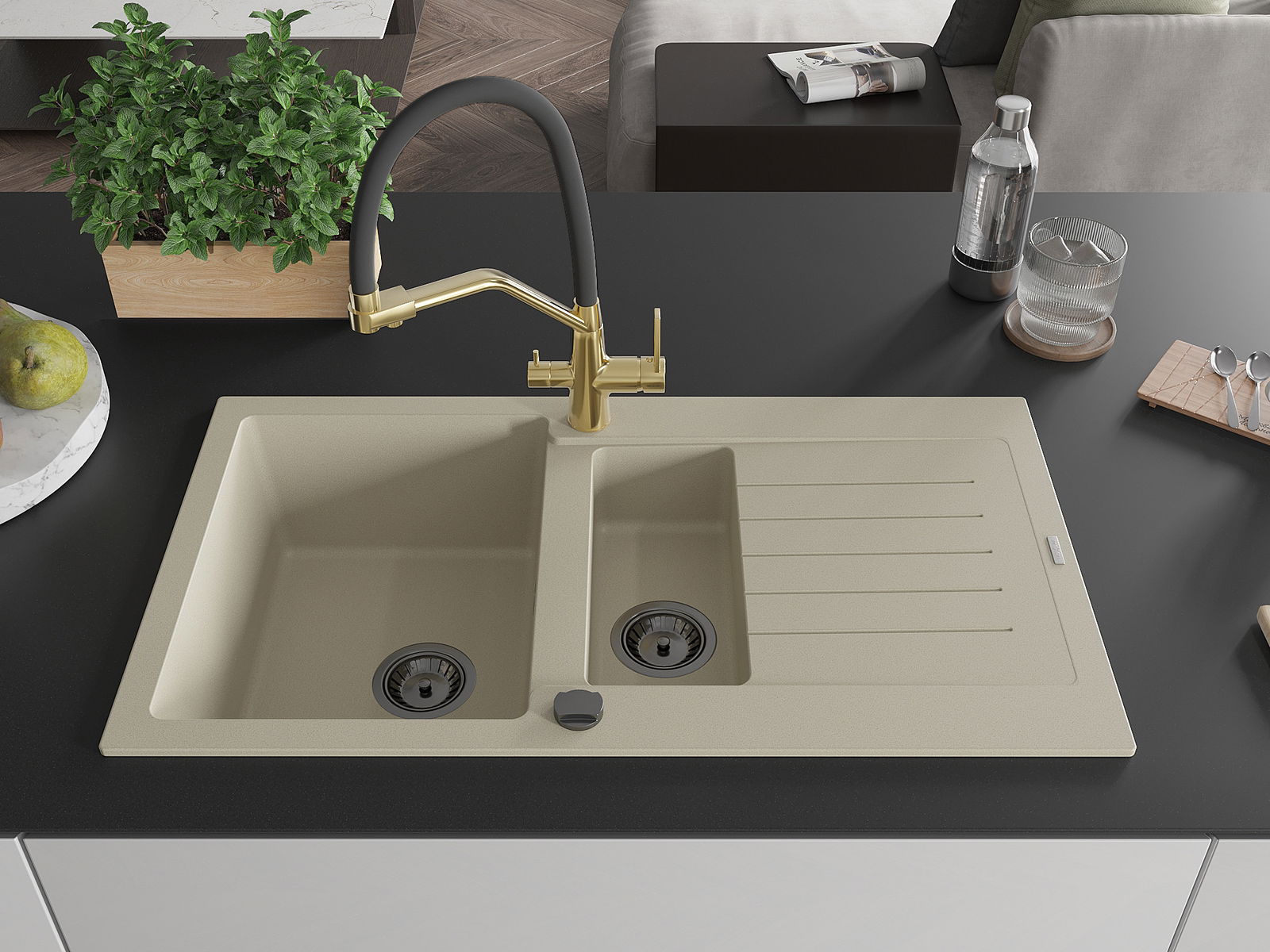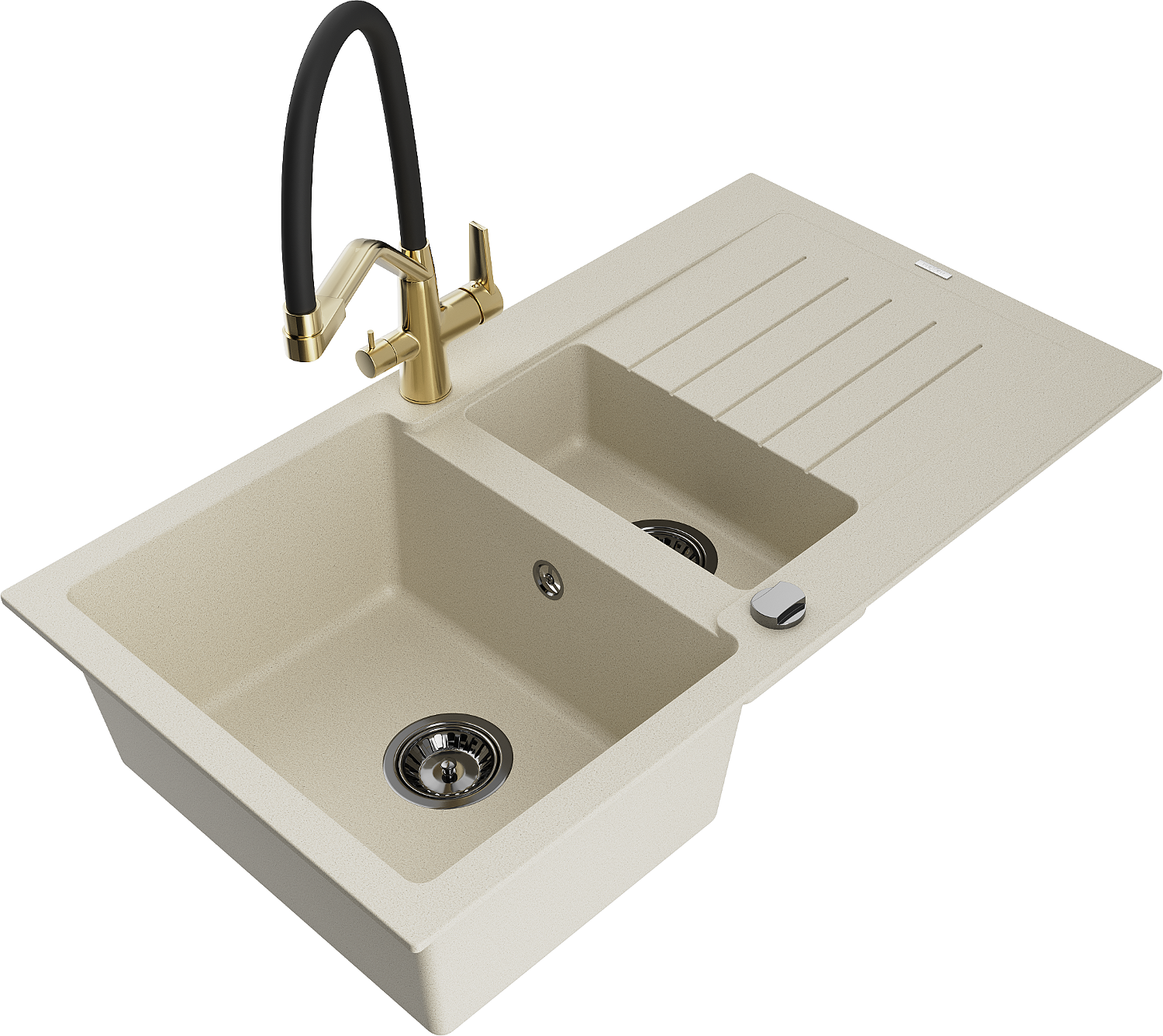 Mexen Matias granitinis plautuvė su 1,5 kameromis ir džiovyklėmis, bei Duo virtuviniu maišytuvu, smėlinis - 6502-69-671701-57-B