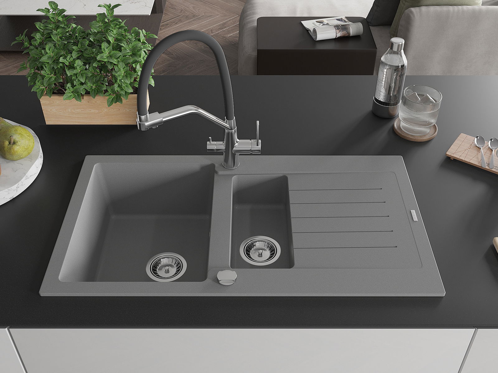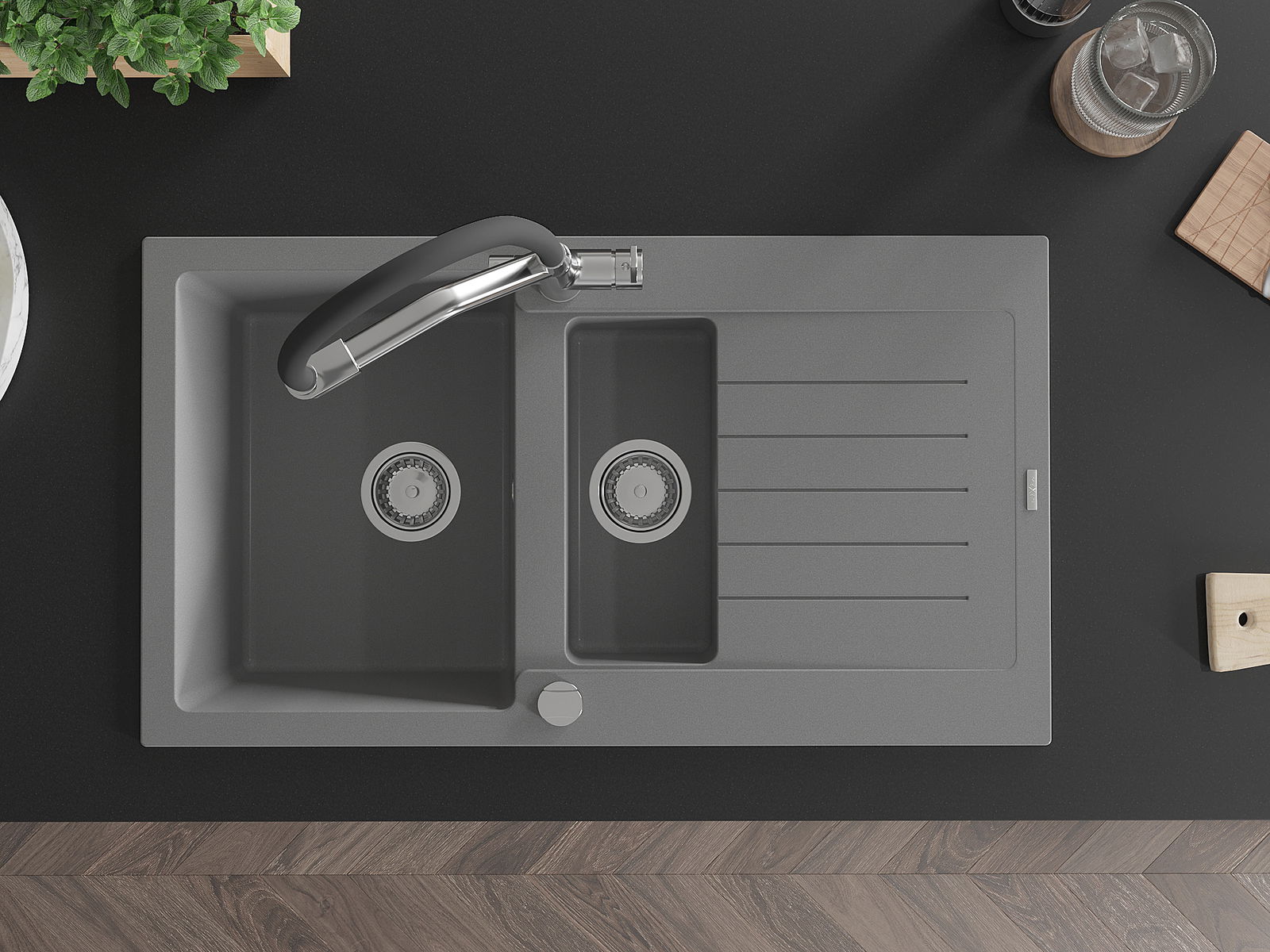 Mexen Matias granitinis virtuvės kriauklė 1,5 skyriumi su nusausikliu ir virtuviniu maišytuvu Duo, pilka - 6502-71-671701-07