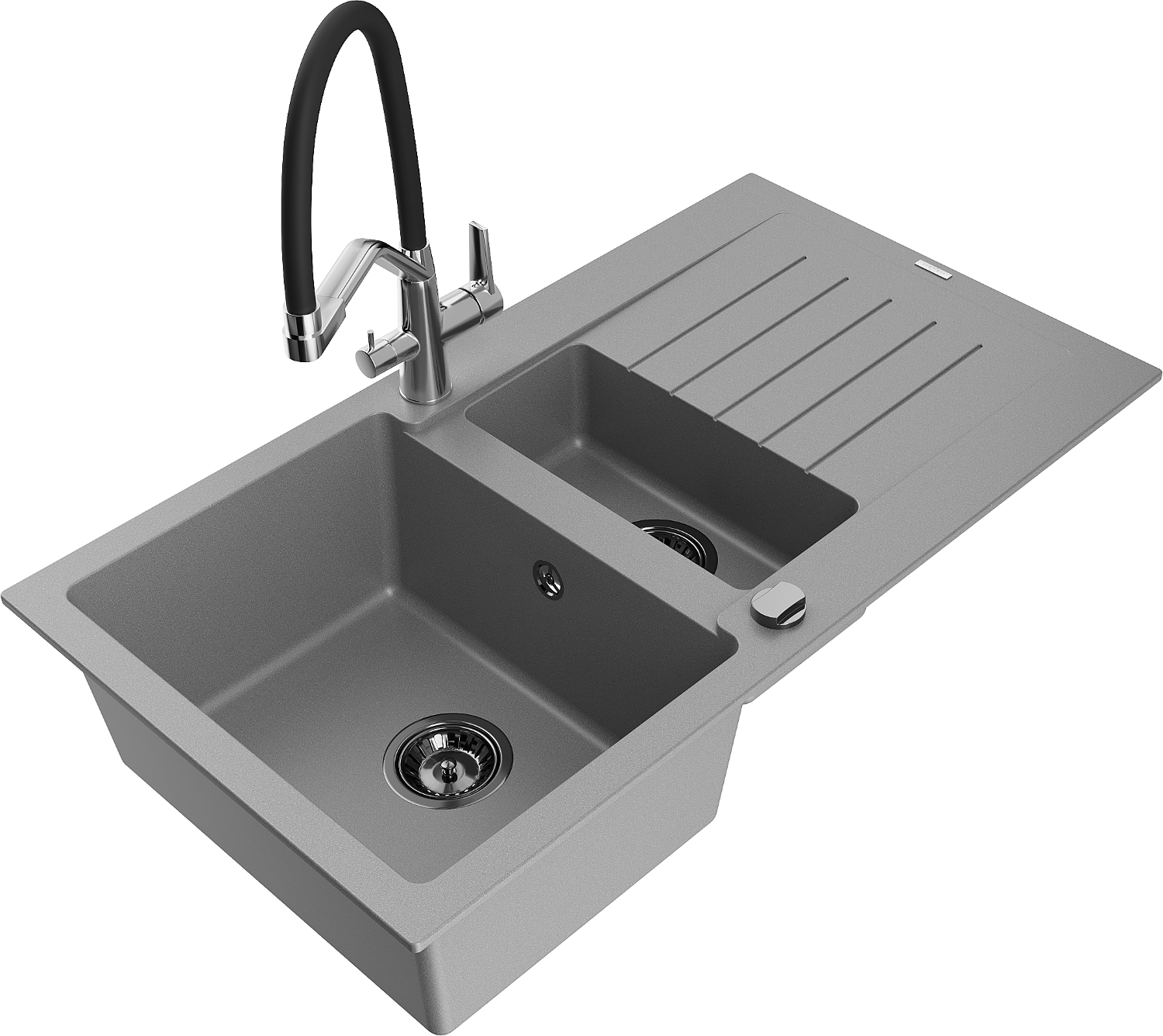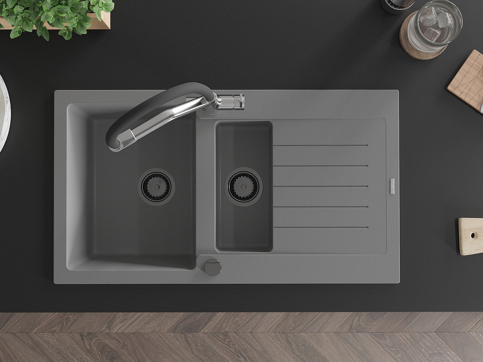Mexen Matias granito plautuvė 1,5 kamerų su nutekėjimu ir Duo virtuviniu maišytuvu, pilka - 6502-71-671701-07-B