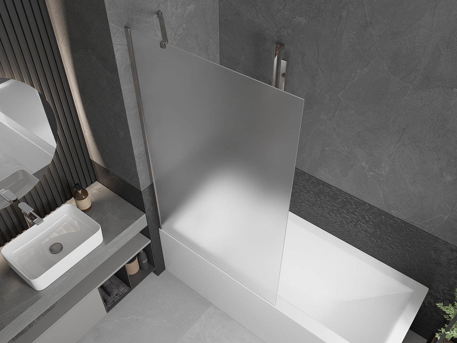 Veiksminga apsauga nuo vandens išsiliejimo maudymosi metu. Ekrane yra antspaudai, kurie puikiai prisitaiko prie stiklo stiklo ir vonios krašto. Funkcinis sprendimas, užtikrinantis saugumą ir lengvą priežiūrą.