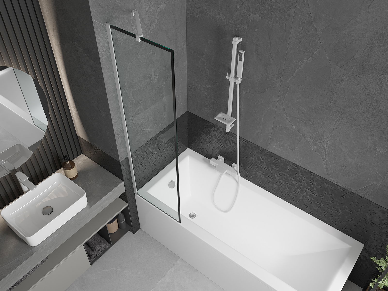 Veiksminga apsauga nuo vandens išsiliejimo maudymosi metu. Ekrane yra antspaudai, kurie puikiai prisitaiko prie stiklo stiklo ir vonios krašto. Funkcinis sprendimas, užtikrinantis saugumą ir lengvą priežiūrą.