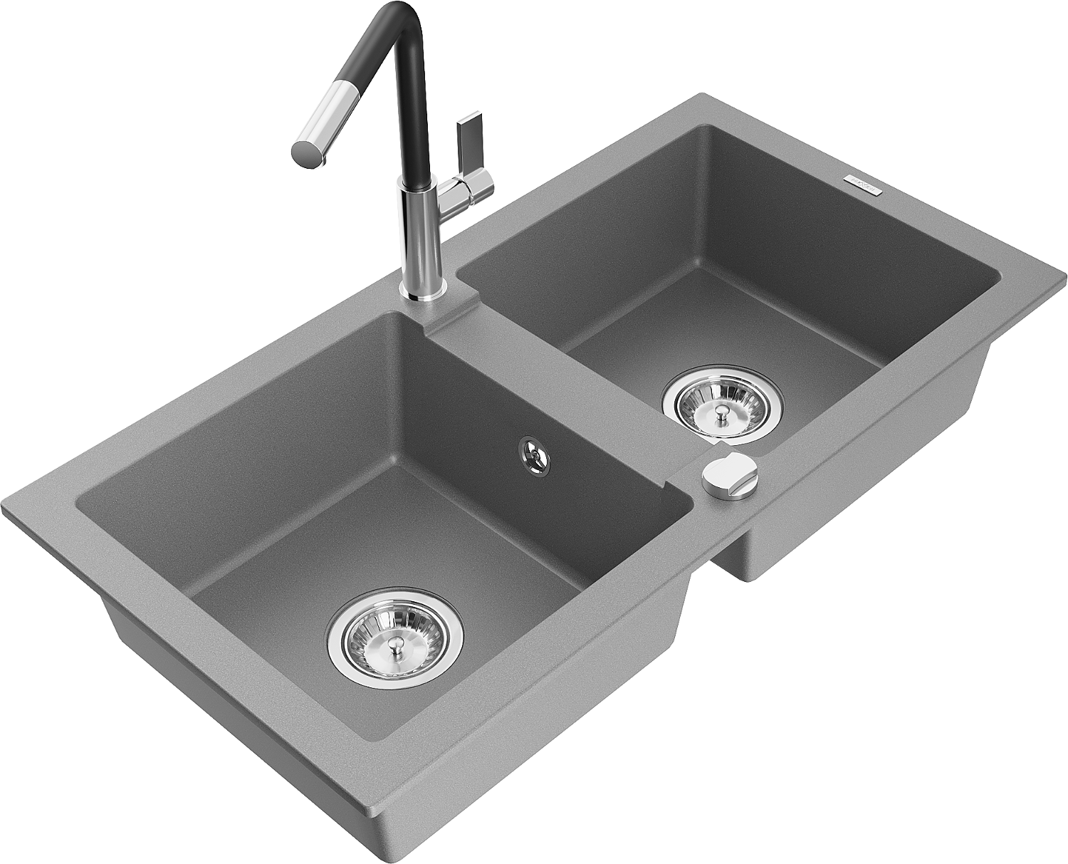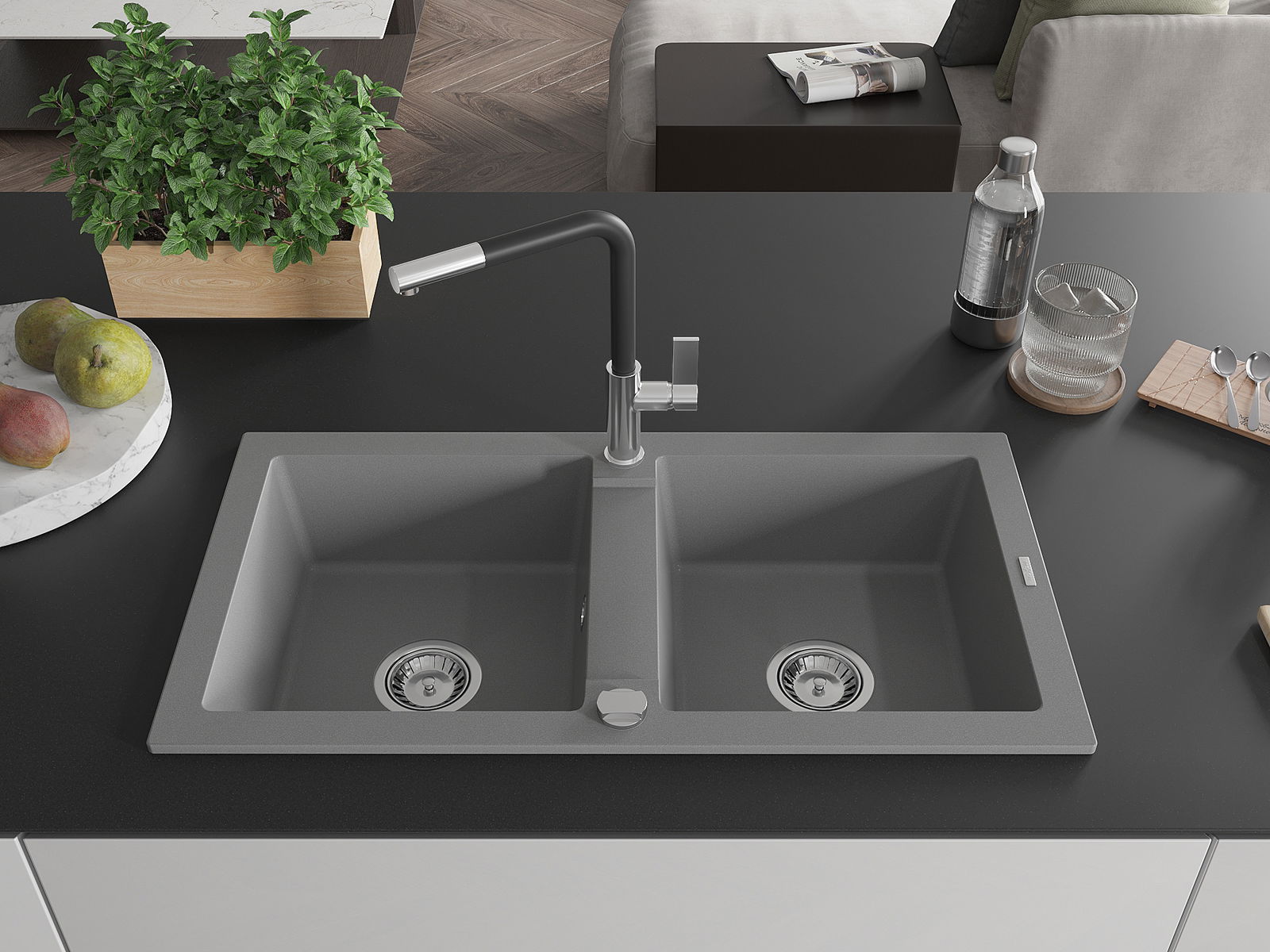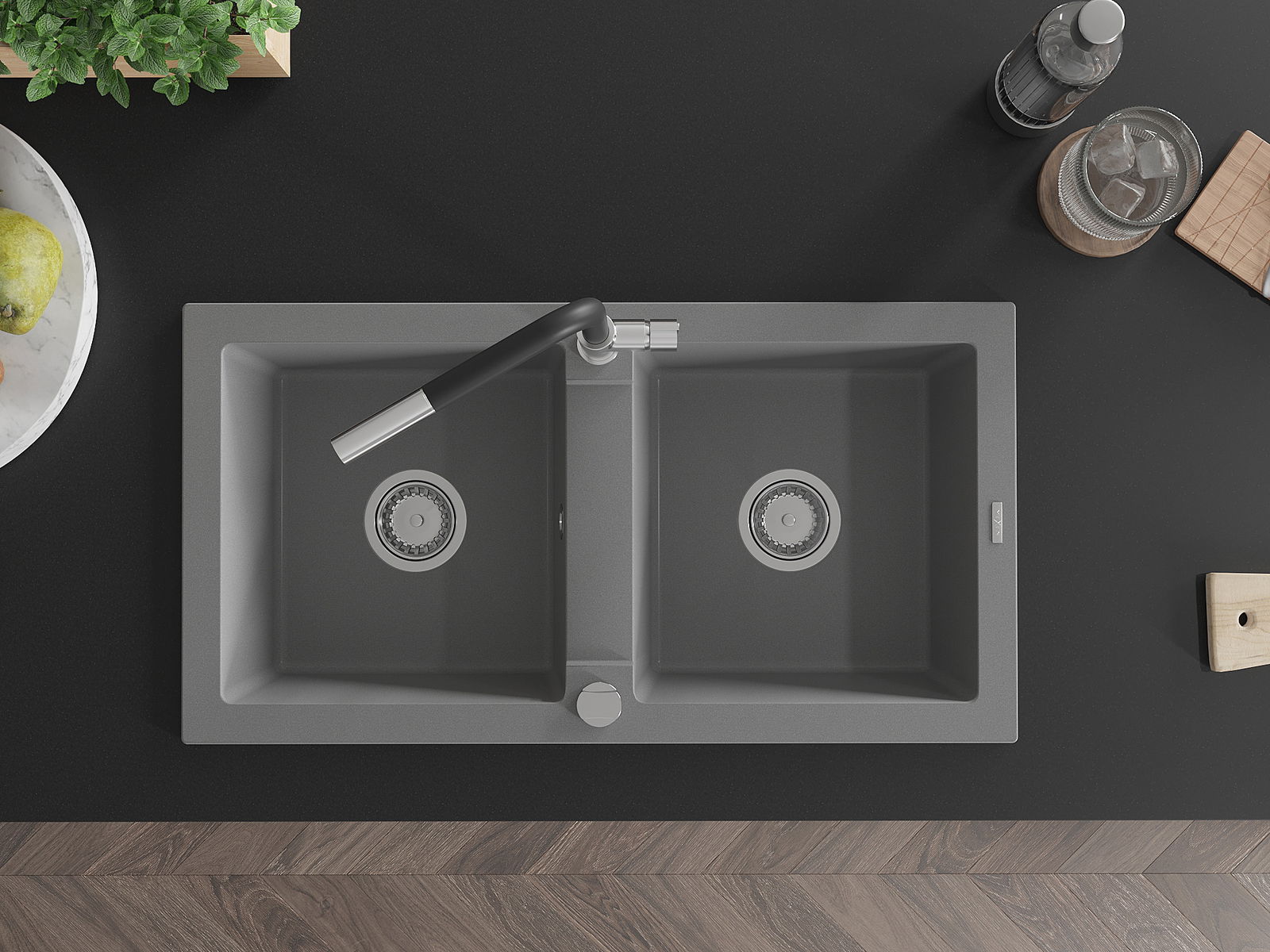 Mexen Mario granitinis 2-jų skylių virtuvės kriauklė su Flora virtuviniu maišytuvu, pilka - 6504-71-670401-07
