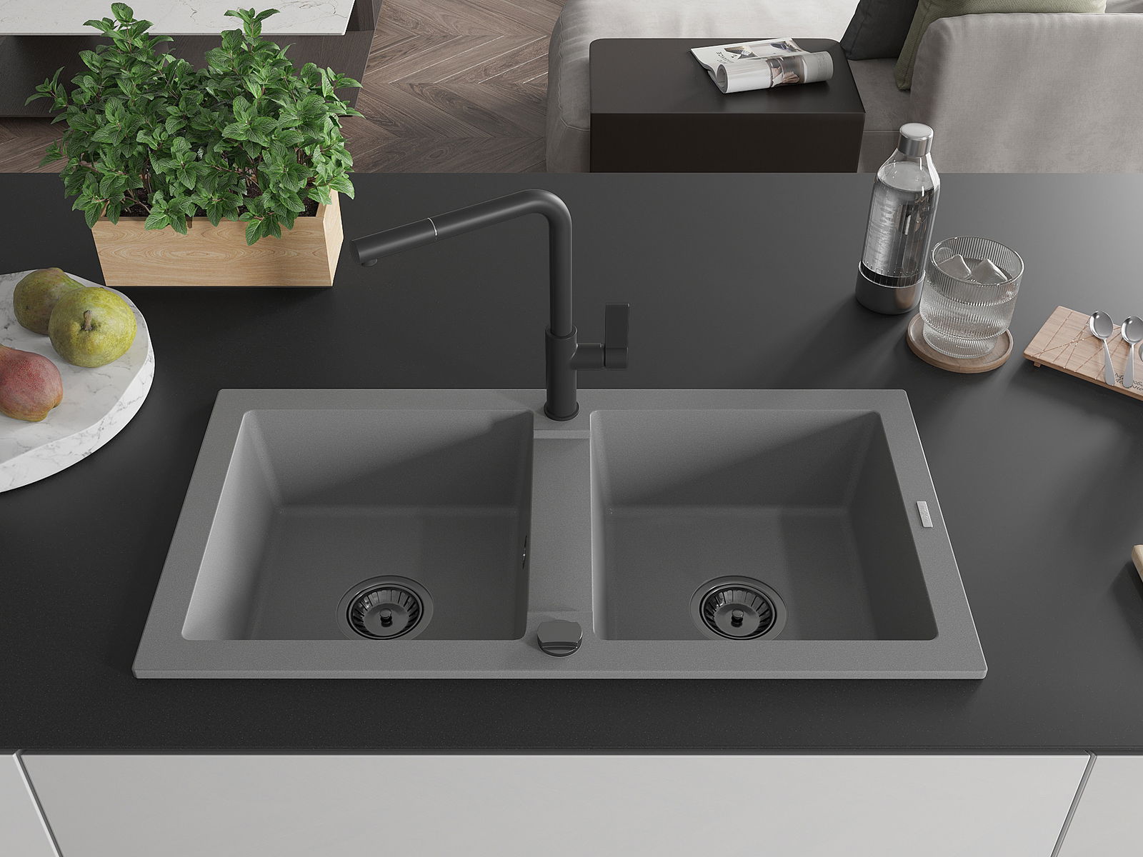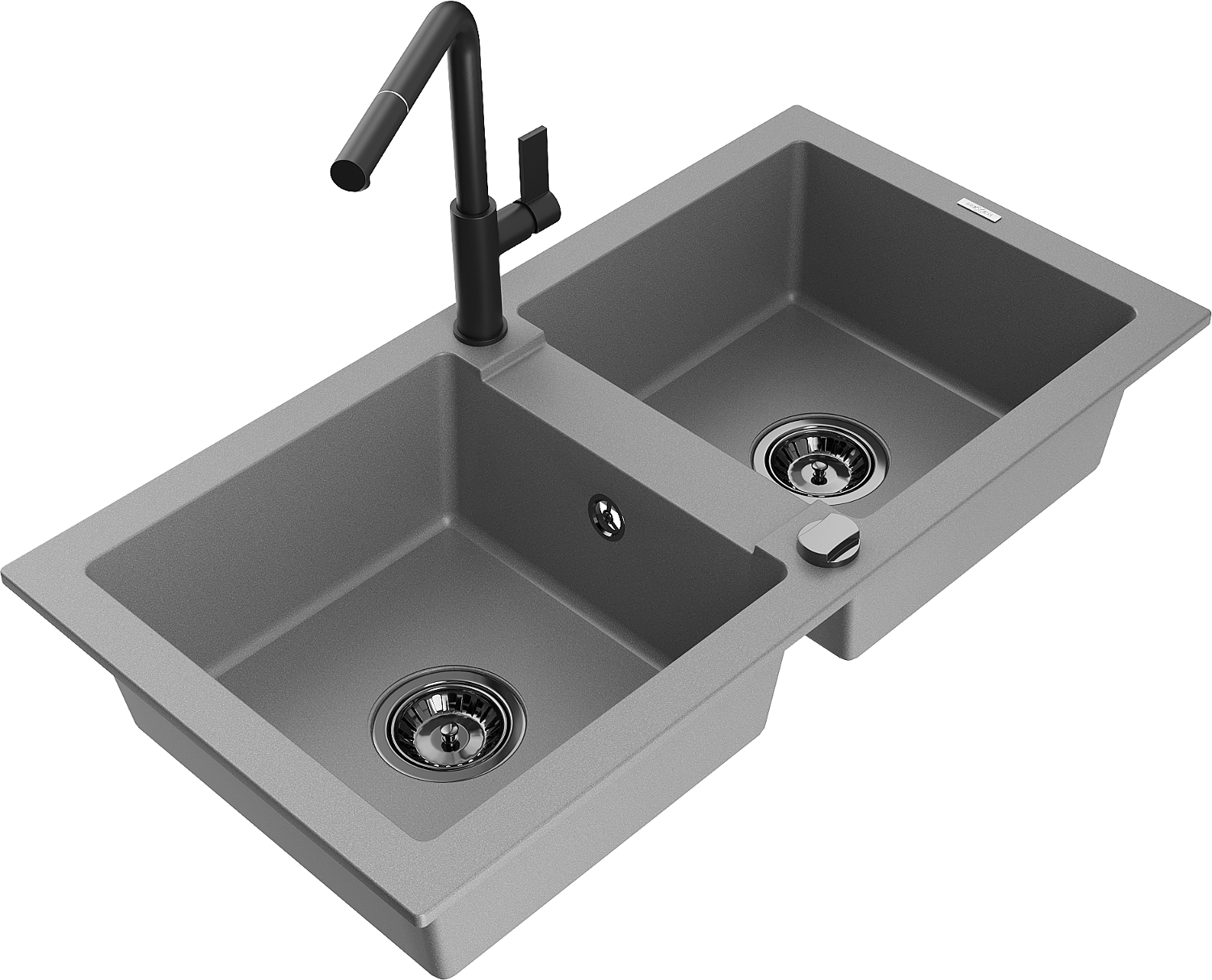 Mexen Mario 2 skyrių granito virtuvės plautuvė su Flora virtuvės maišytuvu, pilka - 6504-71-670401-70-B