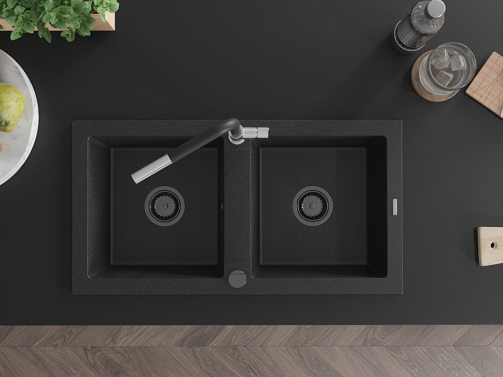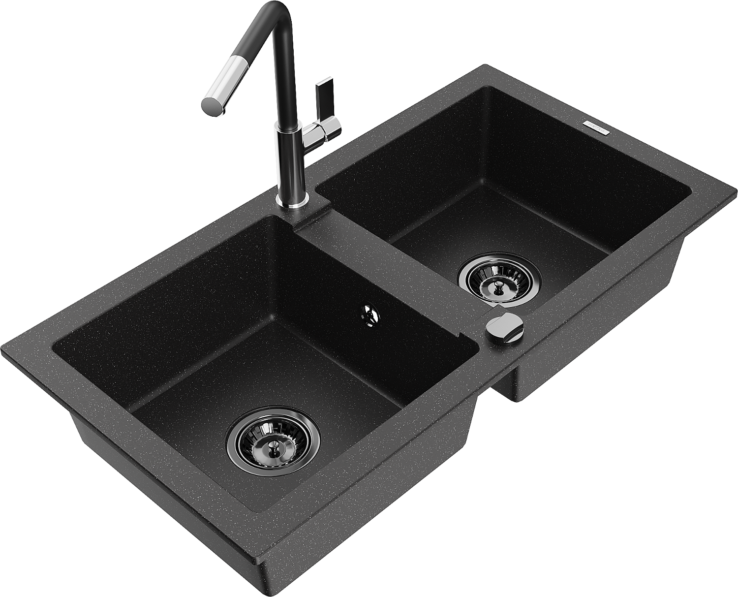 Mexen Mario granito plautuvė 2-jų kamerų su virtuviniu maišytuvu Flora, juoda/sidabro metalo spalva - 6504-73-670401-07-B
