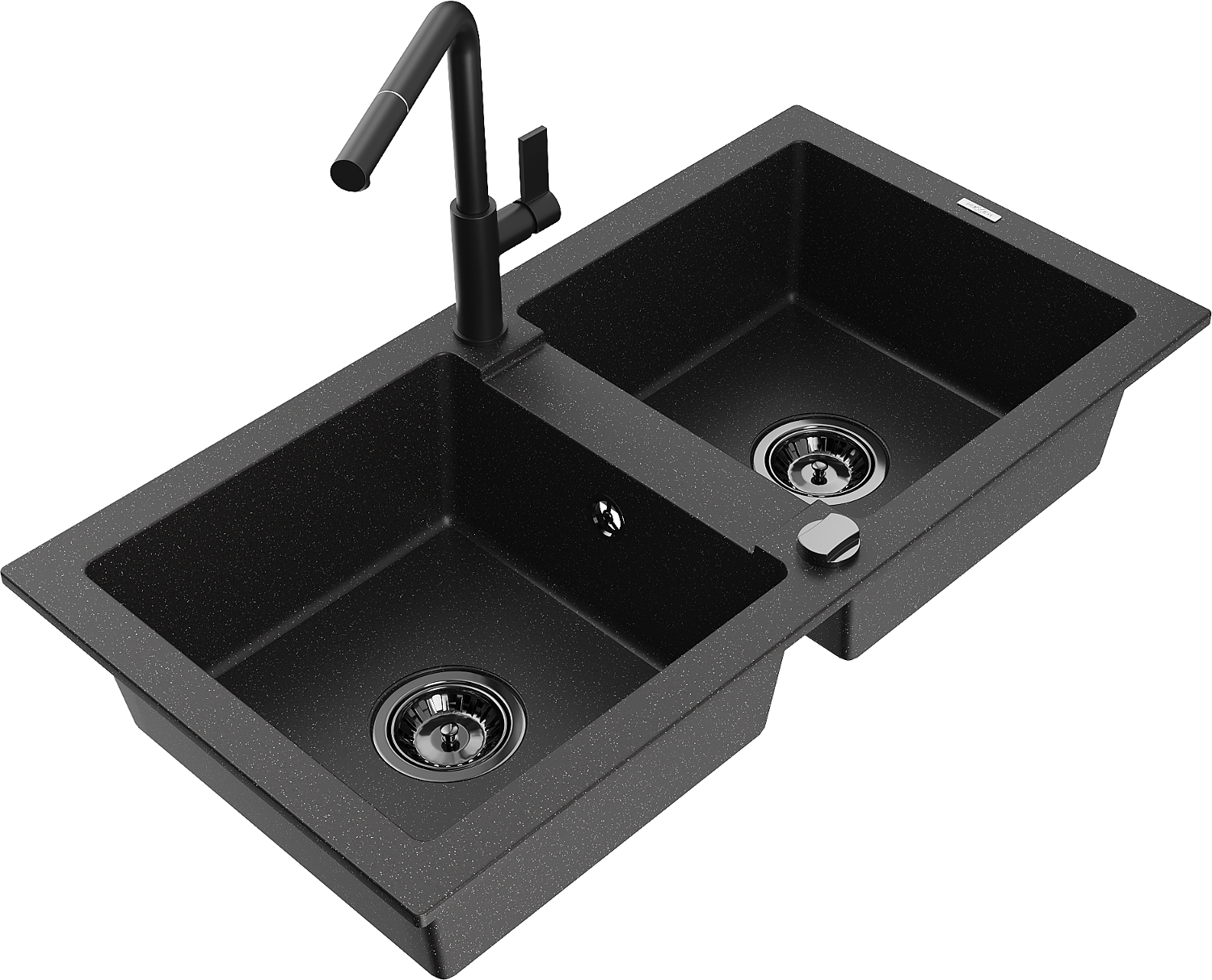 Mexen Mario granito kriauklė su 2 kameromis ir virtuviniu maišytuvu Flora, juodas/sidabrinis metalikas - 6504-73-670401-70-B