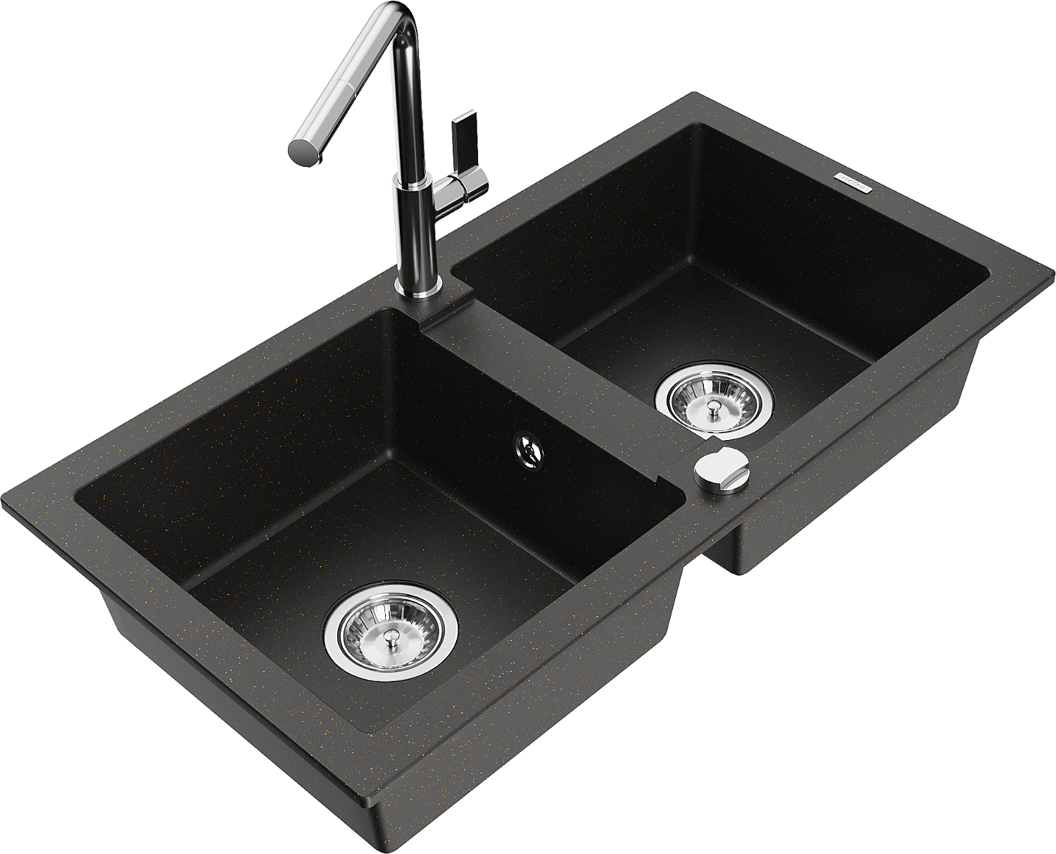 Mexen Mario dviejų skyrių granito plautuvė su Flora virtuviniu maišytuvu, juoda/auksinio metalo - 6504-75-670401-00