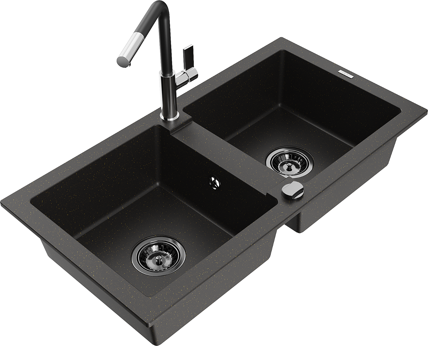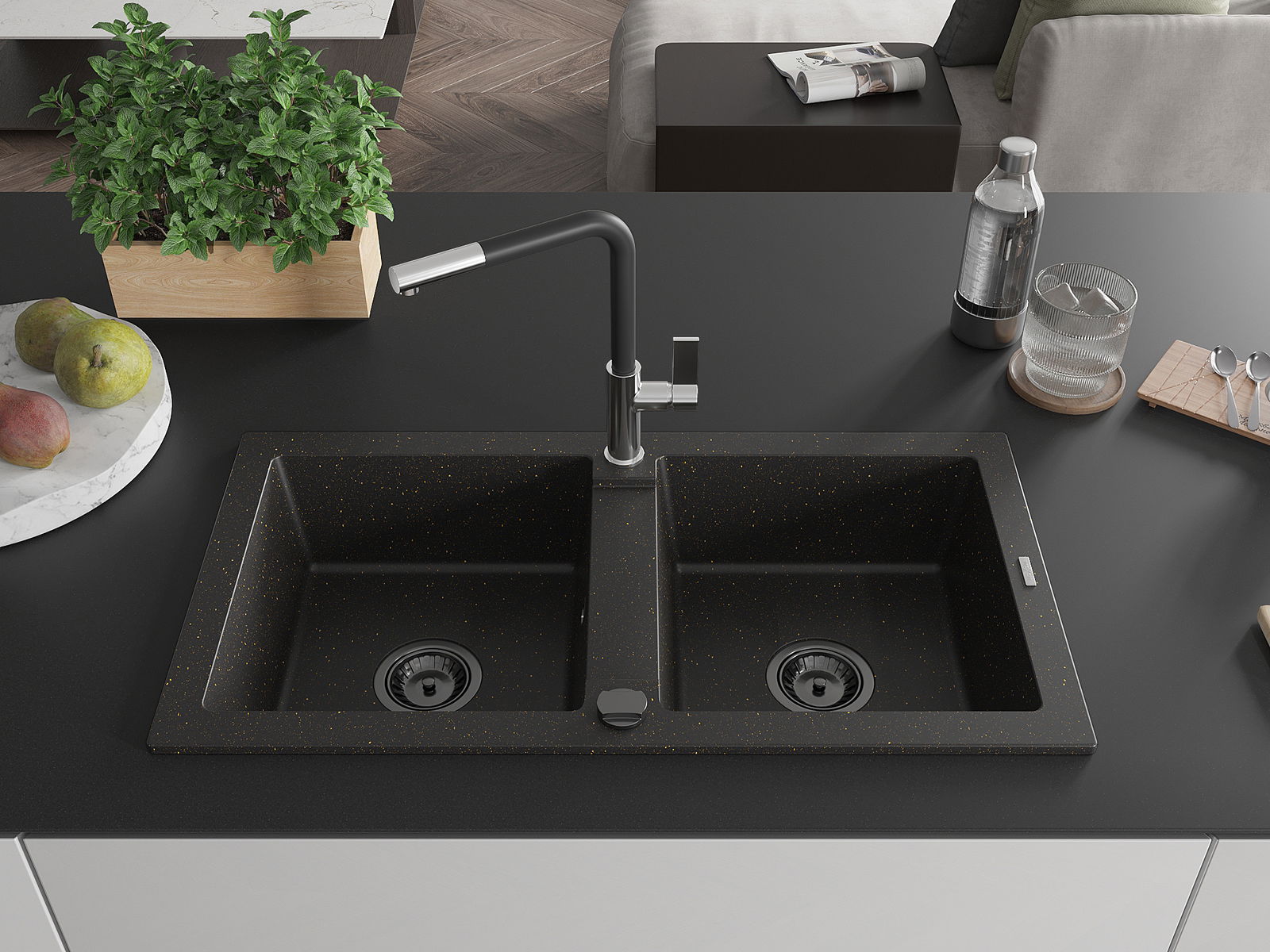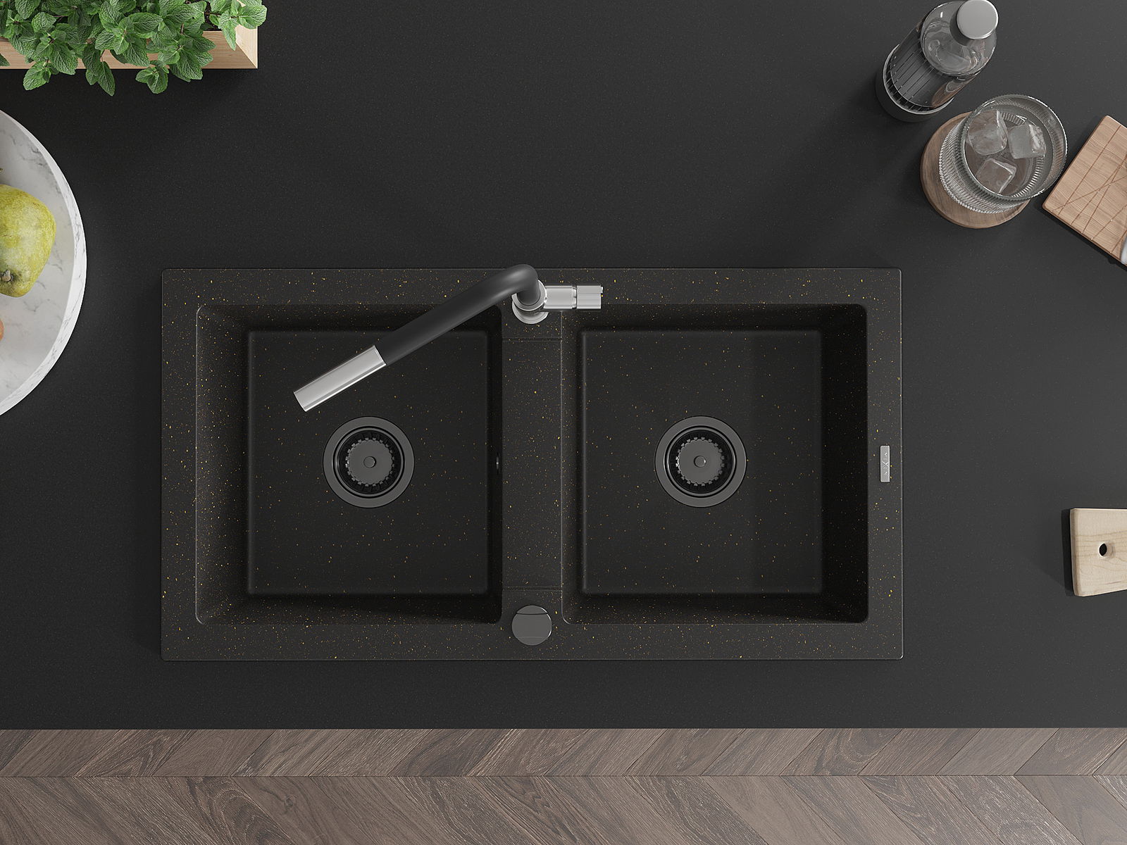 Mexen Mario dviejų kamerų granito kriauklė su virtuviniu maišytuvu Flora, juoda/auksinis metalikas - 6504-75-670401-07-B