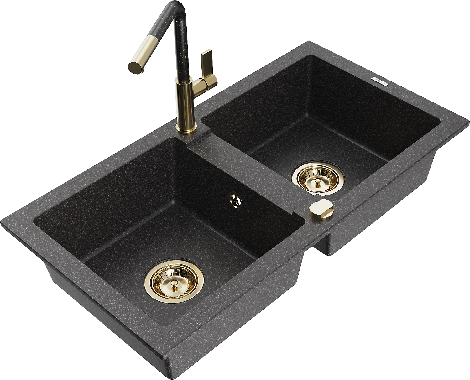 Mexen Mario granito plautuvė su dviem dubenimis, su Flora virtuviniu maišytuvu, juodas su dėmėmis - 6504-76-670401-75-G