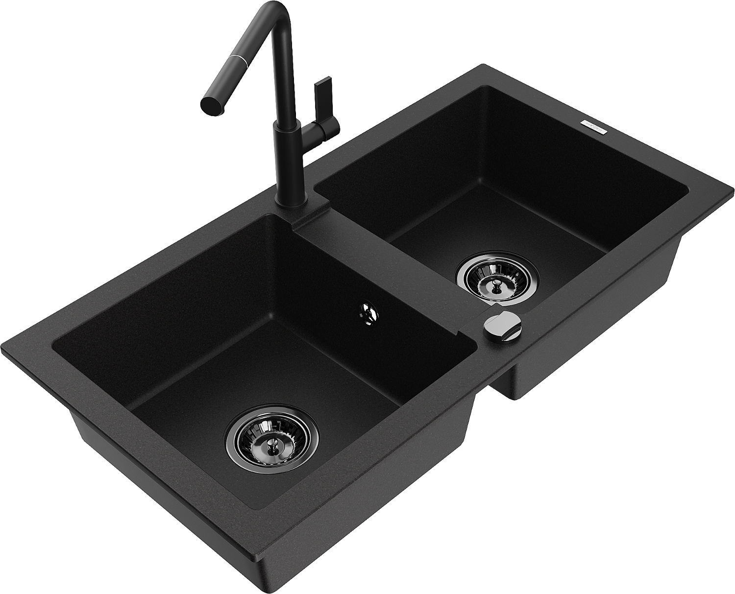 Mexen Mario dviejų skylių granito virtuvės kriauklė su Flora maišytuvu, juoda - 6504-77-670401-70-B
