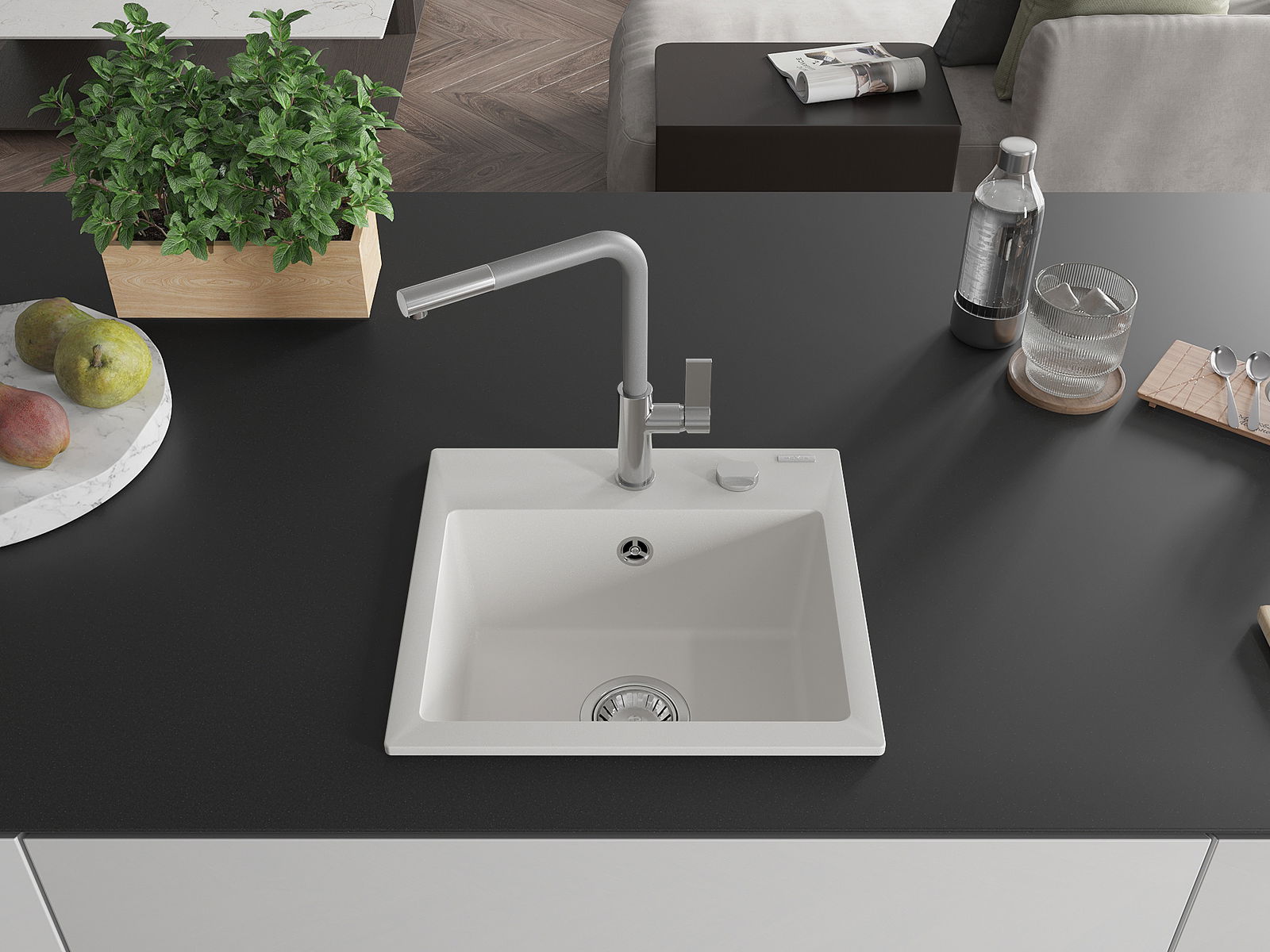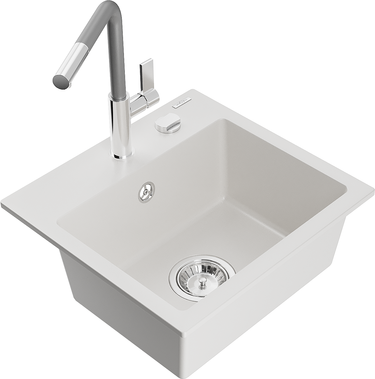 Mexen Milo granitinė 1 skyrelio kriauklė su virtuviniu maišytuvu Flora, balta - 6505-20-670401-06