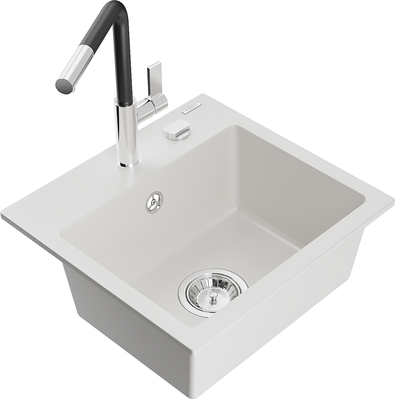 Mexen Milo granitinė plautuvė, 1 skyrius, su virtuviniu maišytuvu Flora, balta - 6505-20-670401-07