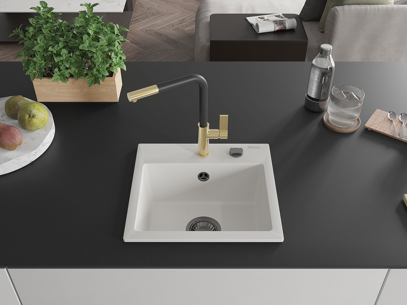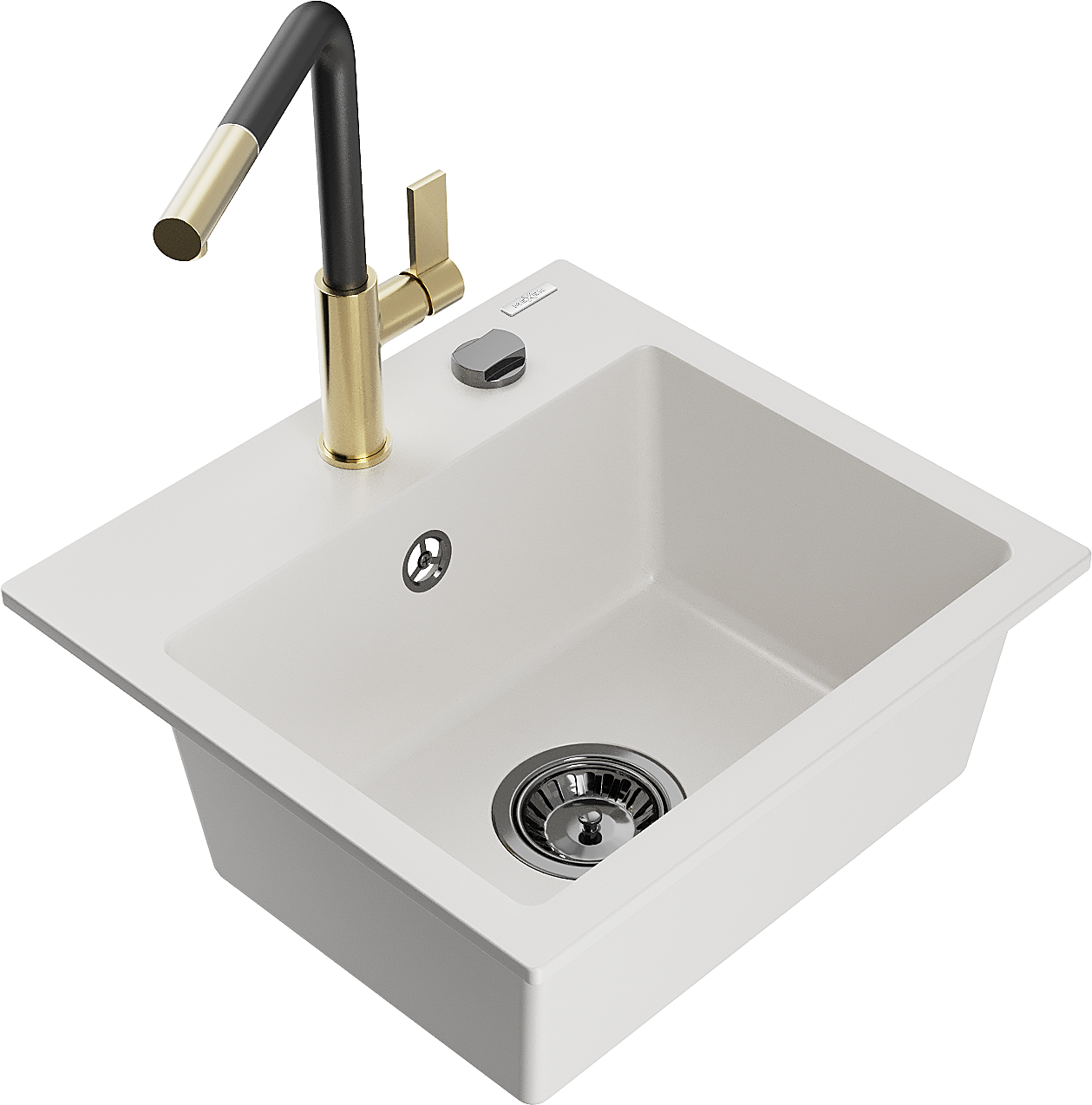 Mexen Milo granitinė vienos kameros kriauklė su virtuviniu maišytuvu Flora, balta - 6505-20-670401-57-B