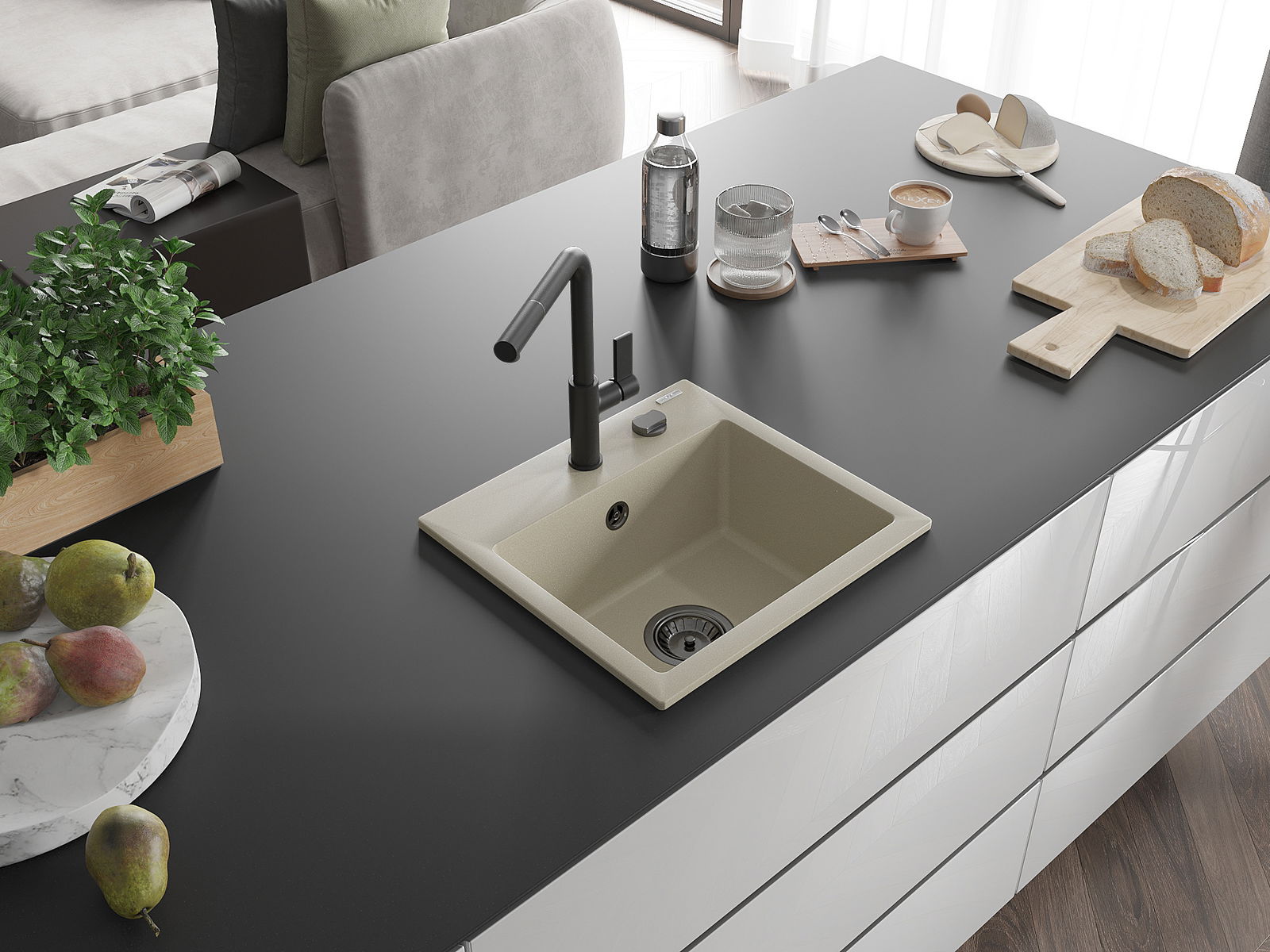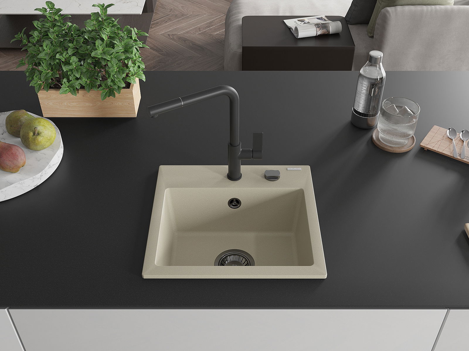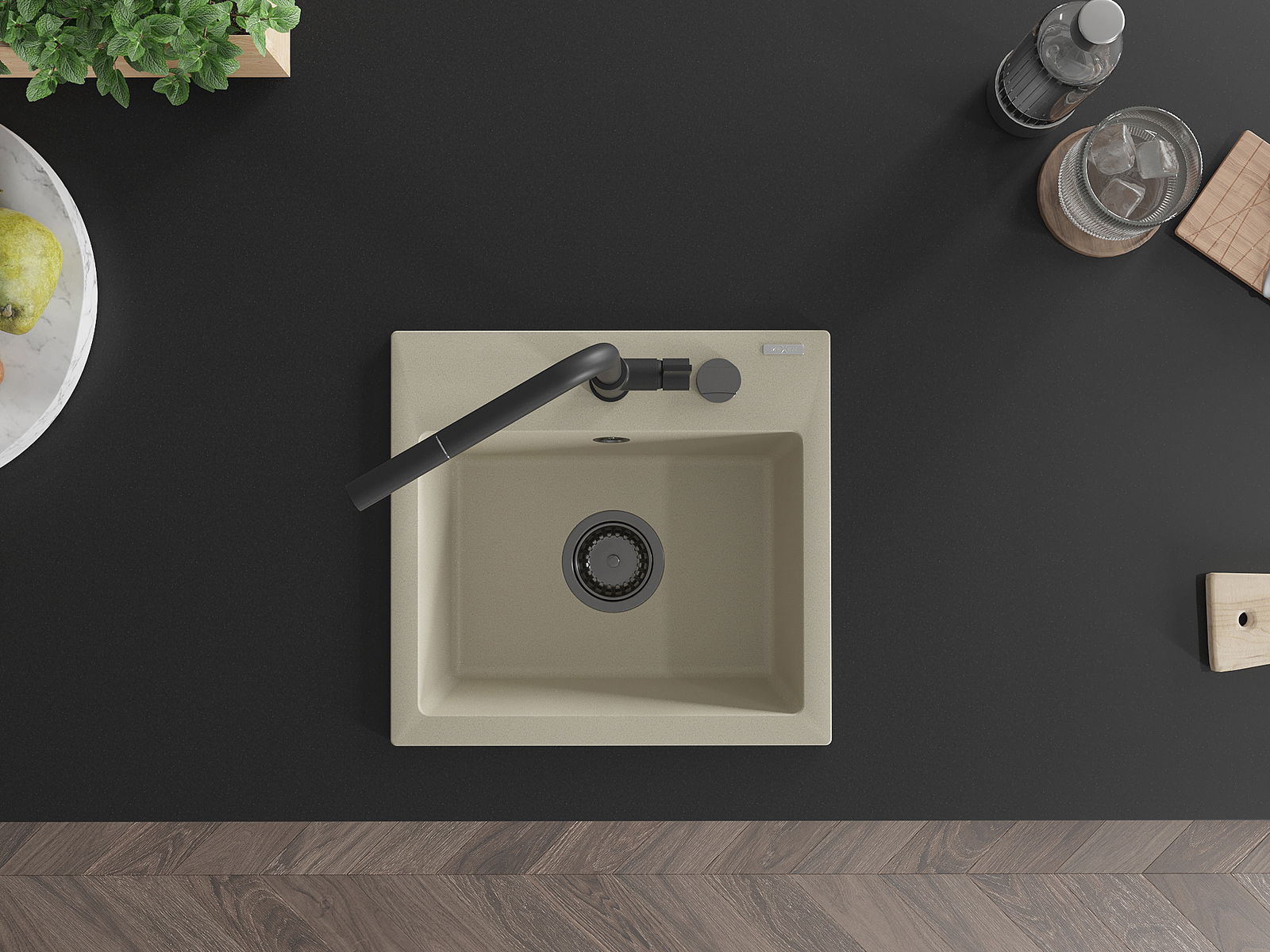 Mexen Milo granitinė vienos kameros virtuvės plautuvė su Flora maišytuvu, smėlio spalvos - 6505-69-670401-70-B