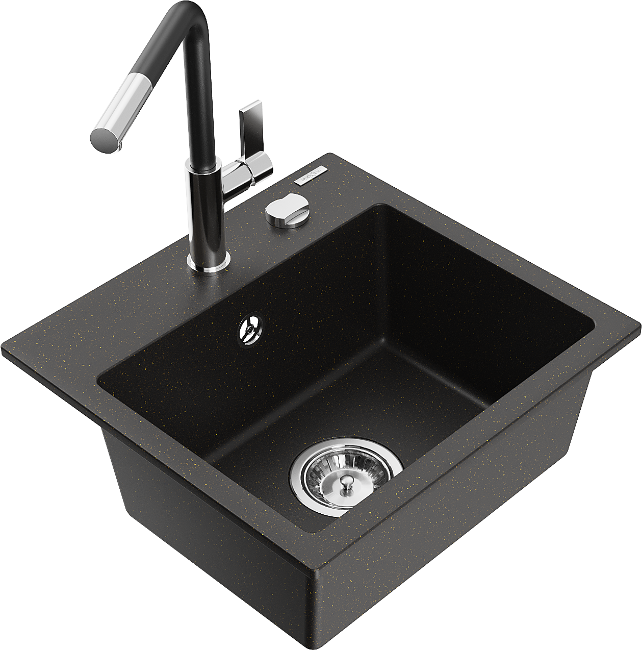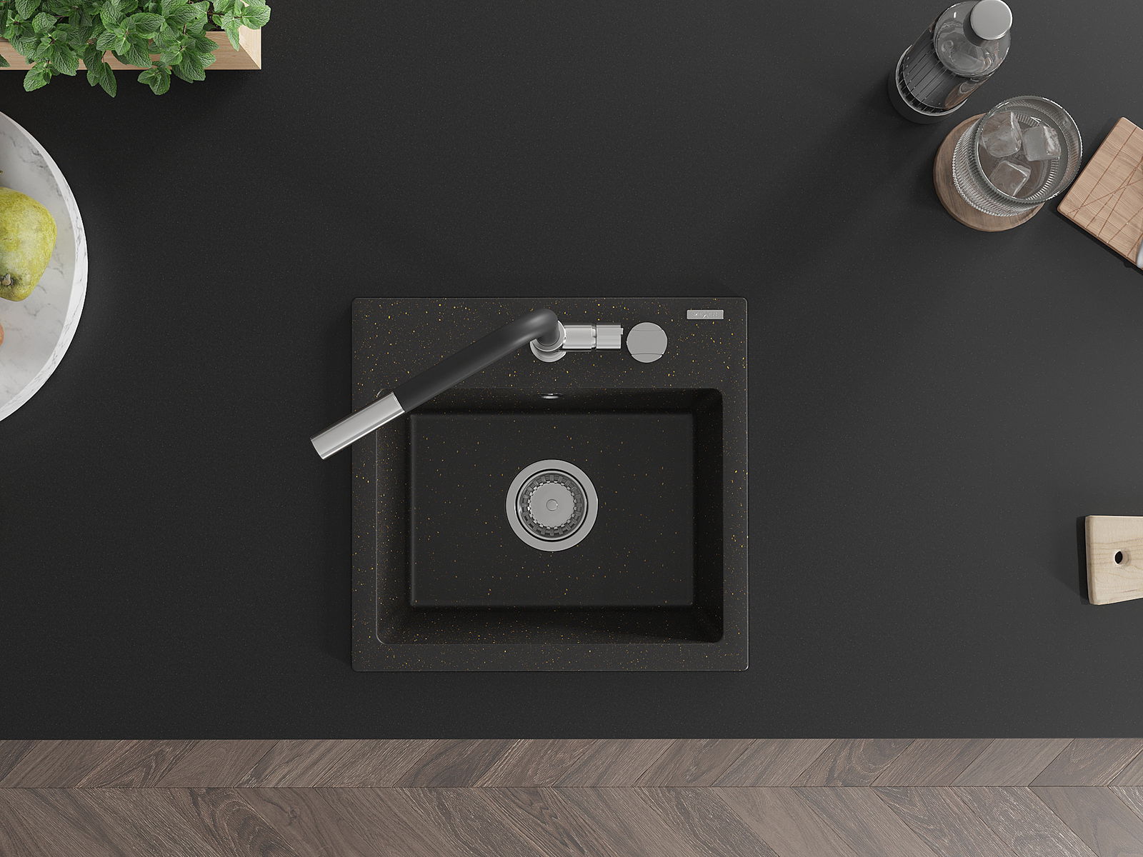 Mexen Milo granitinė plautuvė su vienu dubeniu ir Flora virtuvinis maišytuvas, juoda/auksinis metalikas - 6505-75-670401-07
