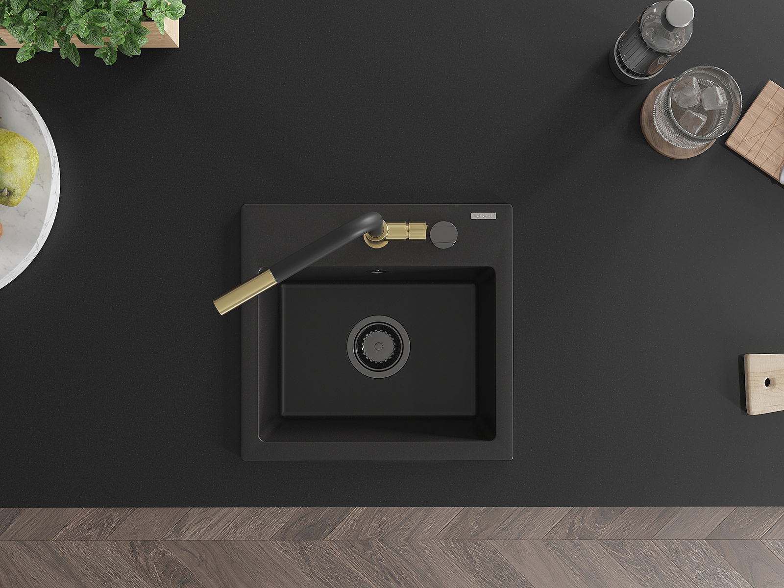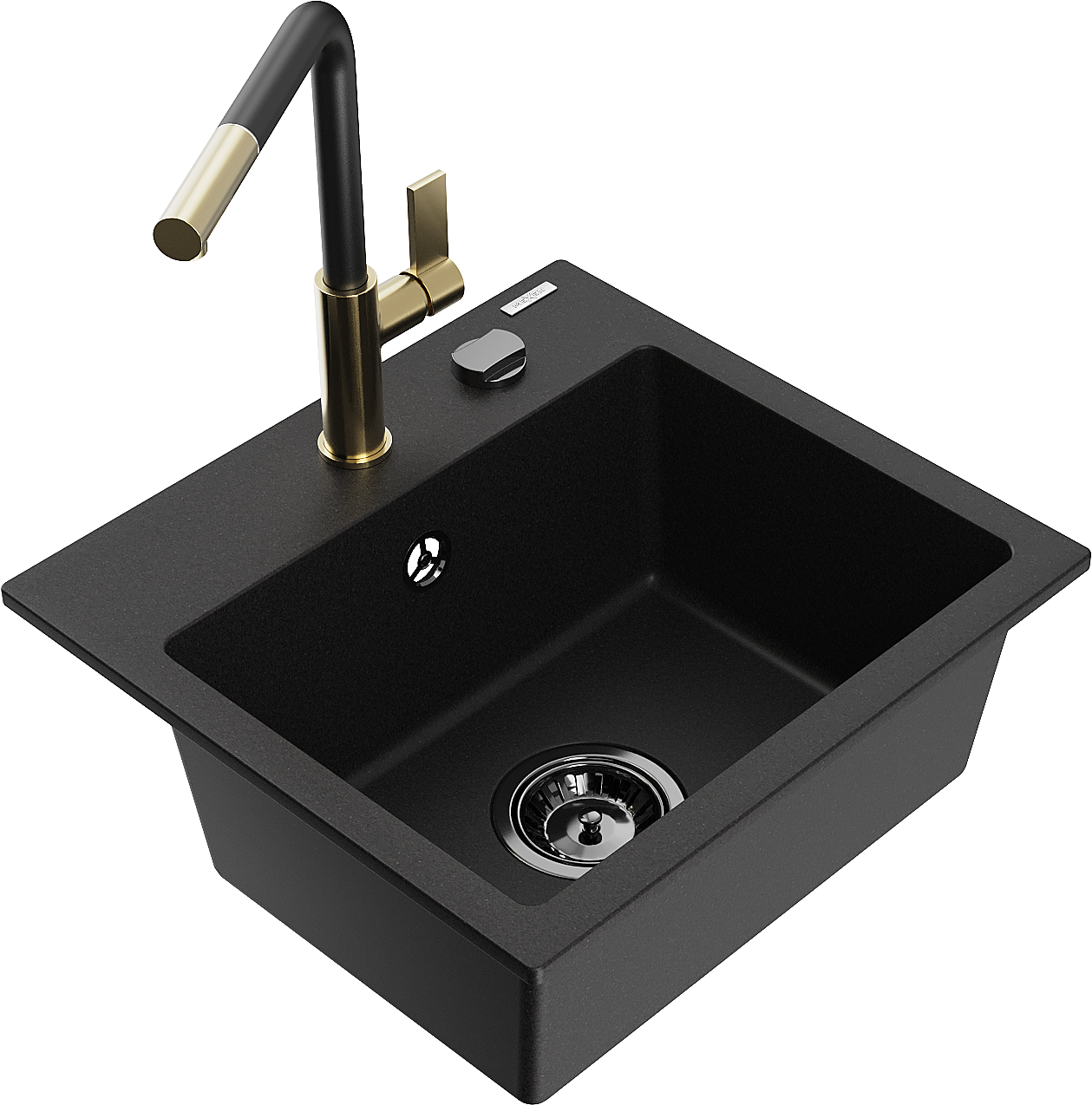 Mexen Milo granitinis virtuvės plautuvas su viena kamera ir Flora virtuviniu maišytuvu, juodas - 6505-77-670401-57-B