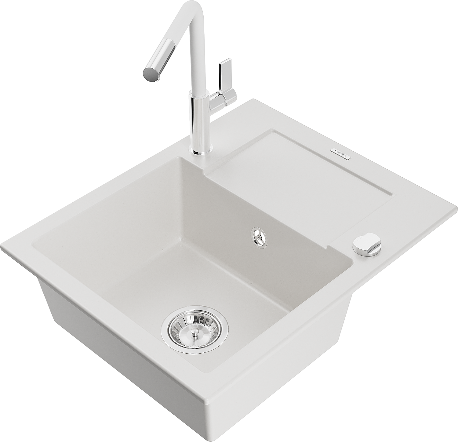 Mexen Enzo granitinis vienos kameros kriauklė su nuvarvėjimo lenta ir virtuviniu maišytuvu Flora, baltas - 6506-20-670401-02