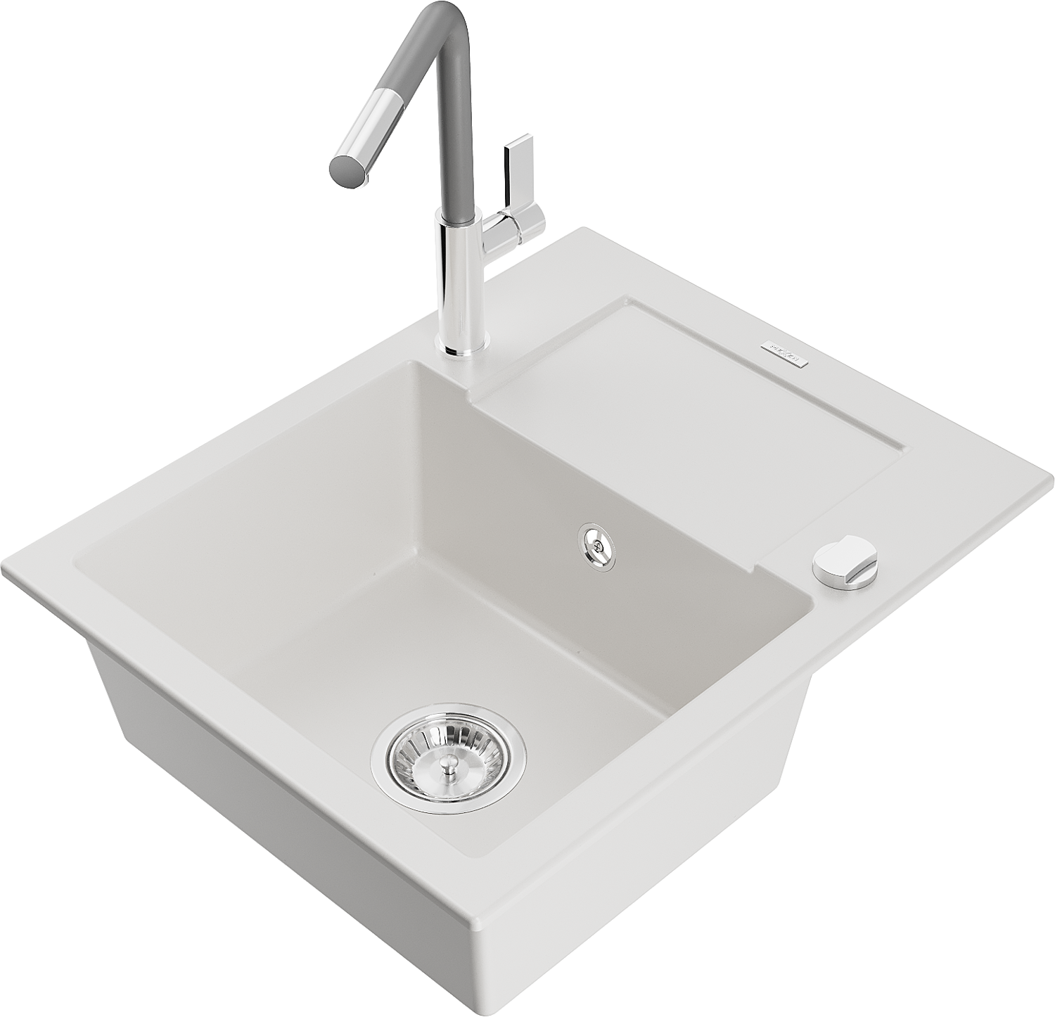 Mexen Enzo vientisas granitinis plautuvas su džiovintuvu ir virtuvės maišytuvu Flora, baltas - 6506-20-670401-06