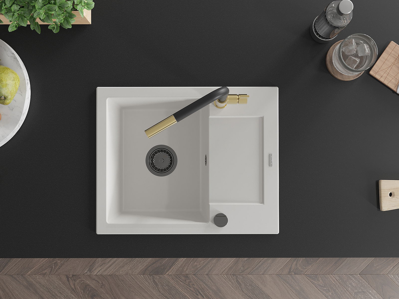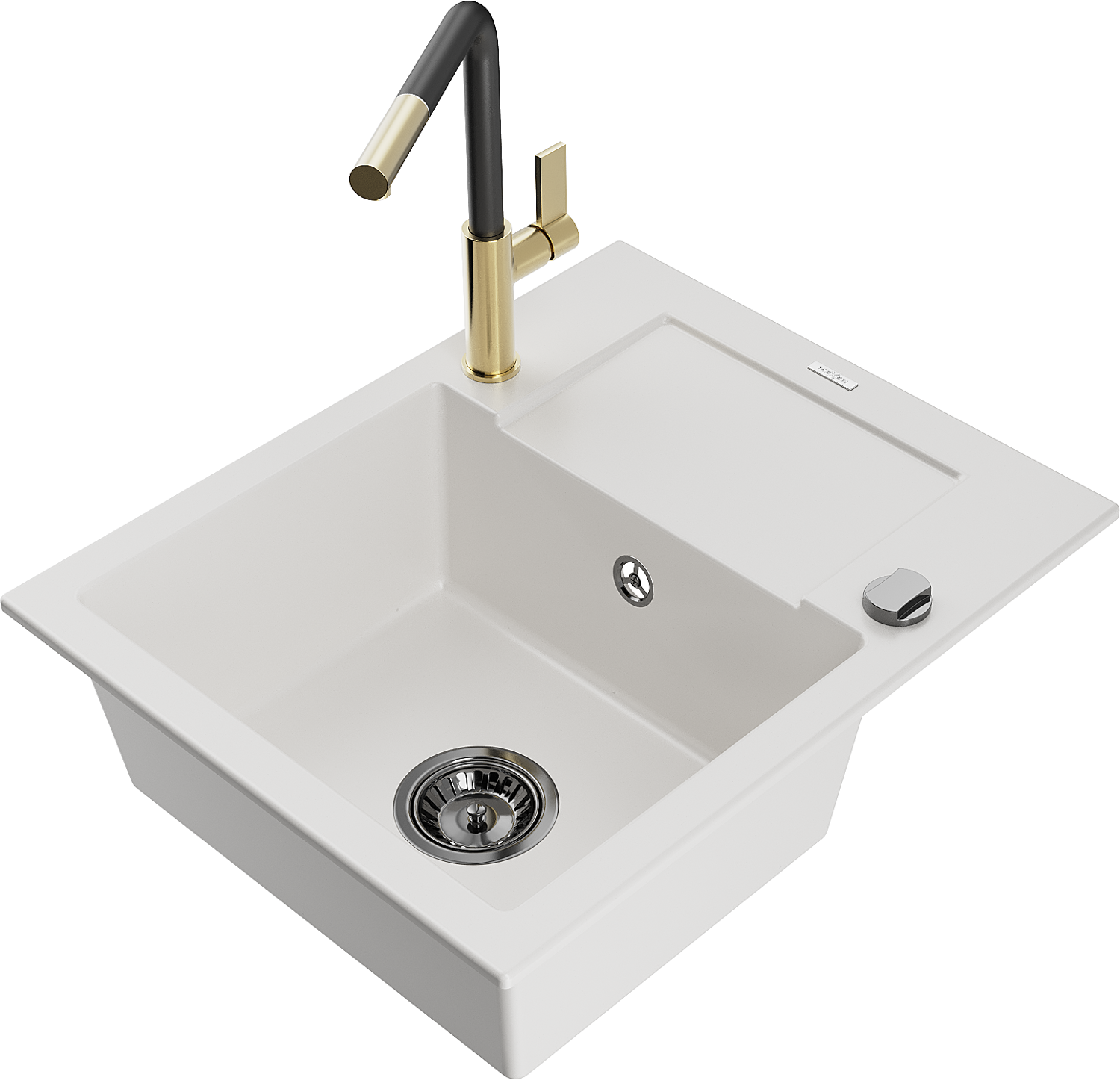 Mexen Enzo 1 skylių virtuvės granitinė plautuvė su nuvarveklė ir virtuvės maišytuvas Flora, balta - 6506-20-670401-57-B