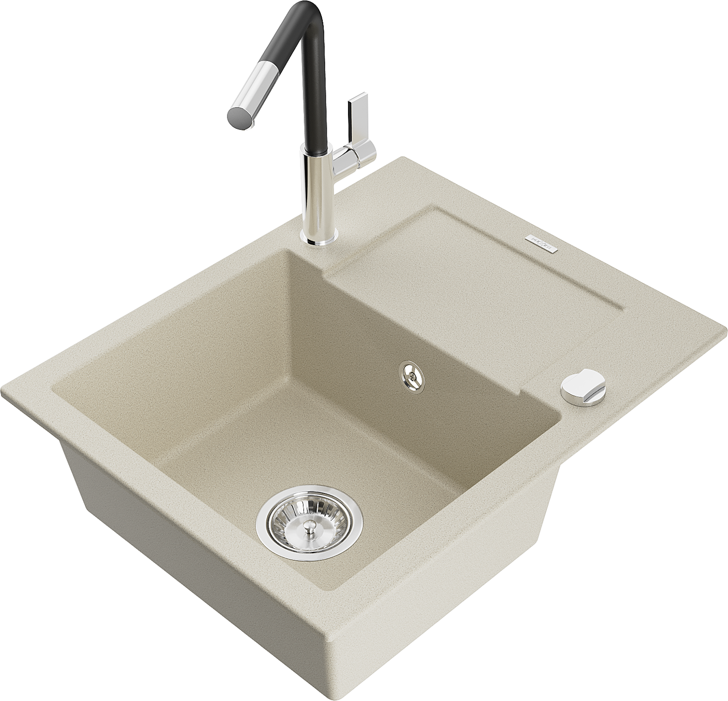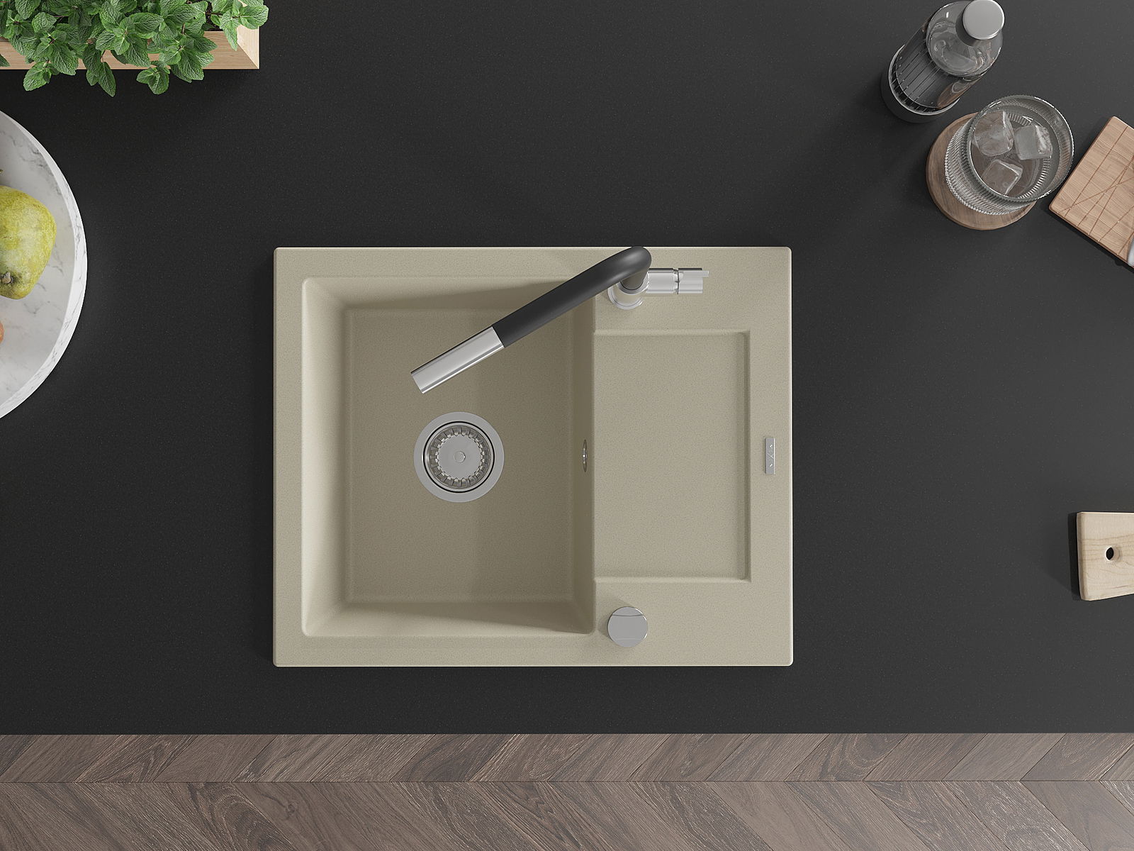 Mexen Enzo granitinė vienos kameros kriauklė su nusausintuvu ir virtuviniu maišytuvu Flora, smėlio spalvos