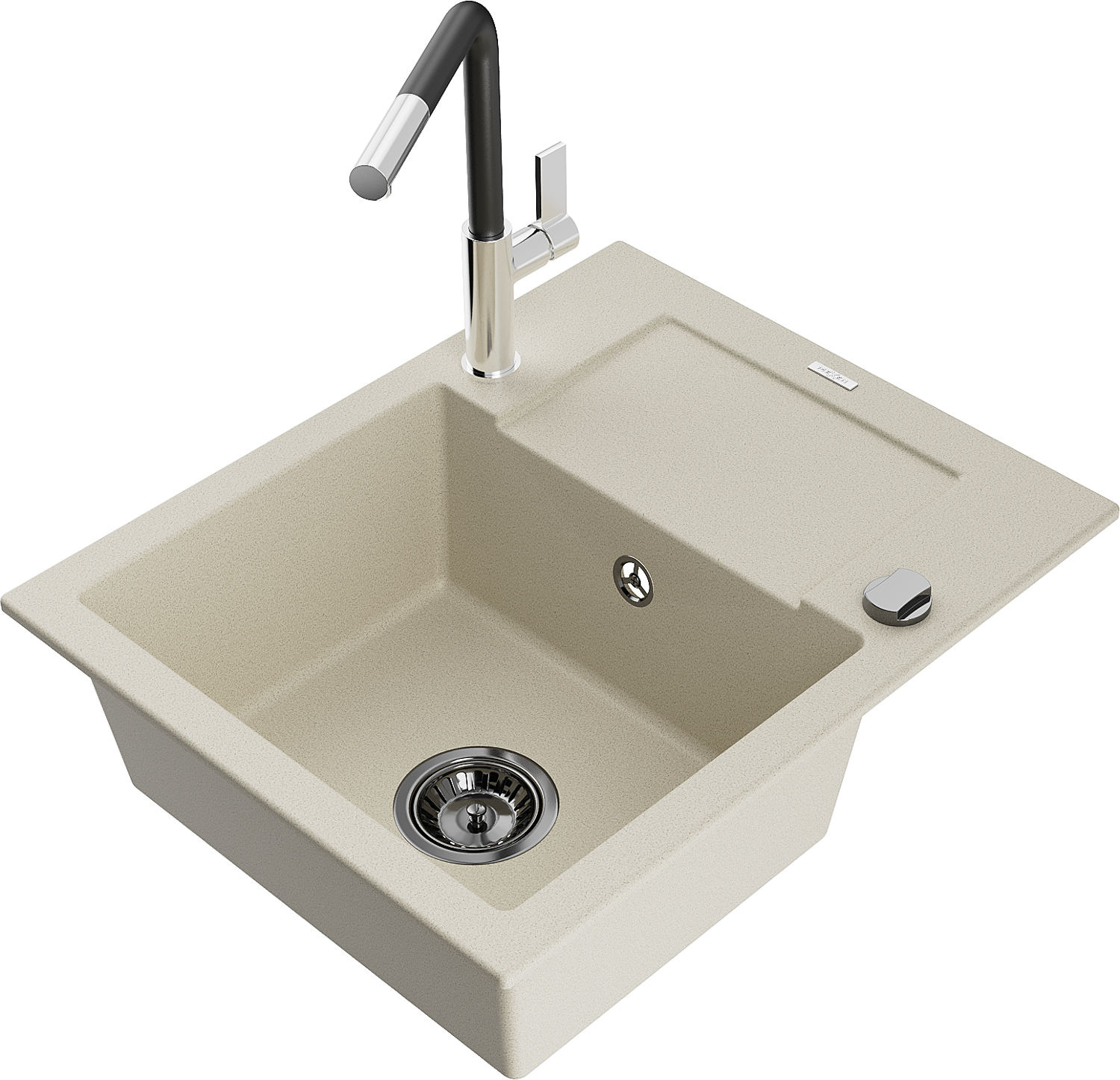 Mexen Enzo 1 sekcijos granitinė plautuvė su nusausinimo lenta ir Flora virtuviniu maišytuvu, smėlio spalvos