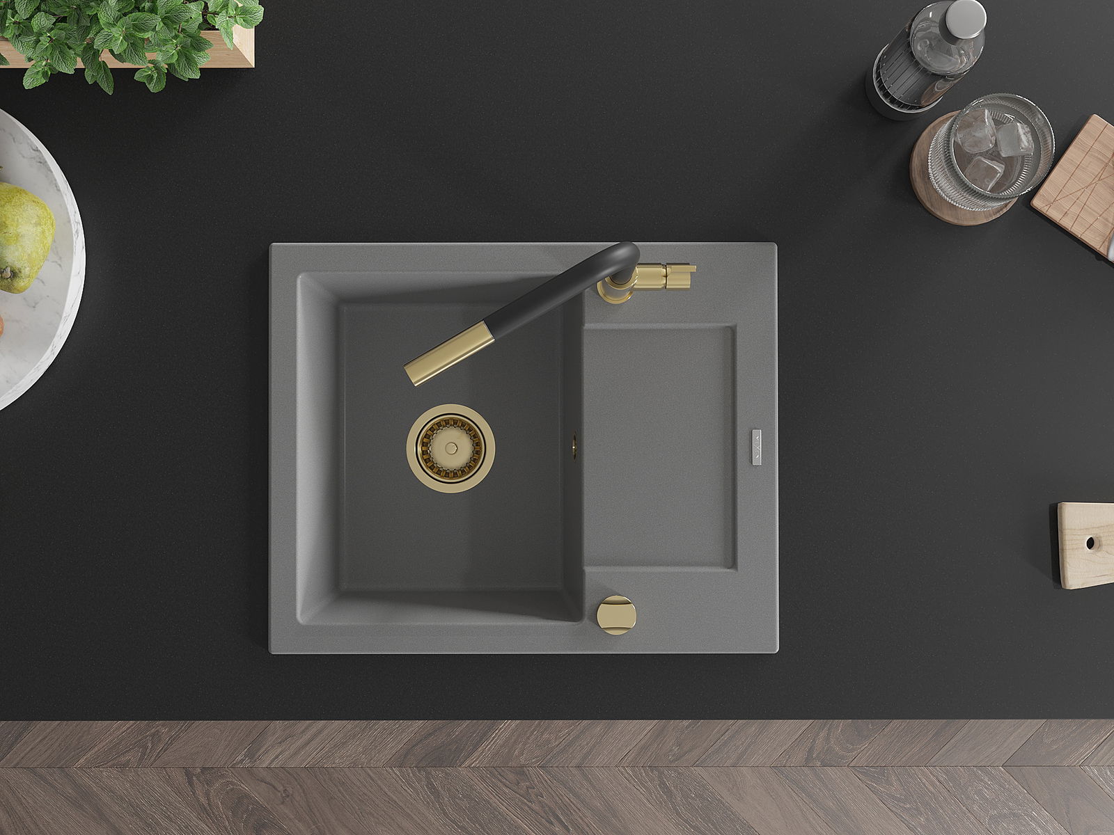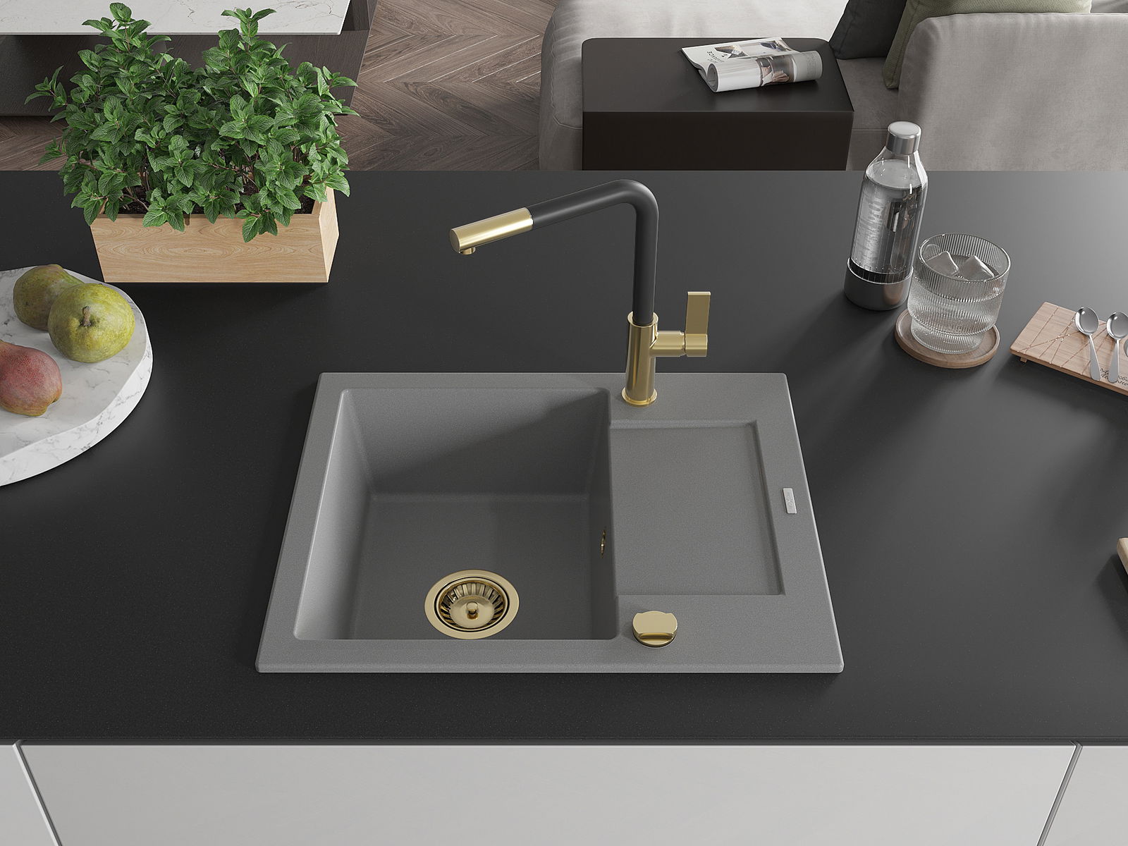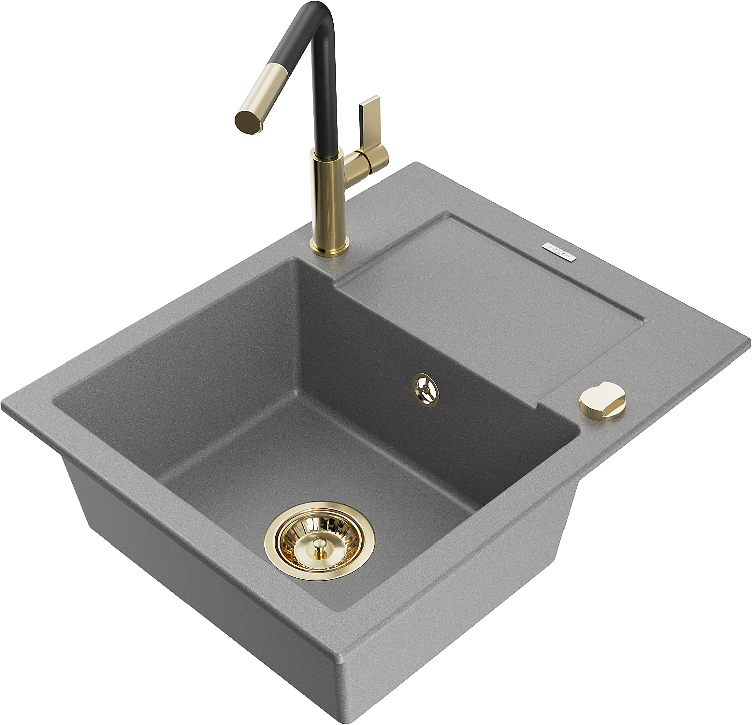 Mexen Enzo vienos kameros granitinis plautuvė su nutekamu ir virtuvės maišytuvu Flora, pilkas - 6506-71-670401-57-G