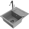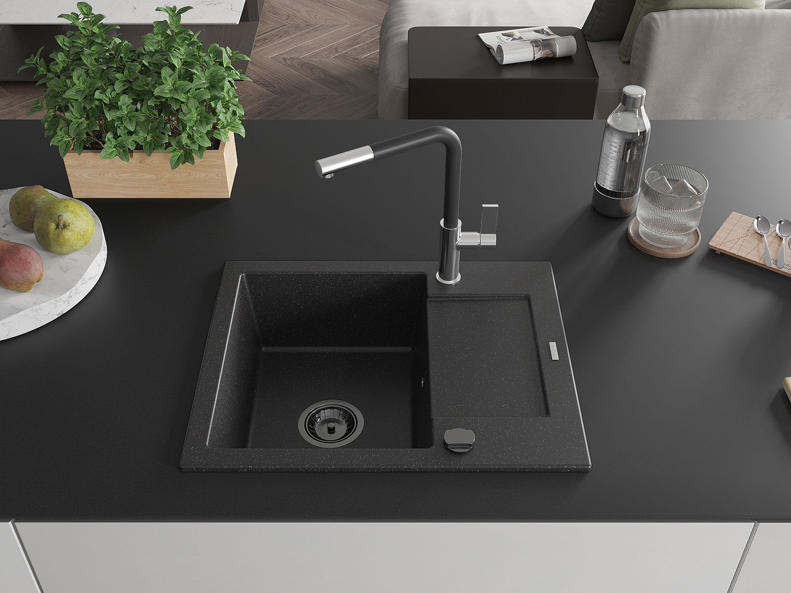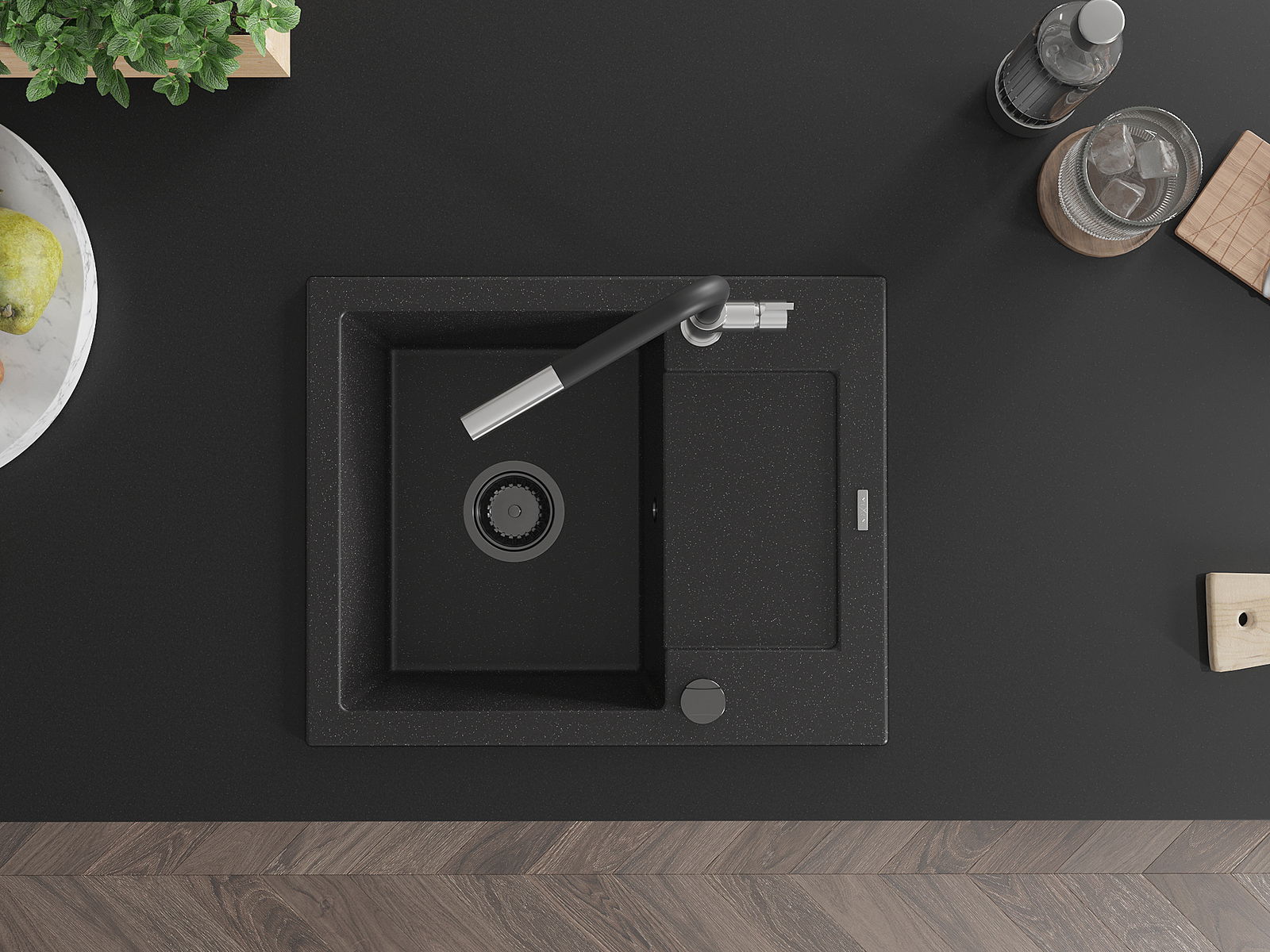 Mexen Enzo granitinė plautuvė su viena kamera, su drenažu ir virtuviniu maišytuvu Flora, juoda/sidabrinė metalo spalva