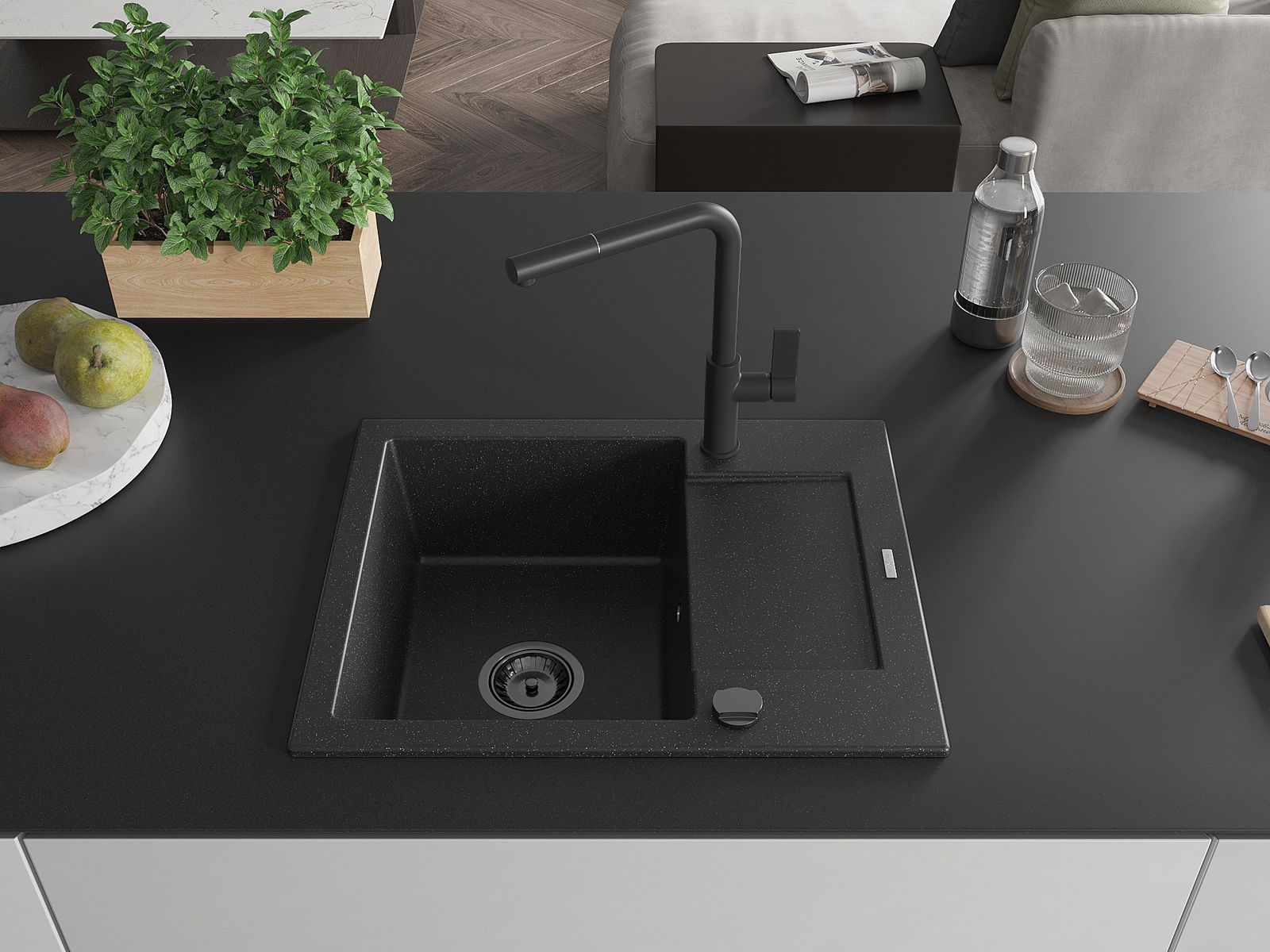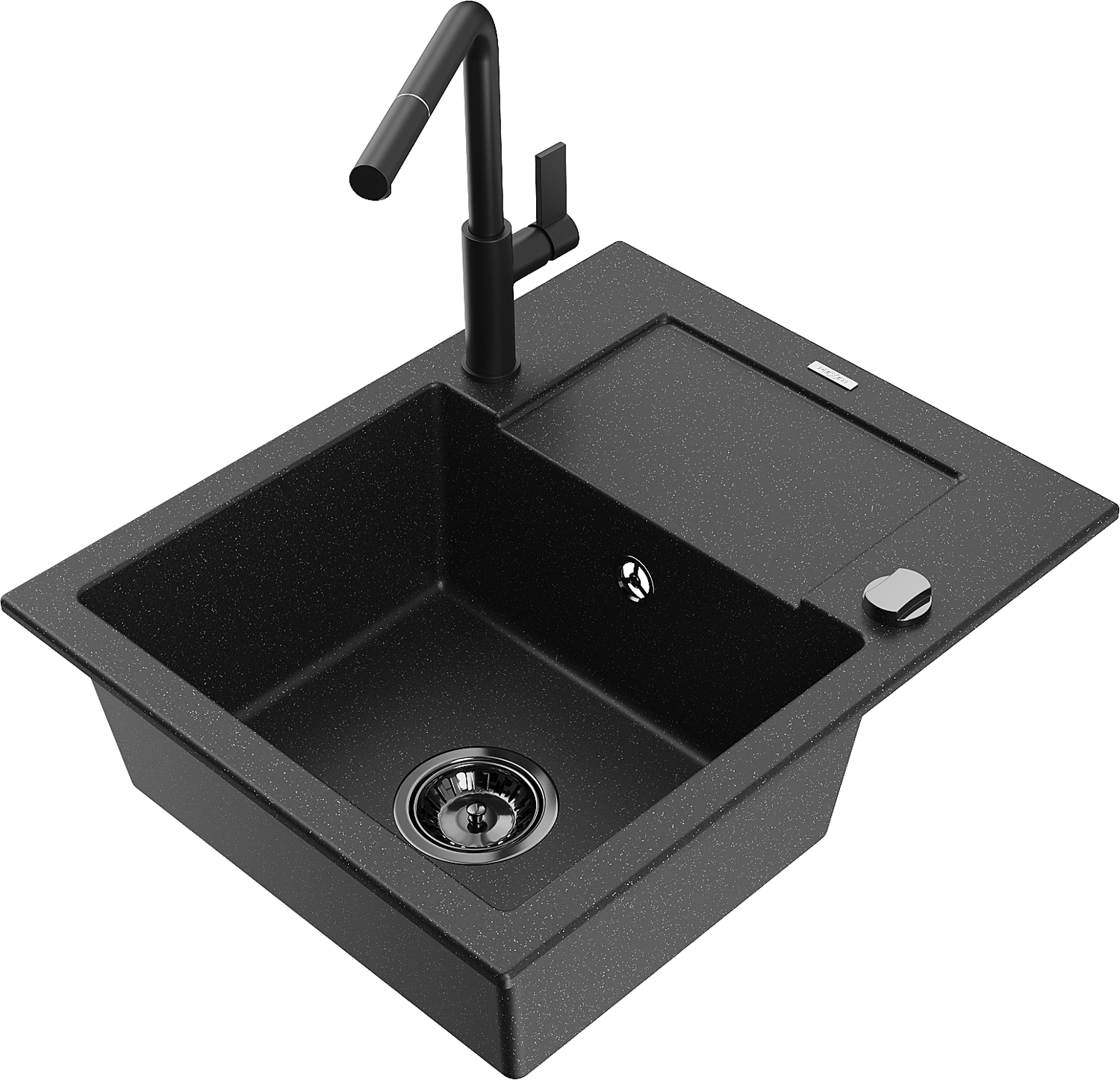 Mexen Enzo granitinė vienos kameros plautuvė su nusausintuvu ir virtuviniu maišytuvu Flora, juodas/sidabrinis metalikas