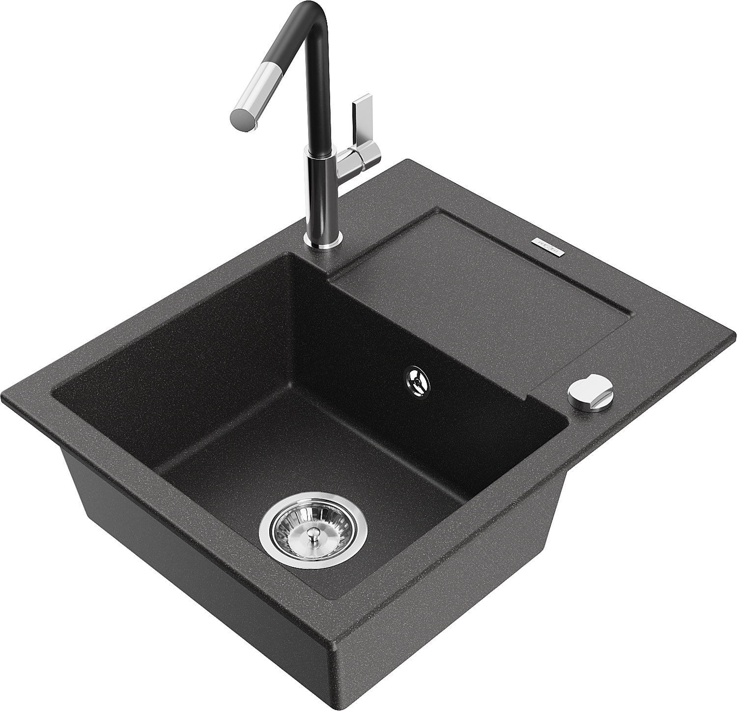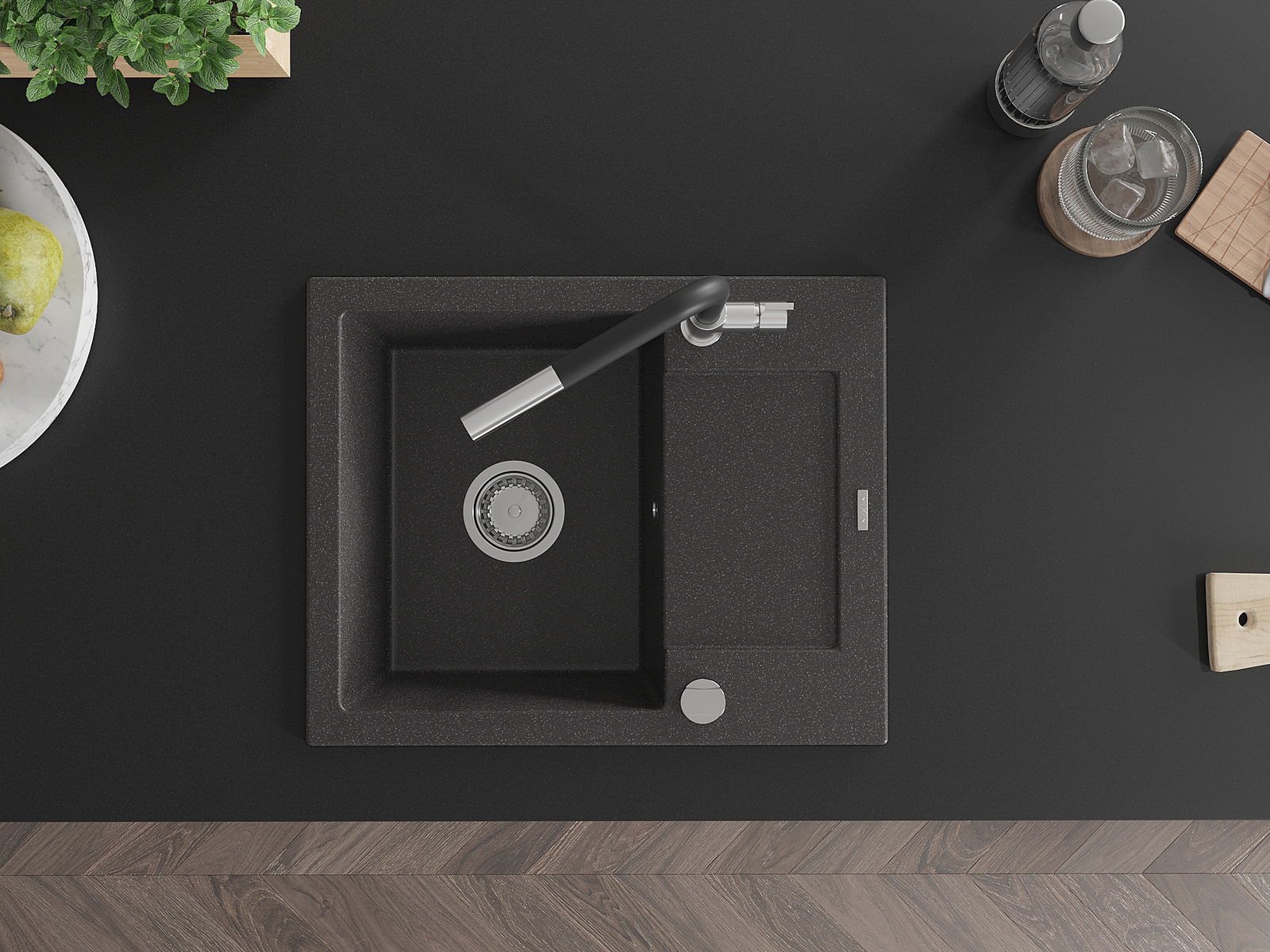 Mexen Enzo granitinis vienos kameros plautuvė su nusausintuvu ir virtuvės maišytuvu Flora, juodas dėmėtas - 6506-76-670401-07