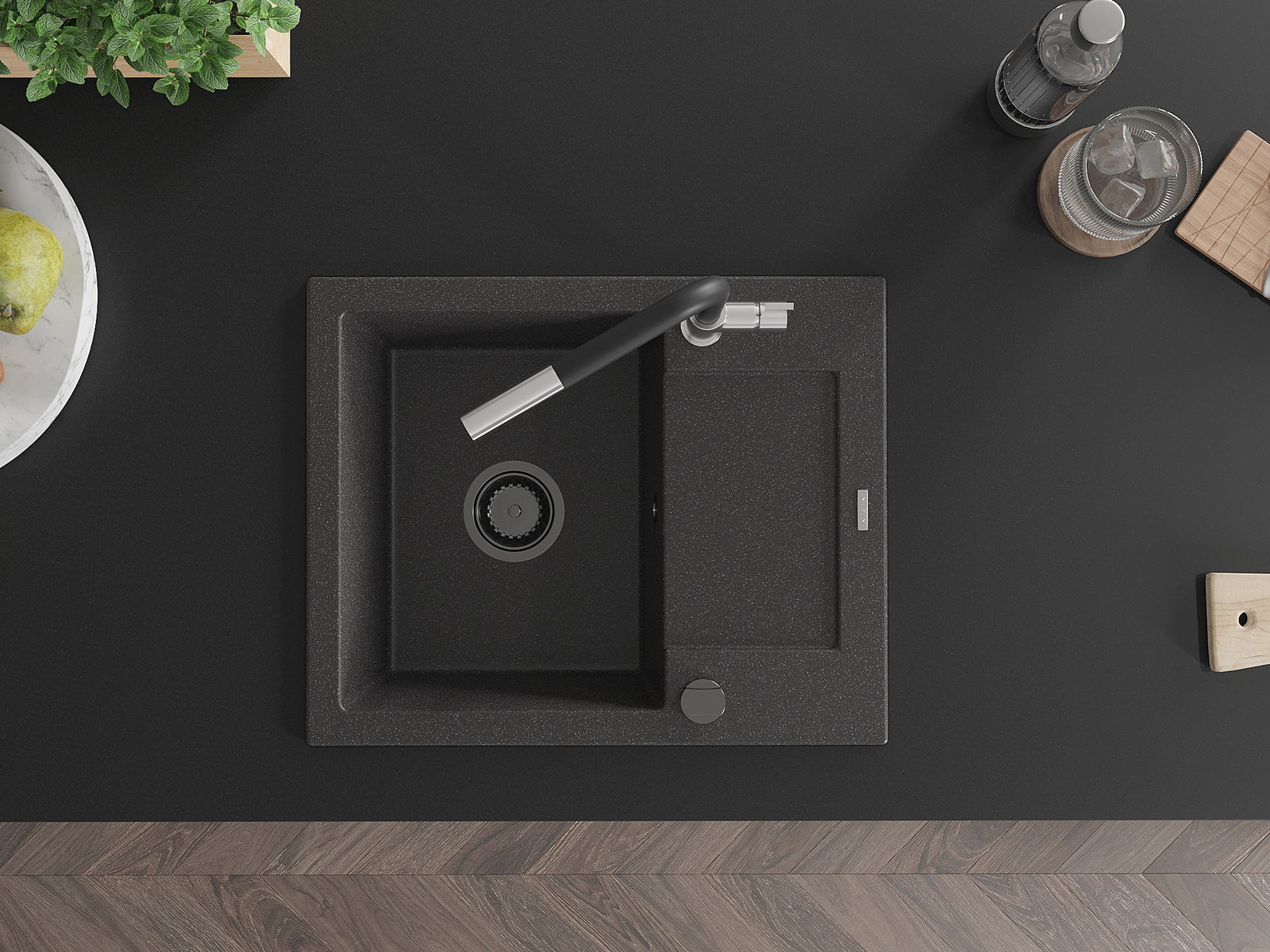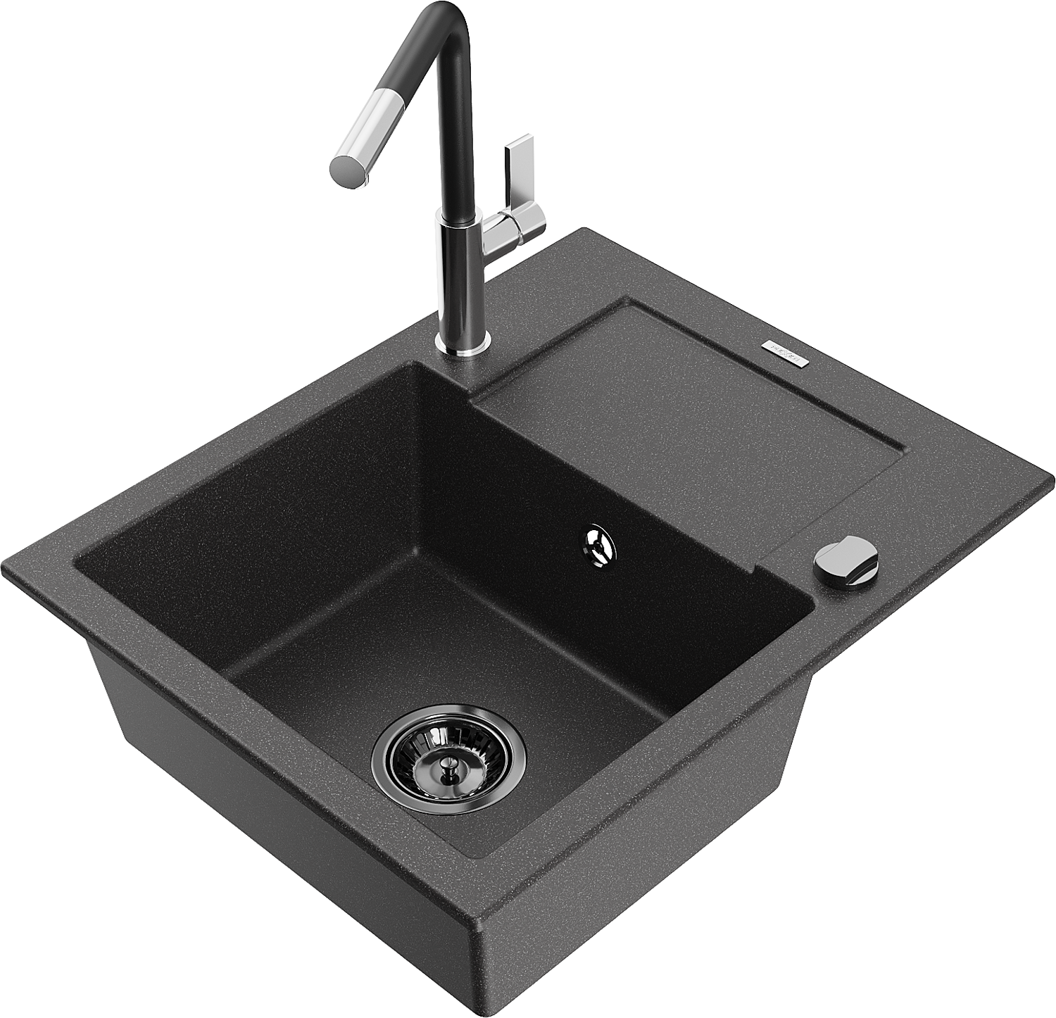 Mexen Enzo granitinė vienos kameros plautuvė su drenažu ir virtuvės maišytuvu Flora, juodai taškuota - 6506-76-670401-07-B
