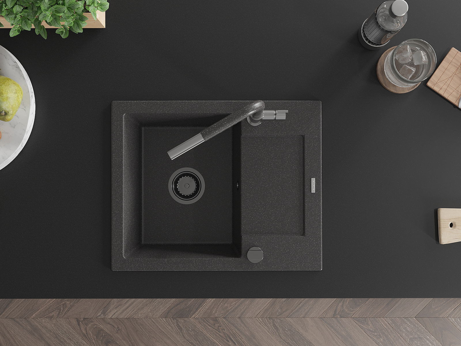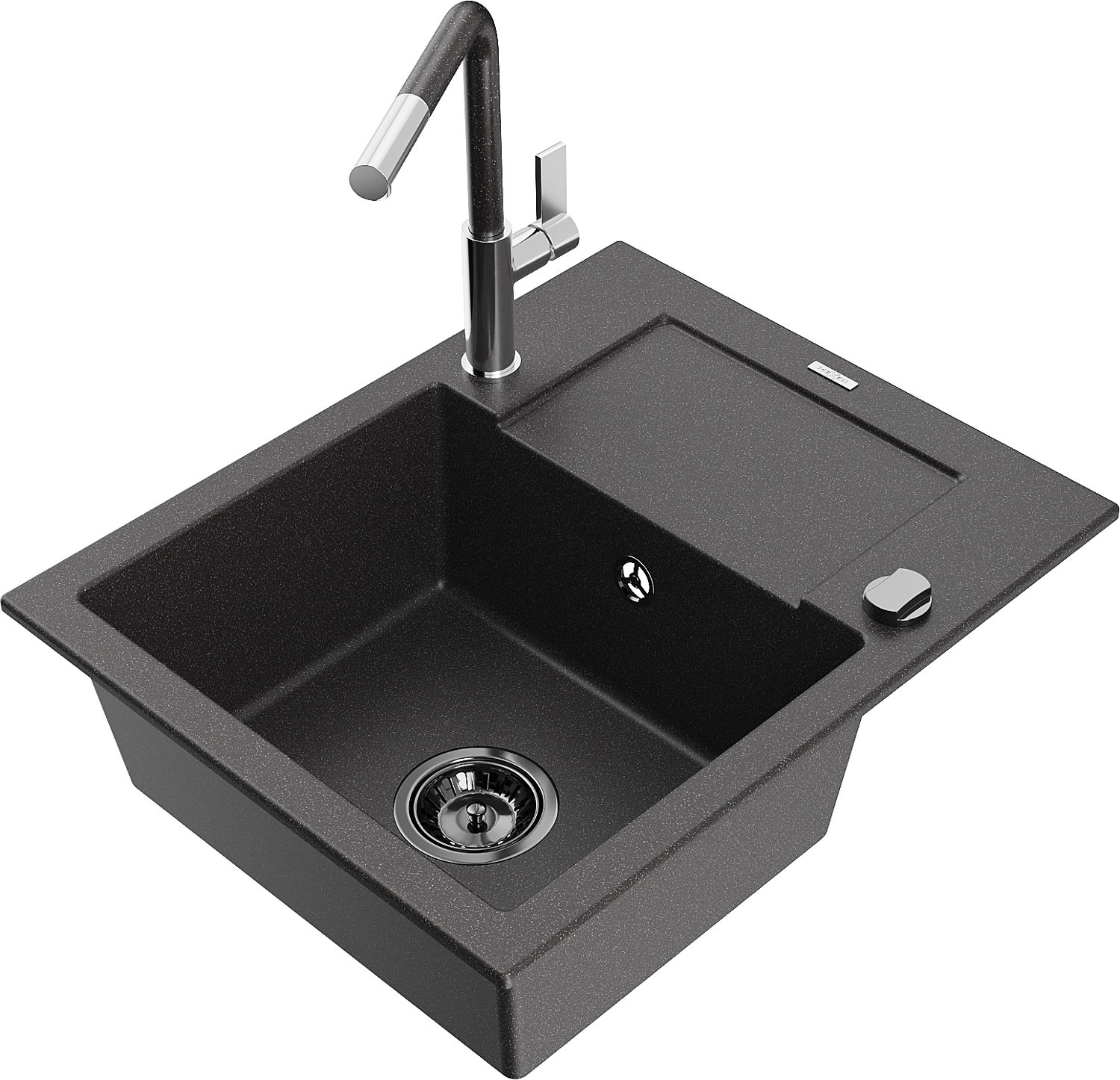 Mexen Enzo granitinė vienos kameros plautuvė su nusausinimo paviršiumi ir Flora virtuviniu maišytuvu, juodas dėmėtas