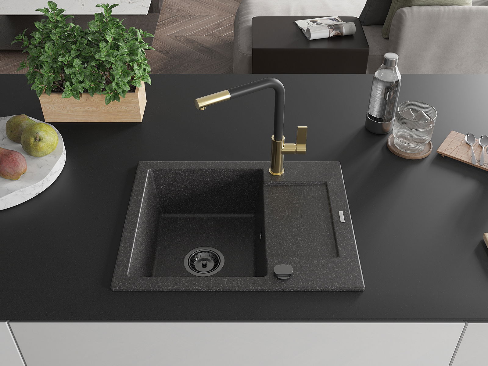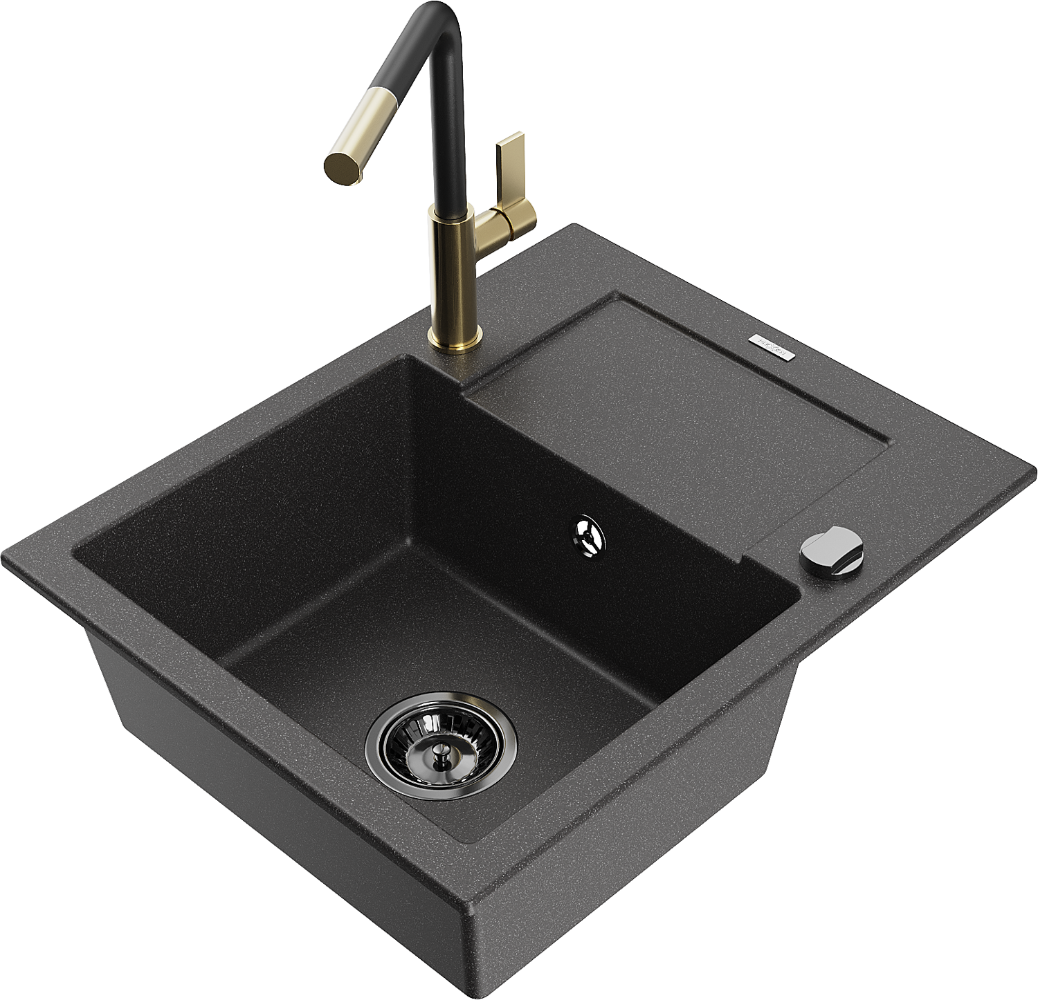 Mexen Enzo granitinė 1 kamerų plautuvė su nutekamuoju paviršiumi ir Flora virtuvės maišytuvu, juoda su taškeliais