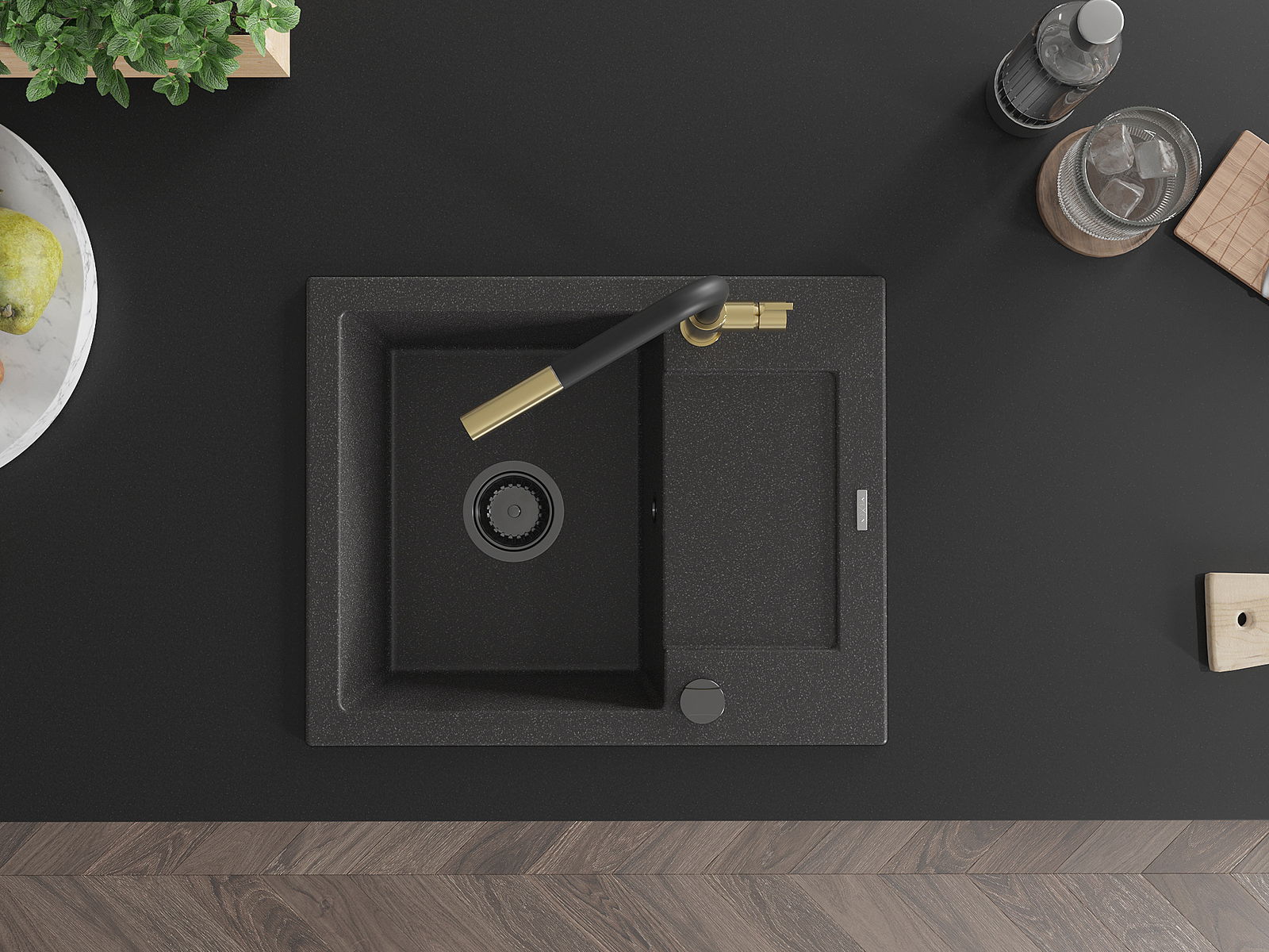 Kriauklė turi 2 iš anksto frezuotas skyles, kurių skersmuo yra 35 mm, skirtas savarankiškam išmušimui. Jas galima naudoti, pavyzdžiui, skysčio dozatoriaus montavimui, kuris pašalins plastikinių butelių buvimą virtuvėje ir suteiks jai elegantišką apdailą.