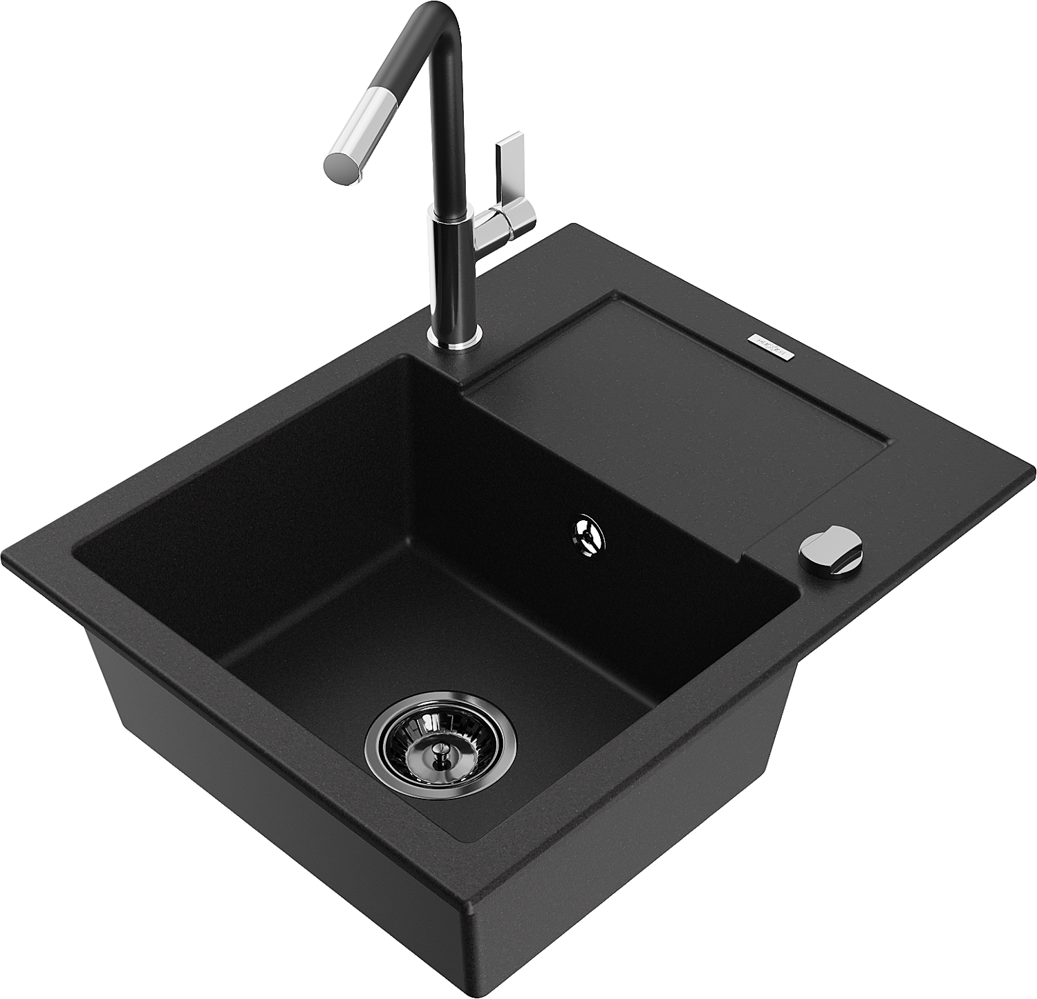 Mexen Enzo granito plautuvė 1-dubenė su nusausinimu ir Flora virtuviniu maišytuvu, juoda - 6506-77-670401-07-B