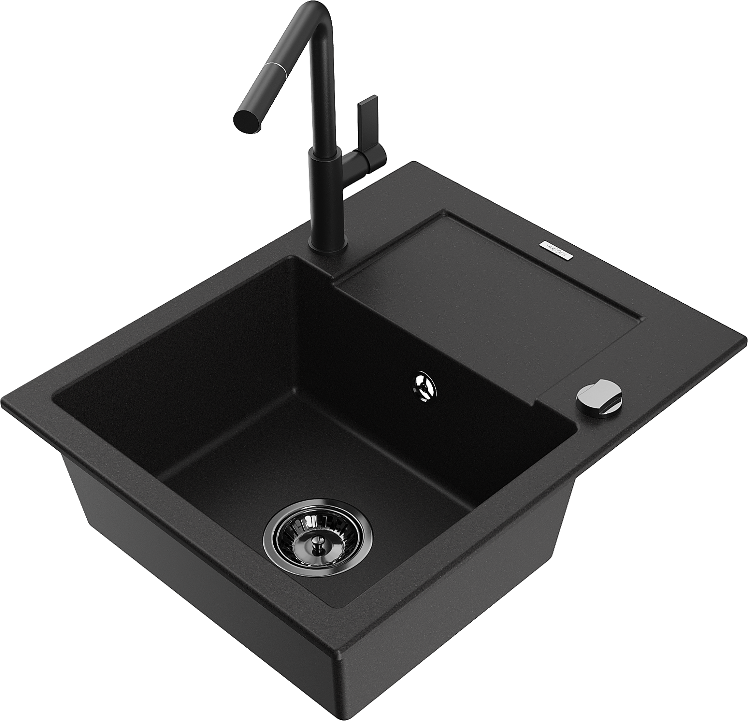 Mexen Enzo granitinis plautuvės vienos kameros su nuvarvėjimo zona ir virtuviniu maišytuvu Flora, juodas - 6506-77-670401-70-B