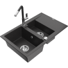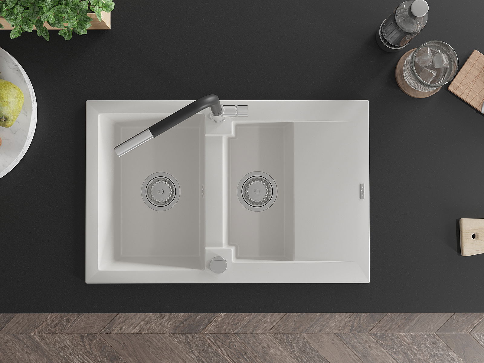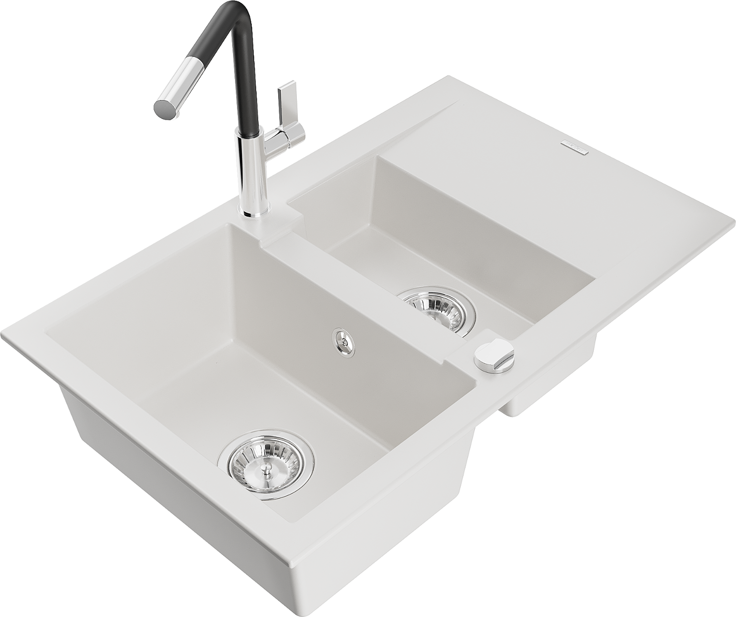 Mexen Gaspar granito plautuvė su 1,5 skyriais ir nusausinimo vieta bei virtuviniu maišytuvu Flora, balta - 6507-20-670401-07