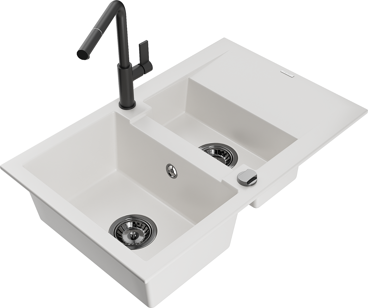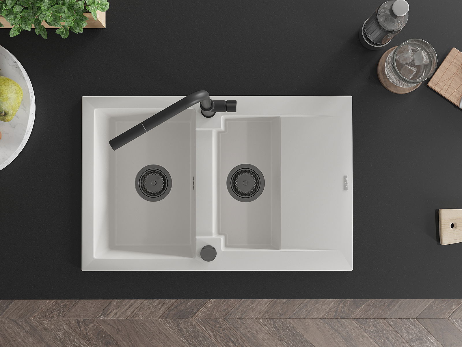 Mexen Gaspar granitinė plautuvė 1,5 skyrių su lašintuvu ir virtuviniu maišytuvu Flora, balta - 6507-20-670401-70-B