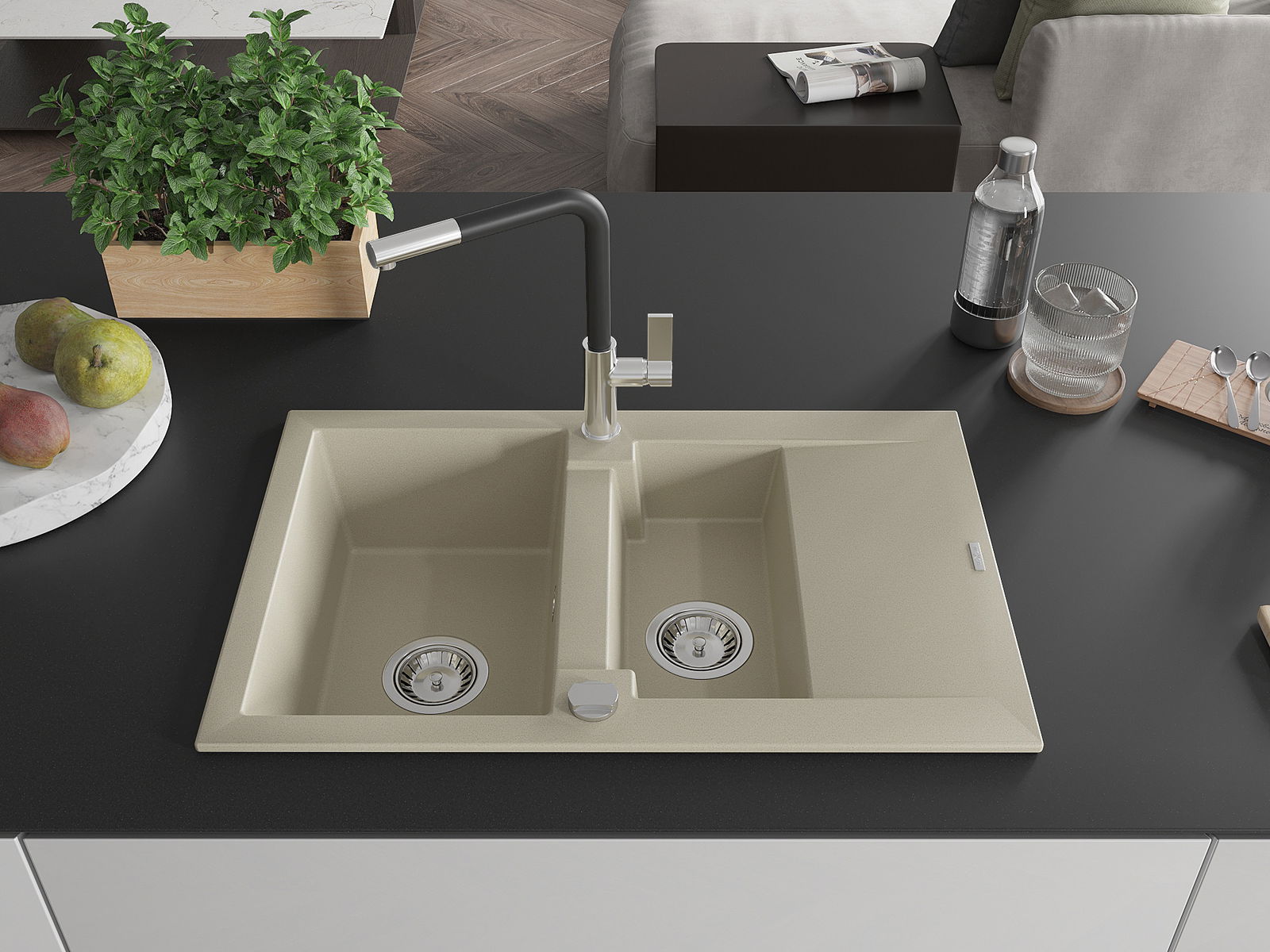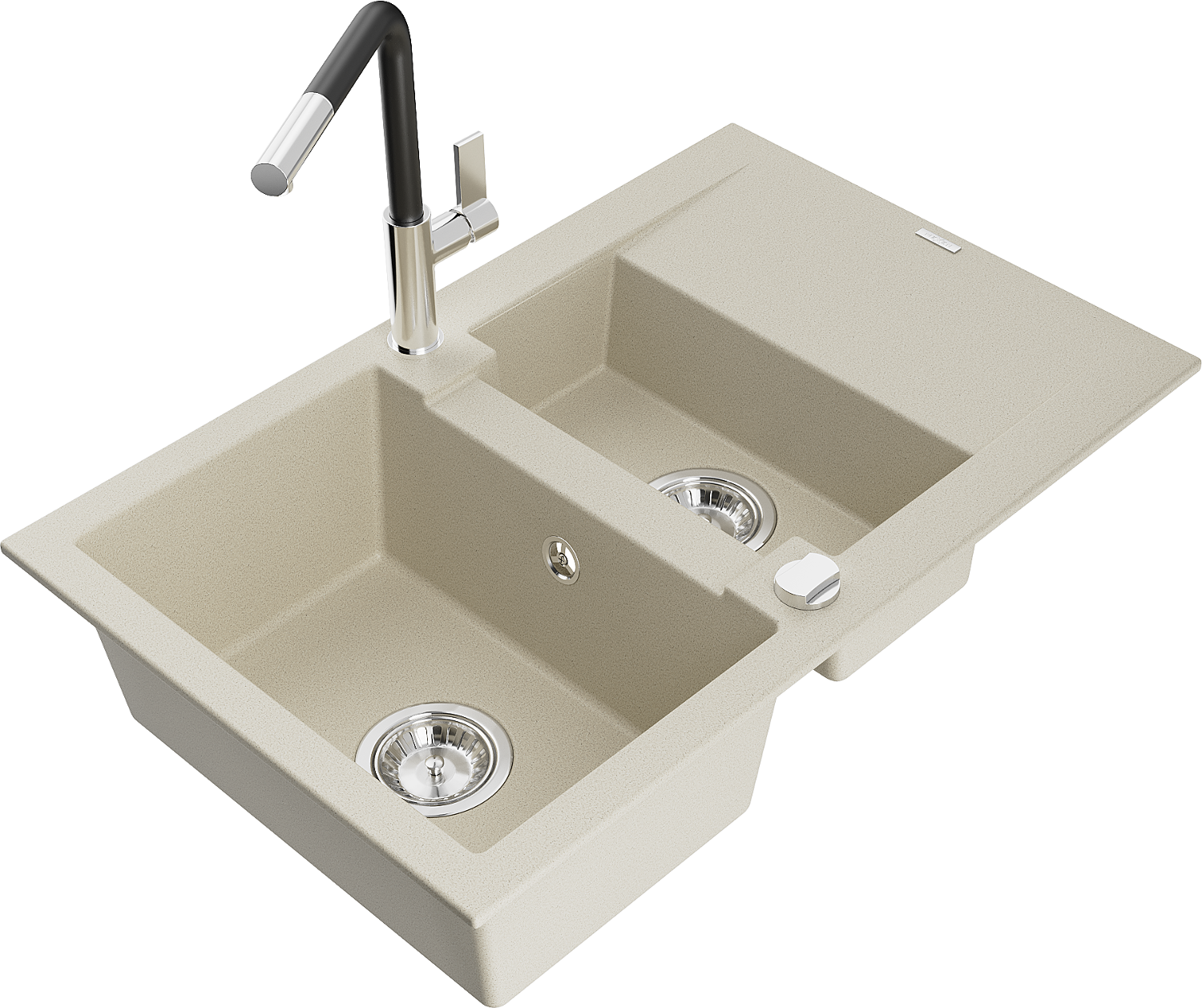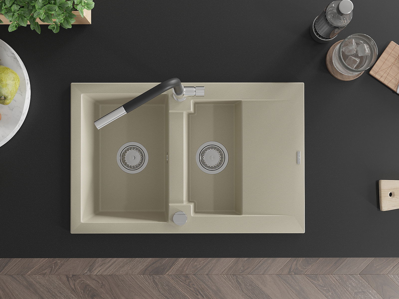 Mexen Gaspar granitinė 1,5 skylių kriauklė su nutekėjimu ir virtuviniu maišytuvu Flora, smėlio - 6507-69-670401-07