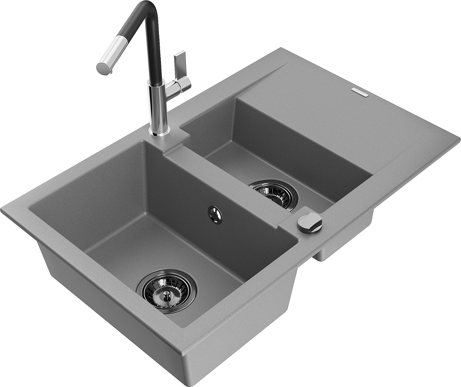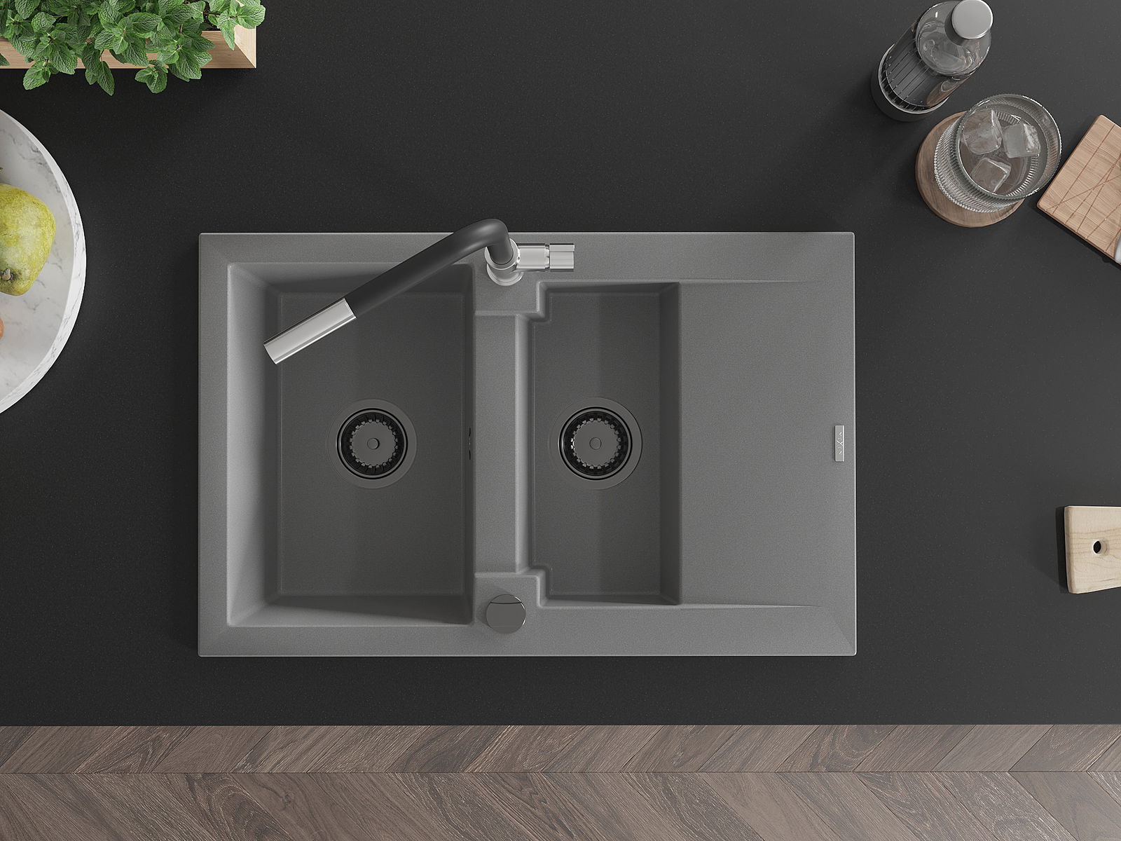 Mexen Gaspar granitinis 1,5 kamerų plautuvės su nutekamu ir virtuvės maišytuvu Flora, pilka - 6507-71-670401-07-B