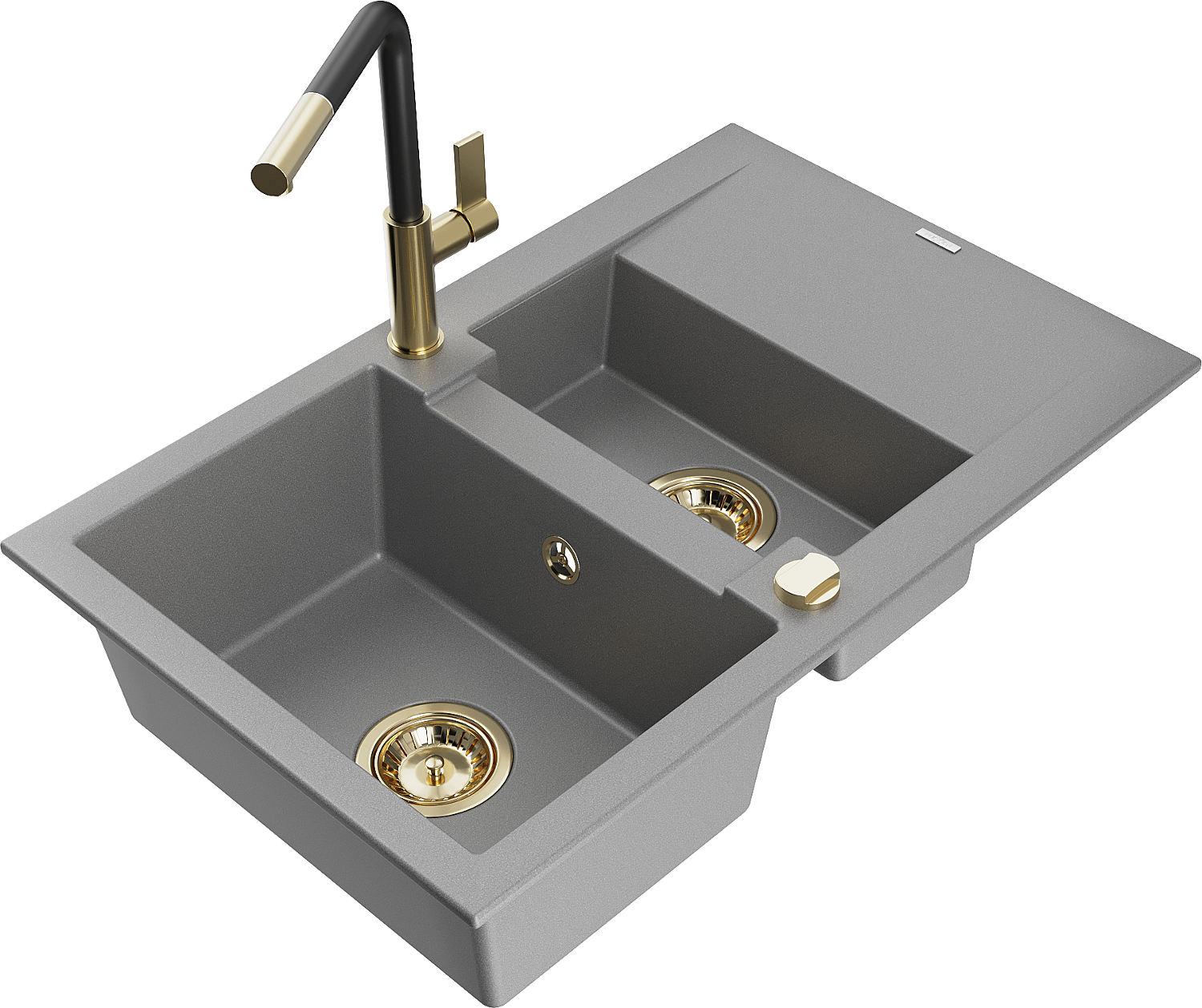 Mexen Gaspar granitinis virtuvės kriauklė 1,5 skylių su nusausintuvu ir virtuvės maišytuvu Flora, pilka - 6507-71-670401-57-G